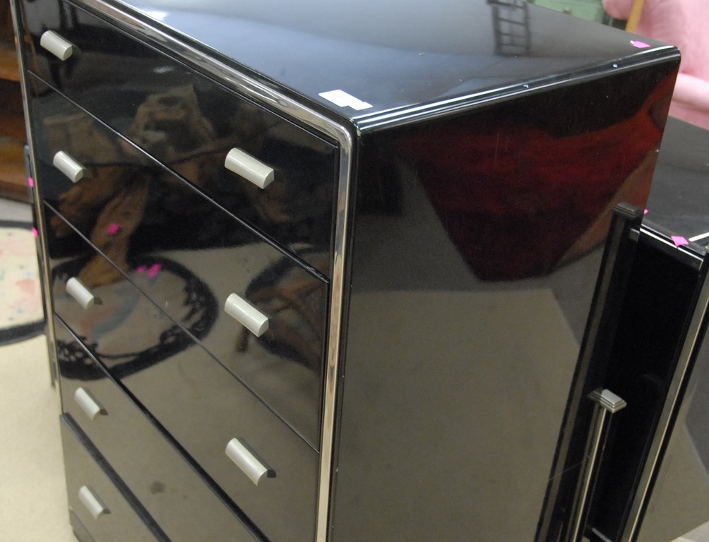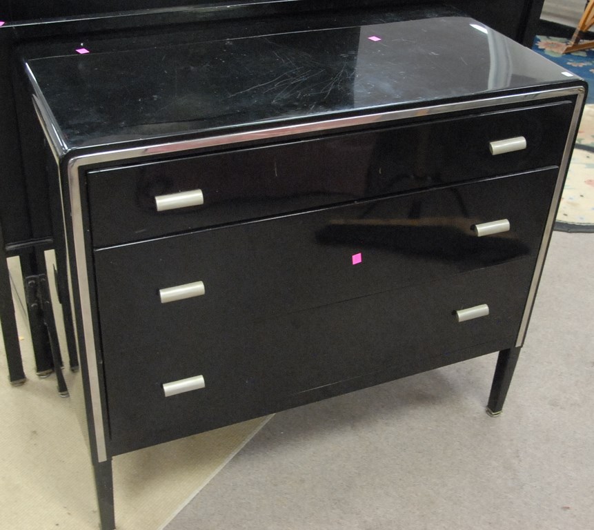 Lot 81: Norman Bel Geddes for Simmons Furniture four piece black metal and chrome bedroom set to include tall chest, stand, long chest, and …