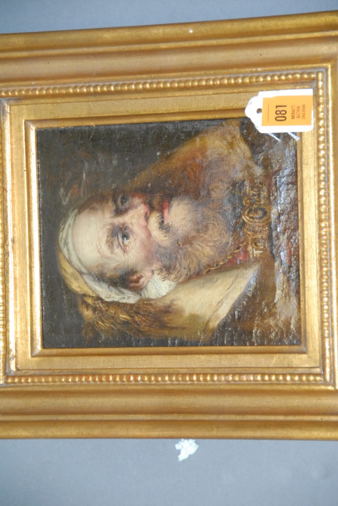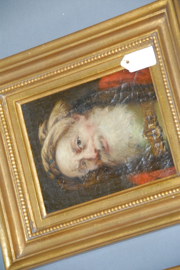 Pair of European oil on burlap paintings, bust of bearded men, unsigned.