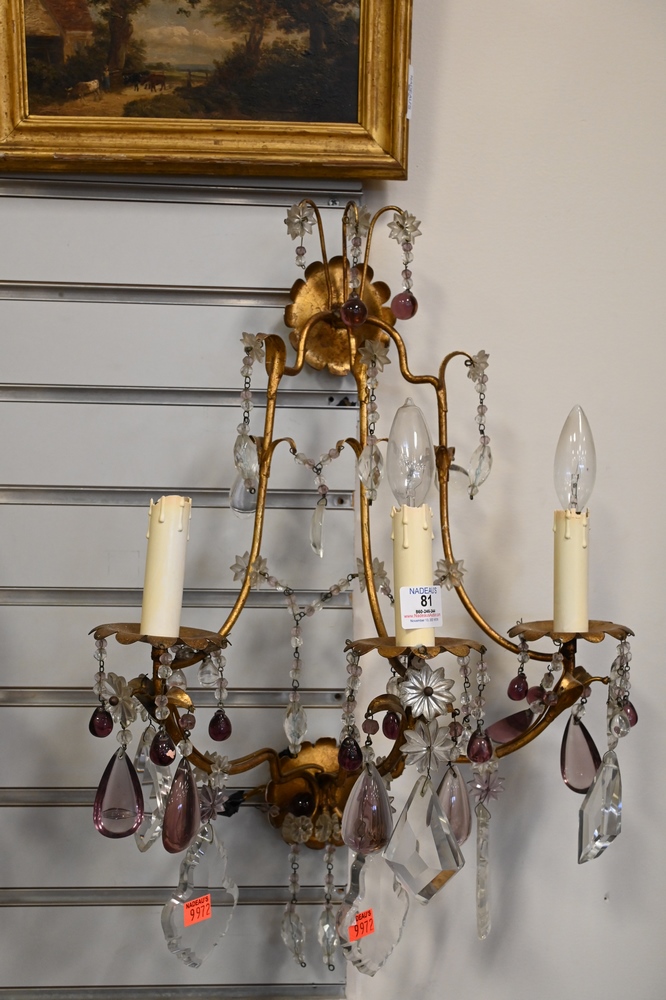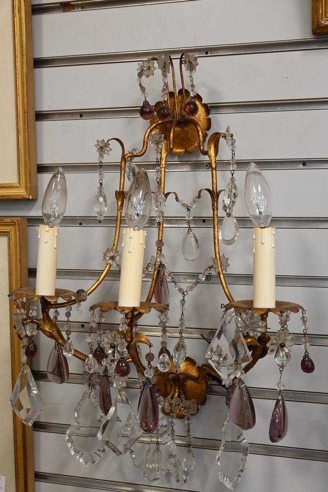 Lot 81: Pair of French Three Light Sconces, each having clear and amethyst glass drops, height 19 1/2 inches.