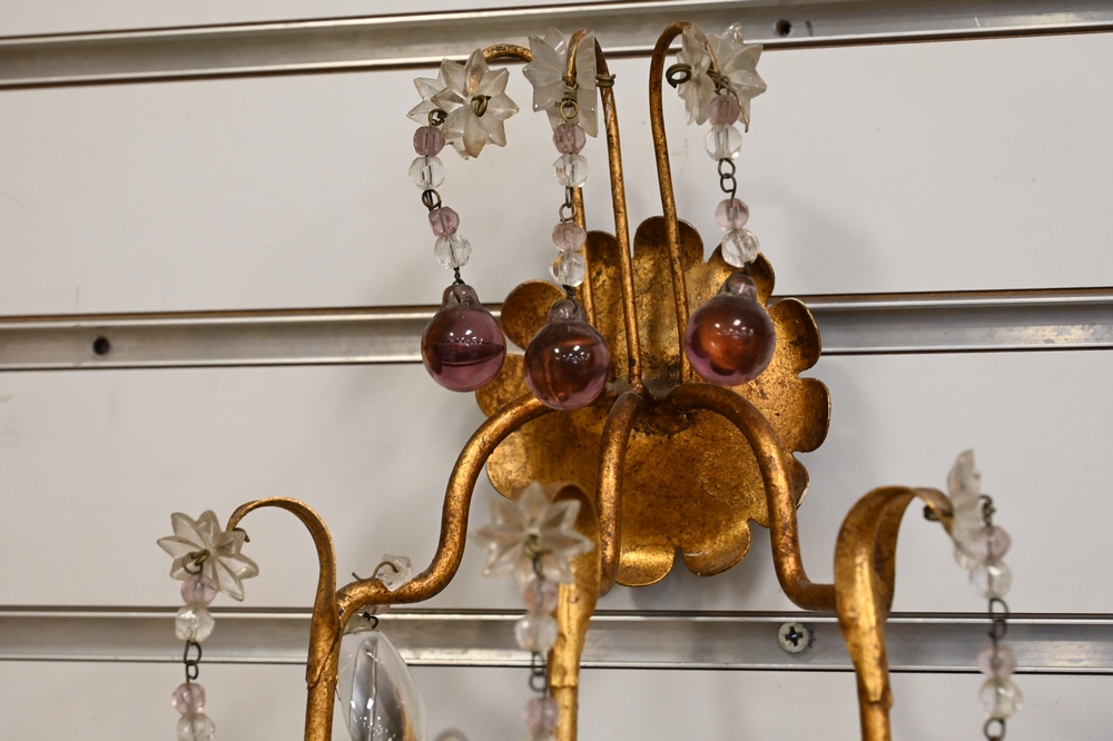 Pair of French Three Light Sconces, each having clear and amethyst glass drops, height 19 1/2 inches.