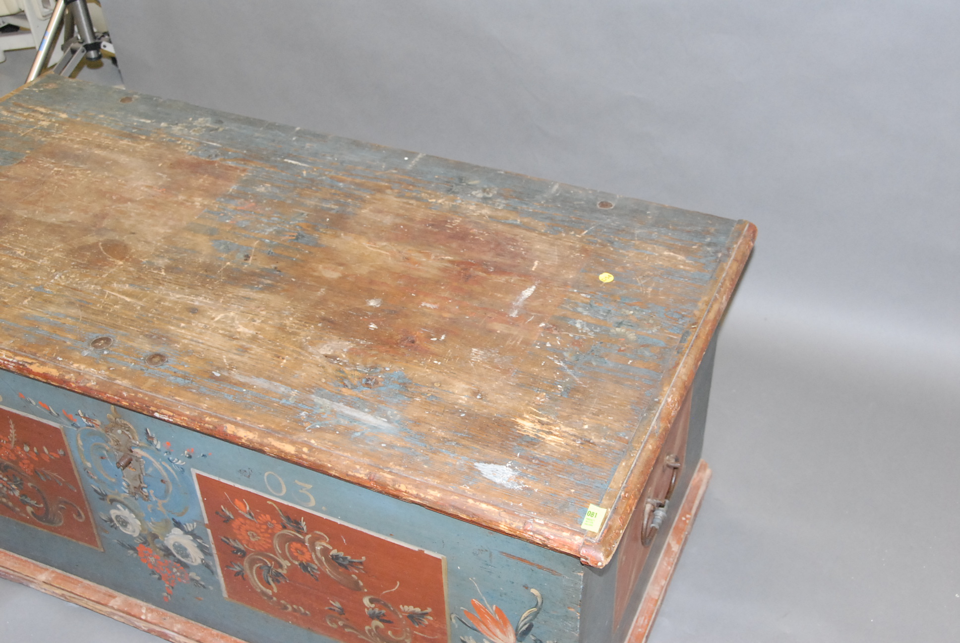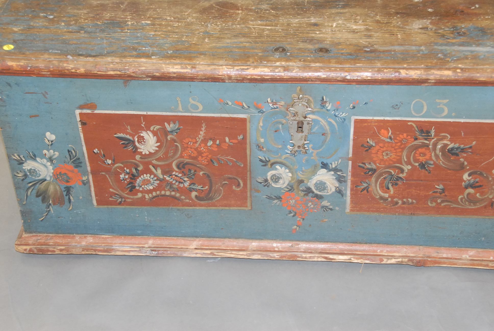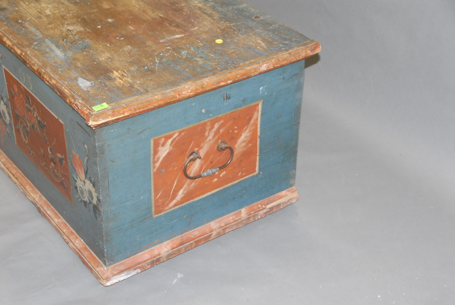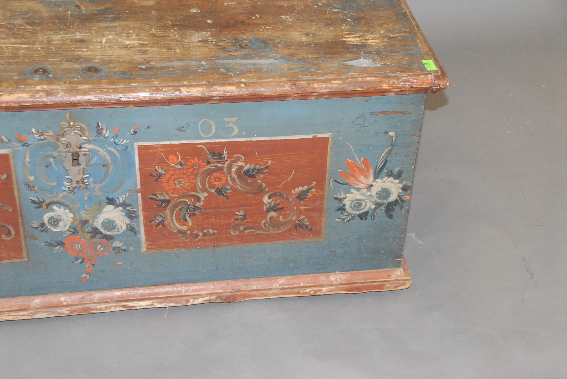 Primitive lift top blanket chest with panel and floral paint decorated front.