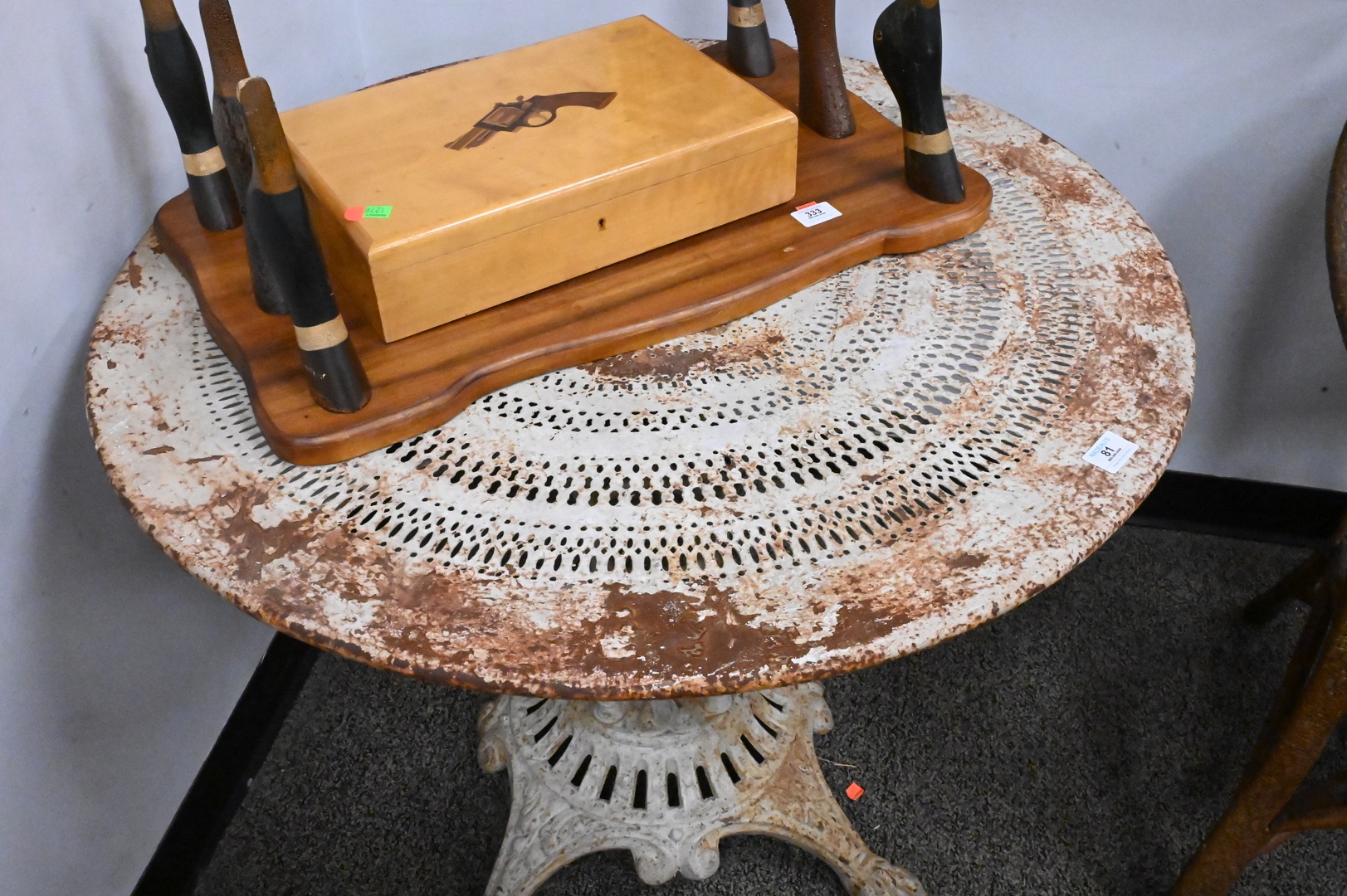 Round Outdoor Metal Cocktail Table, having pierced top and paw feet on iron base, height 28 inches, diameter 35 1/2 inches. Provenance: Estate of Peter Tillou, Litchfield, Connecticut.