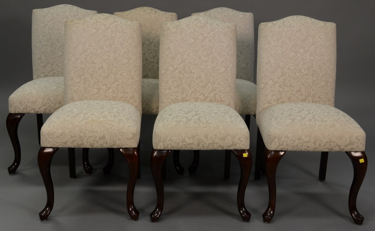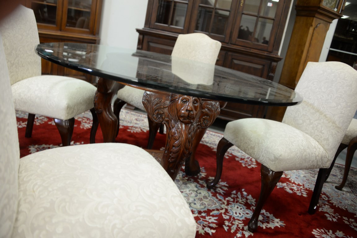 Lot 81: Seven piece dining set including glass top table with carved mahogany base and six upholstered Queen Anne style side chairs. table:…