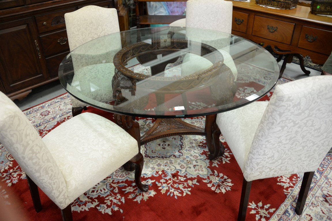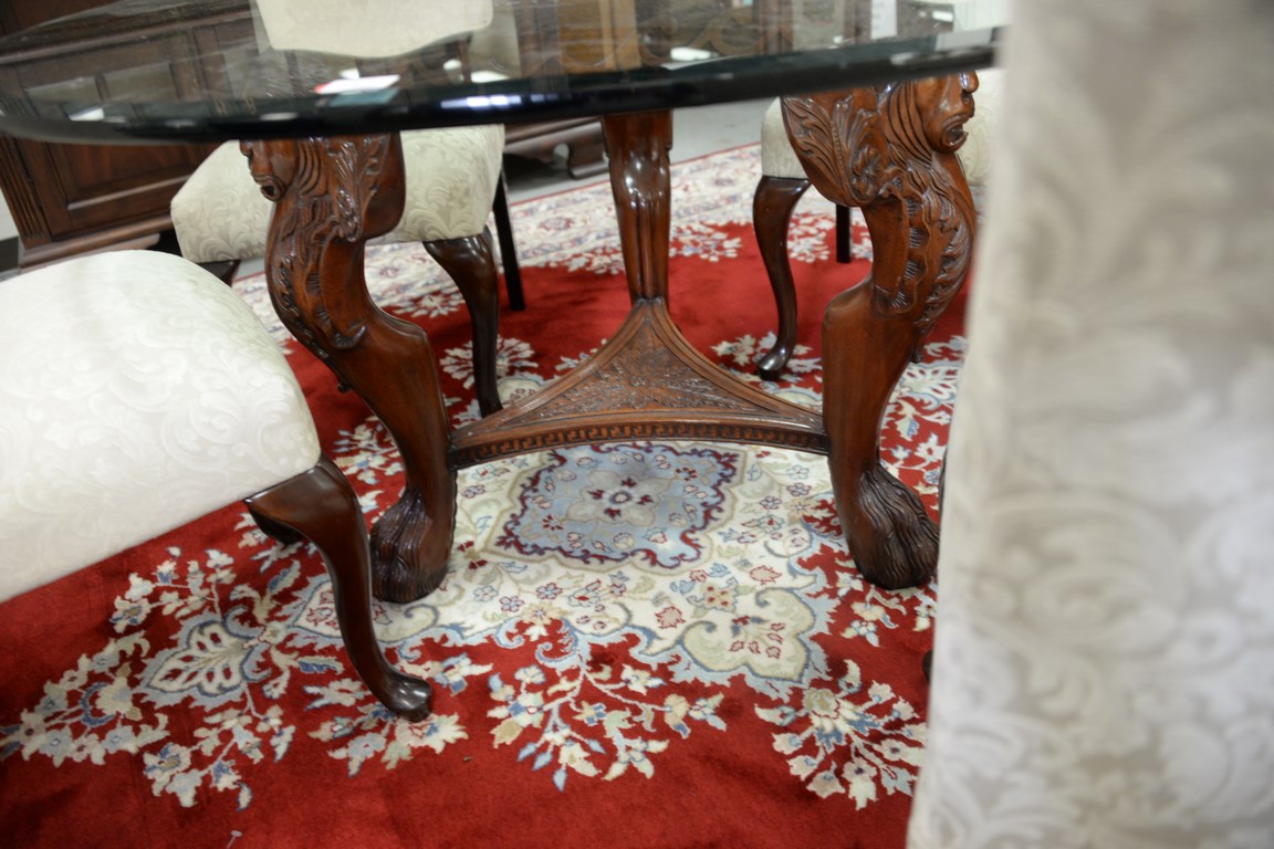 Seven piece dining set including glass top table with carved mahogany base and six upholstered Queen Anne style side chairs. table: ht. 29 1/2 in. dia. 54 in.