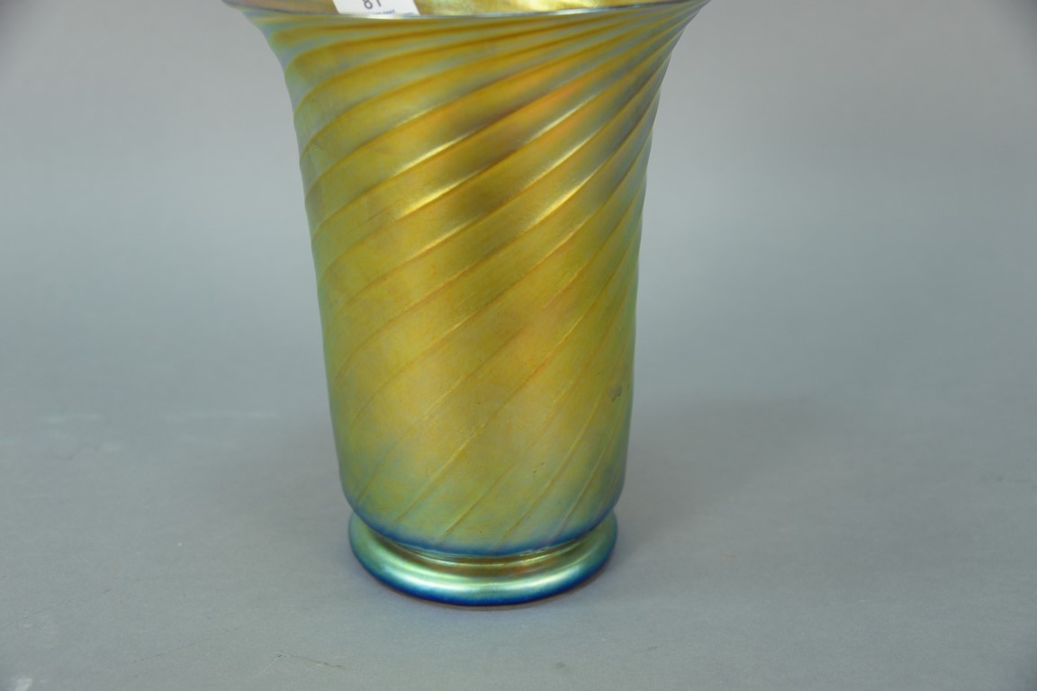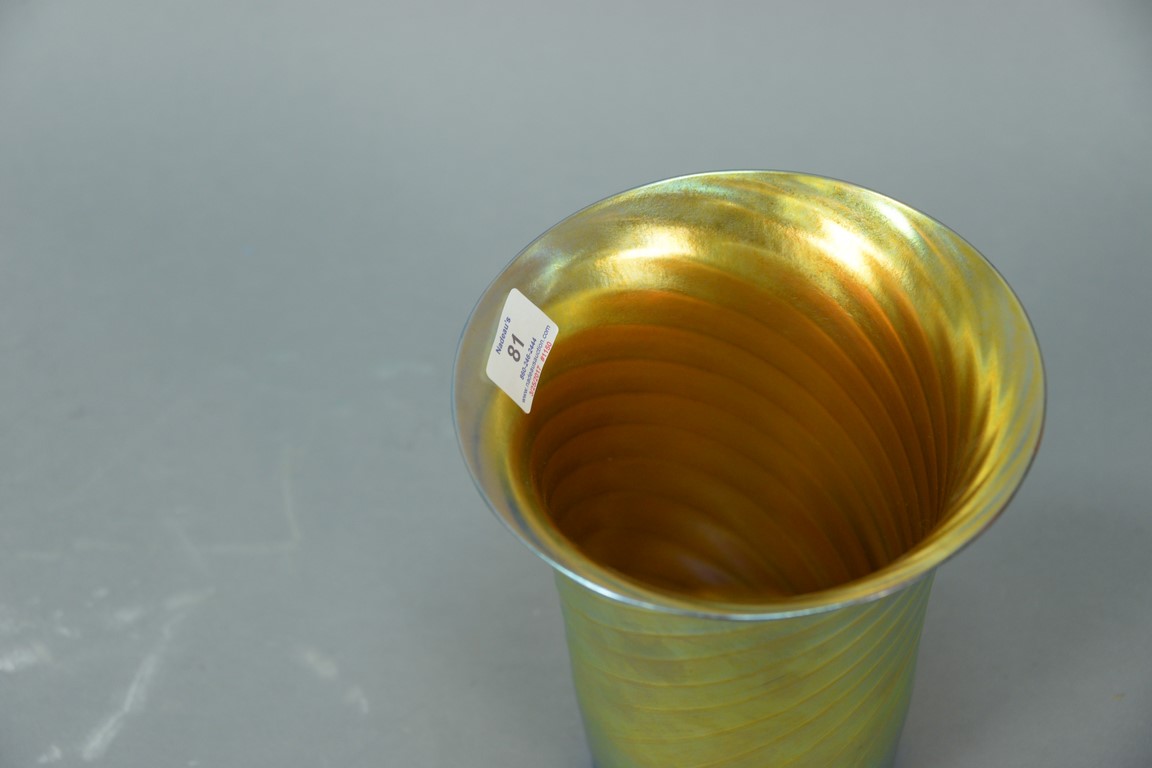 Lot 81: Steuben art glass vase with flared rim and swirled body on plain round base, signed Steuben Aurene. height 9 3/4 inches