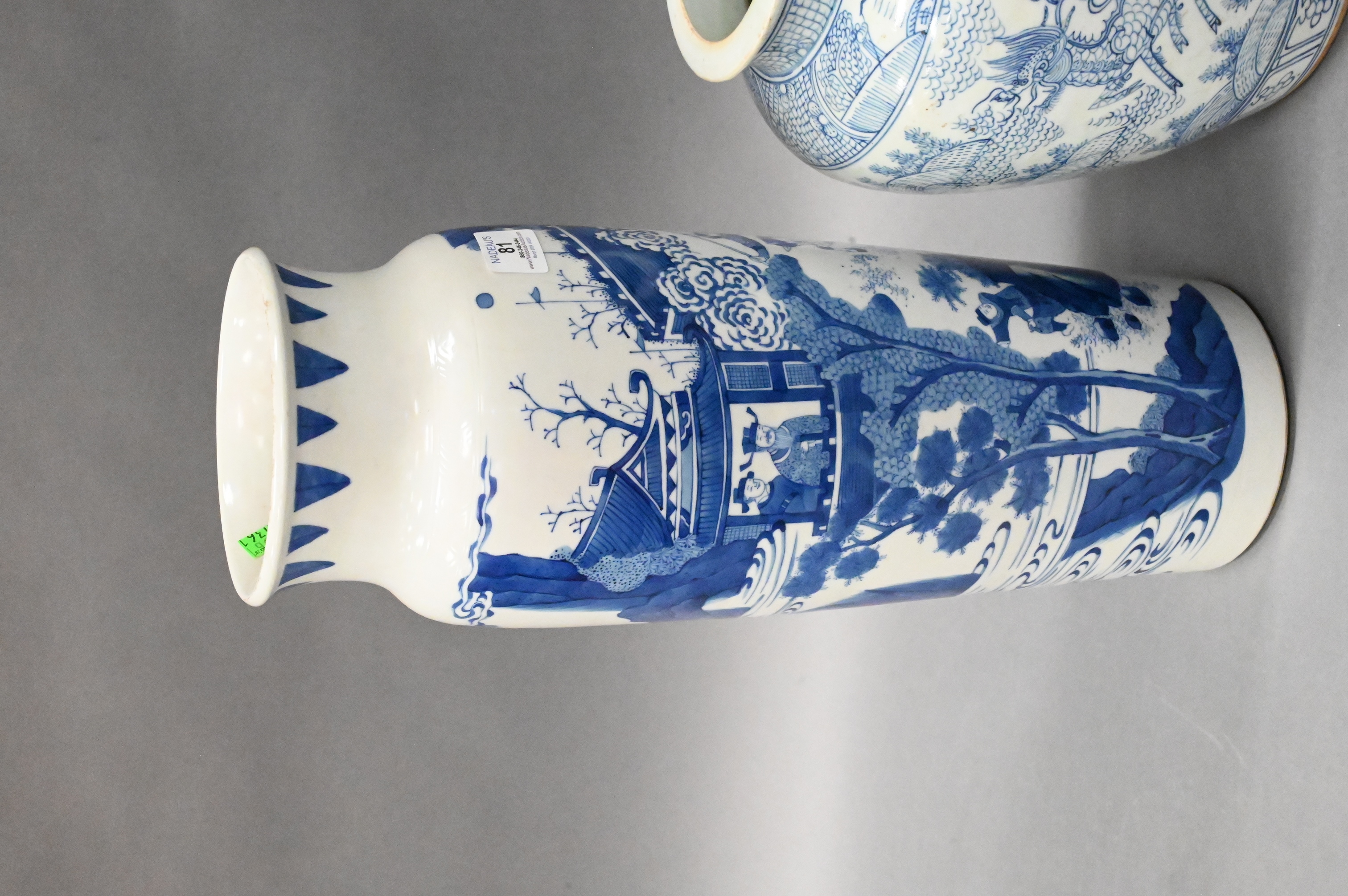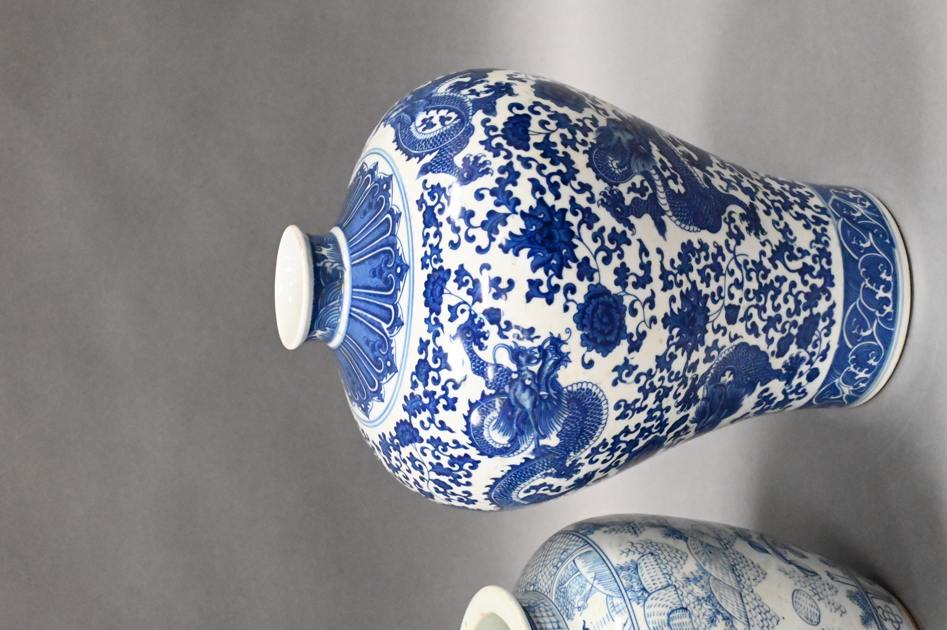 to include one jar having dragon and agricultural motif, one sleeve form vase having battle motif, one Meiping style vase having dragon motif having character marks on base