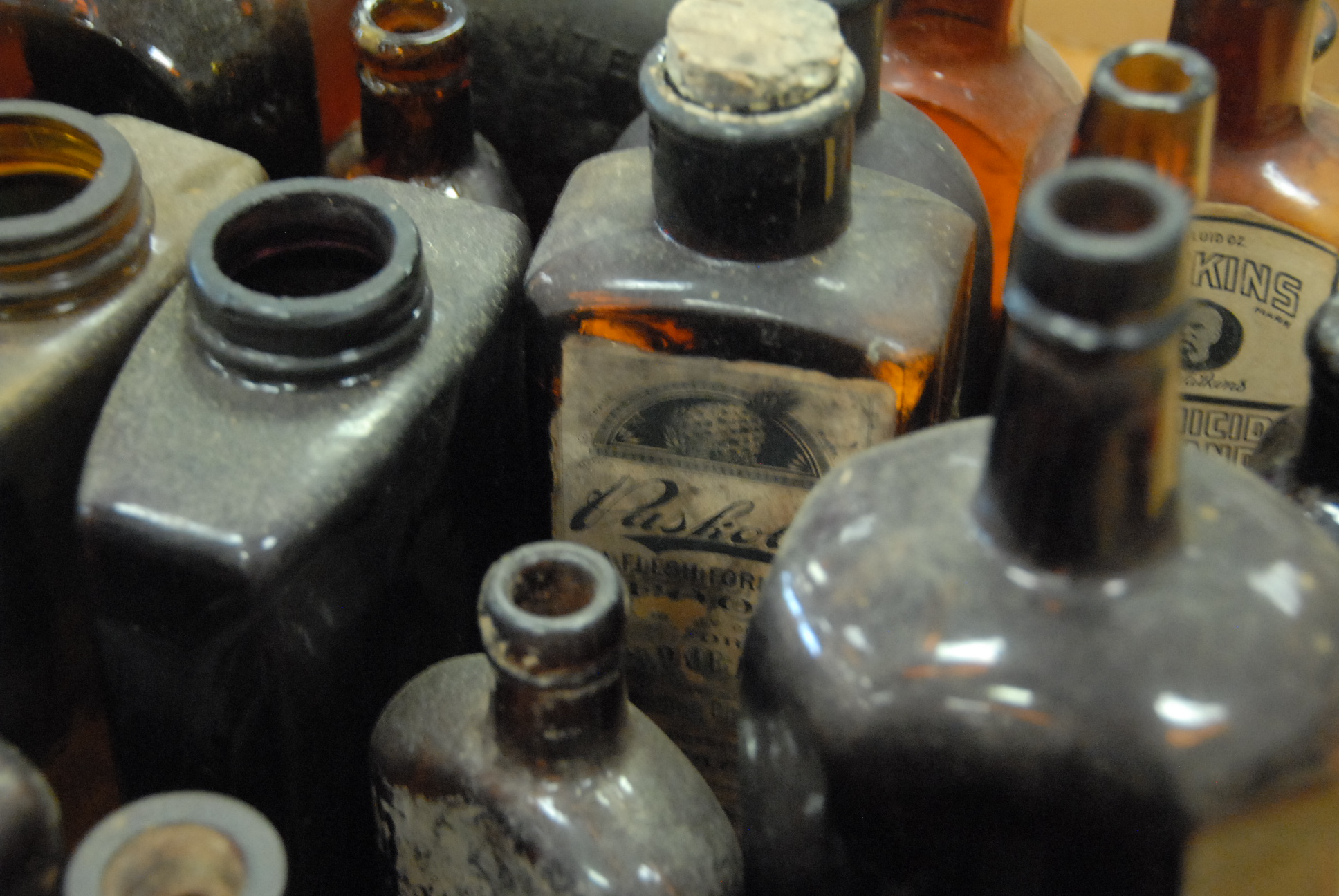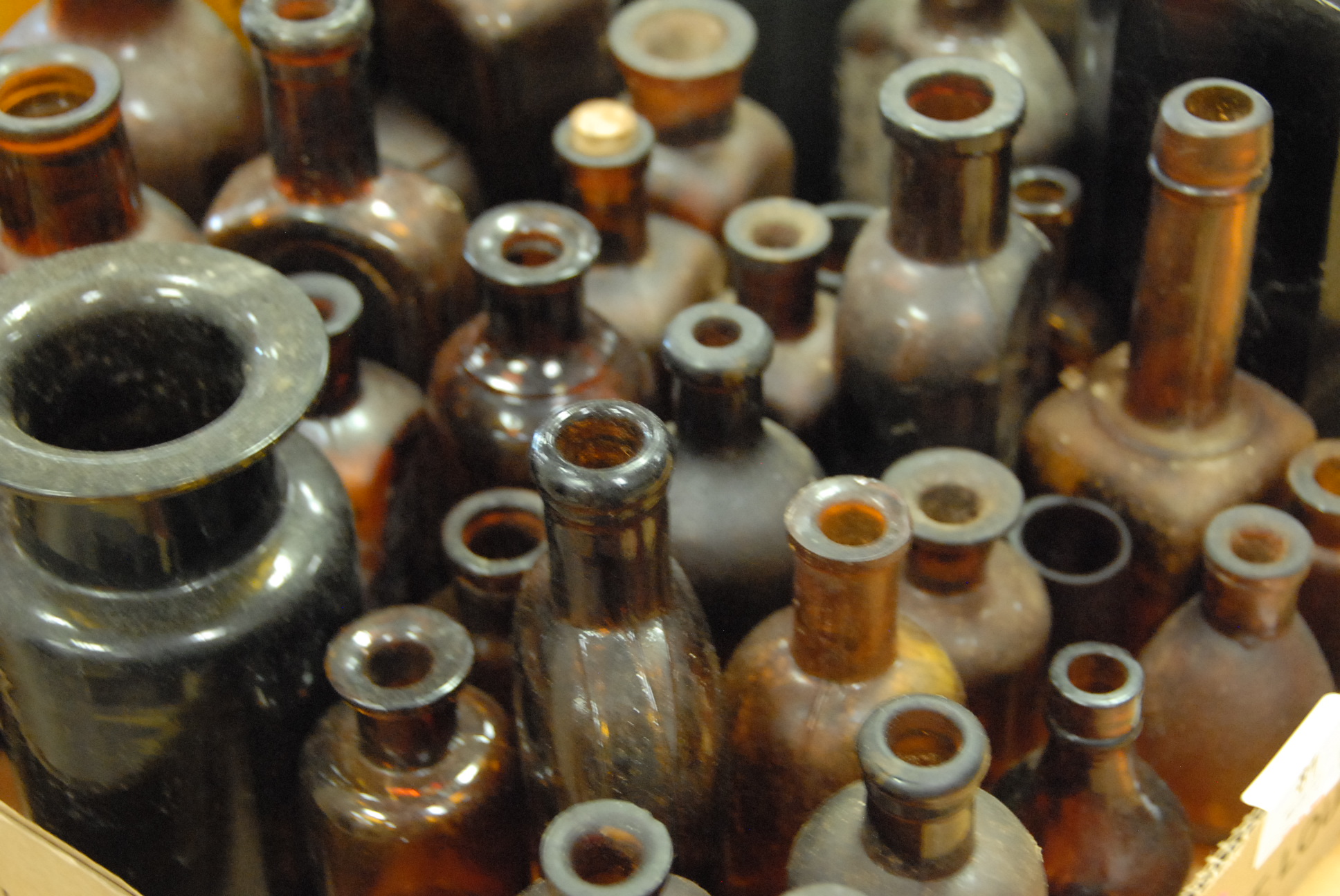 Two boxes of brown blown glass bottles, mostly medicinal bottles, some liquor.