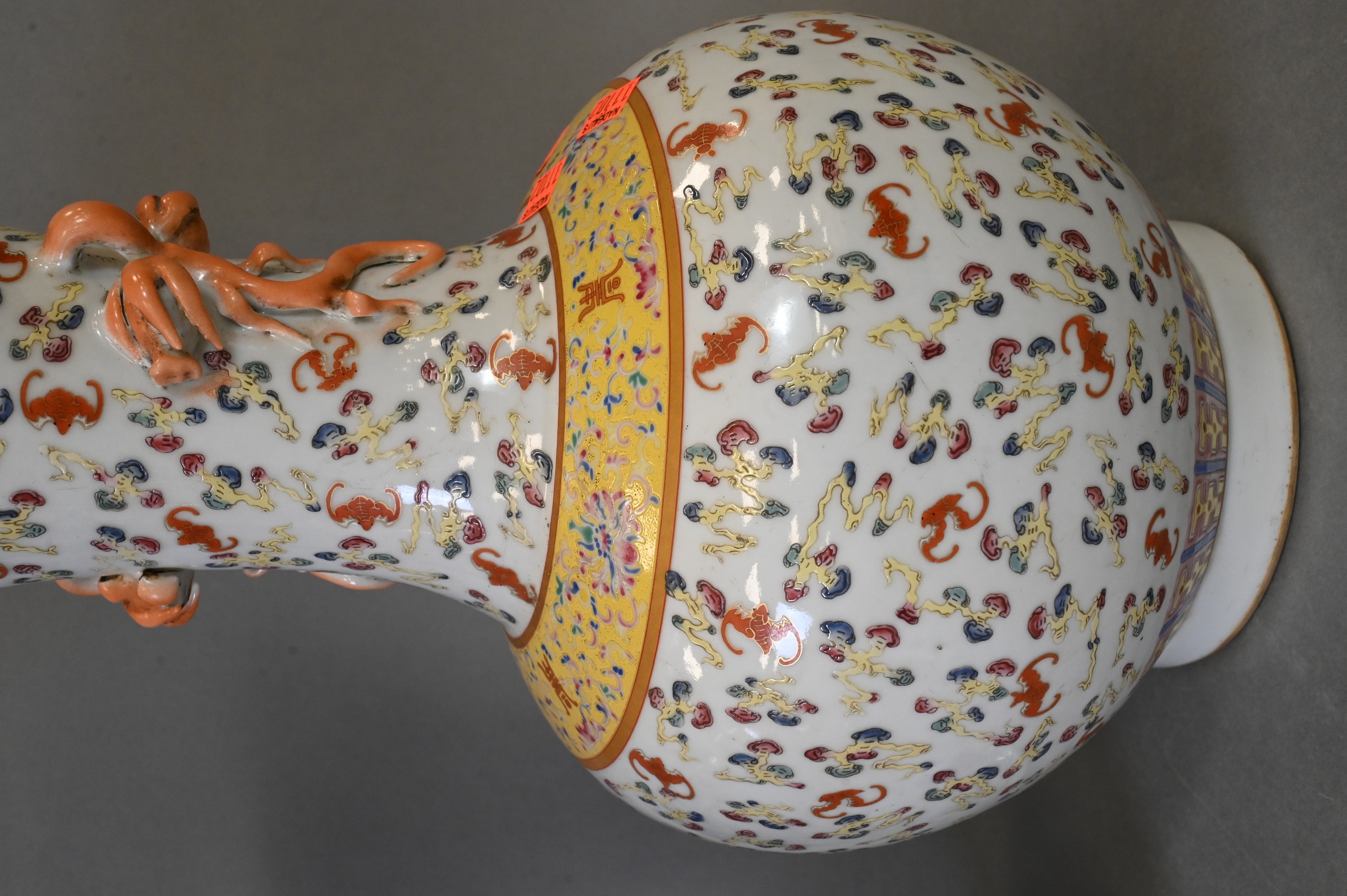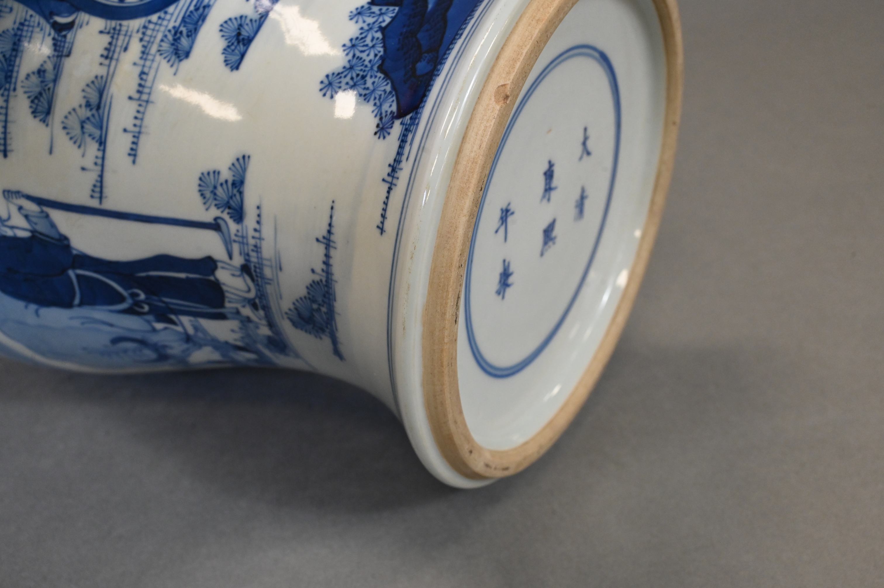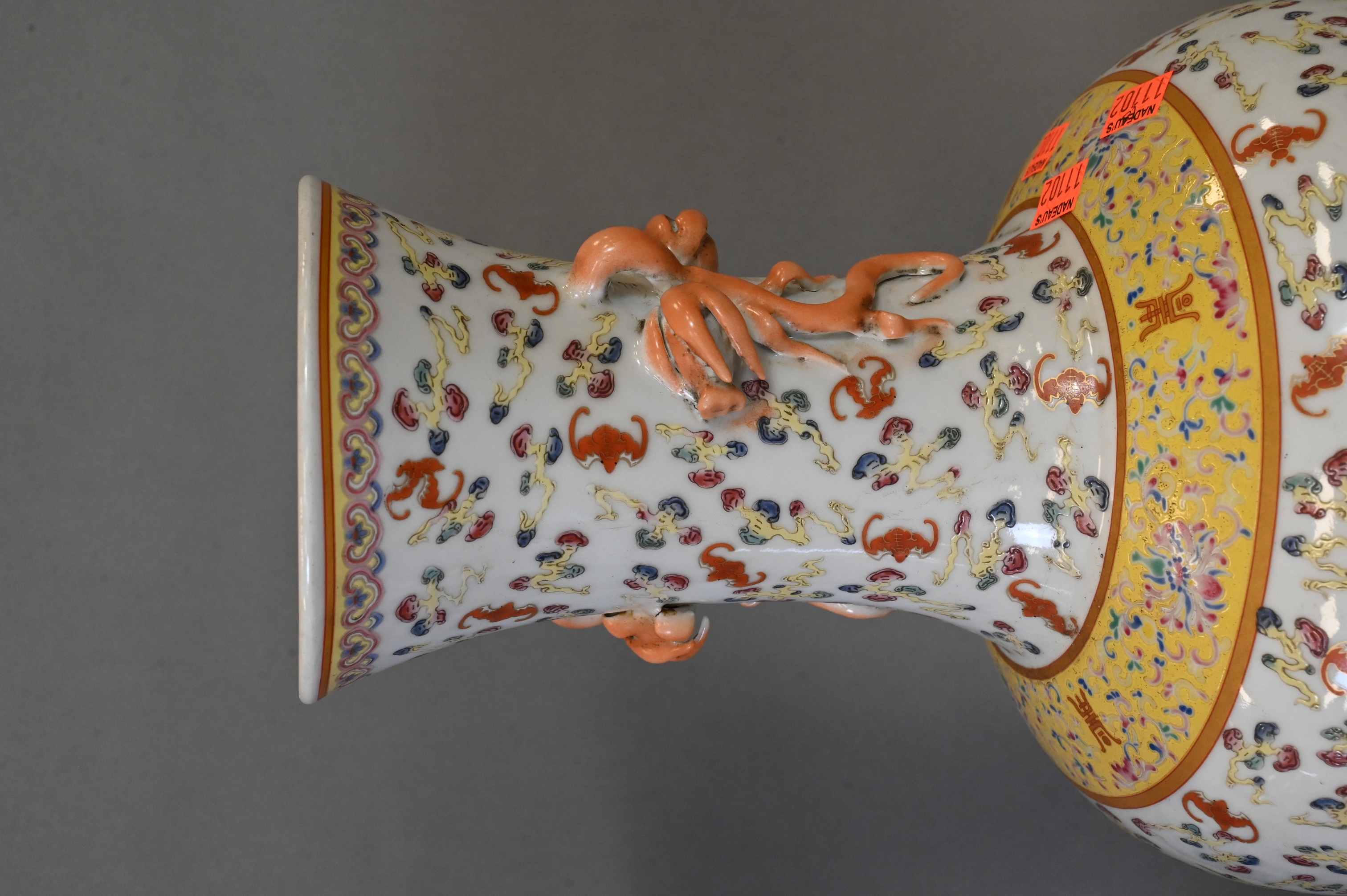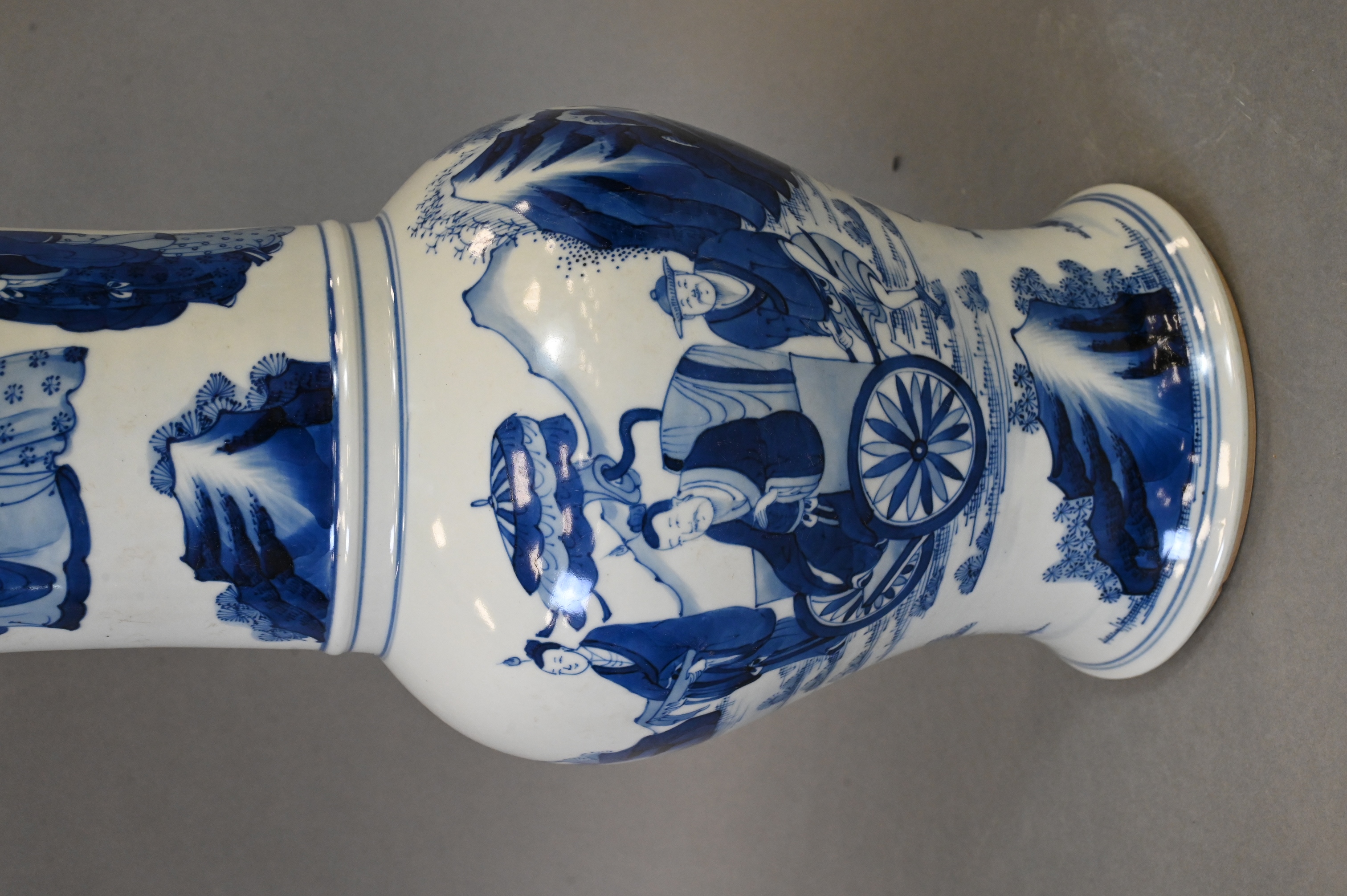 one blue and white Gu form vase having scholars, geishas and warriors in a landscape, height 18 3/4 inches along with family rose vase having bat motif with yellow enamel band and raised double handles, height 17 inches