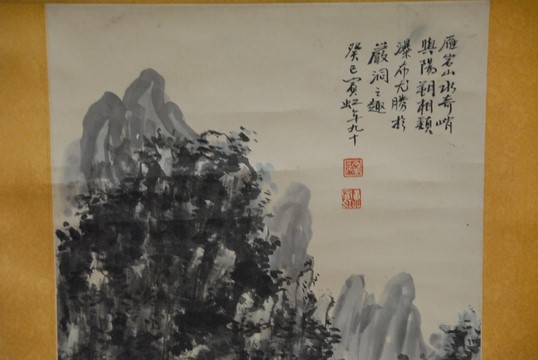 Two piece lot to include Oriental mountainous landscape scroll, 40 x 20 and Oriental peach scroll, 45 x 13.