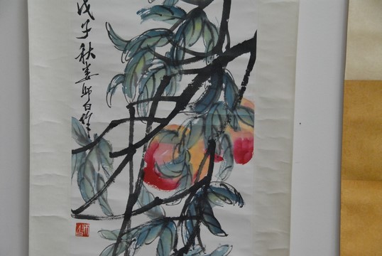 Lot 81: Two piece lot to include Oriental mountainous landscape scroll, 40 x 20 and Oriental peach scroll, 45 x 13.