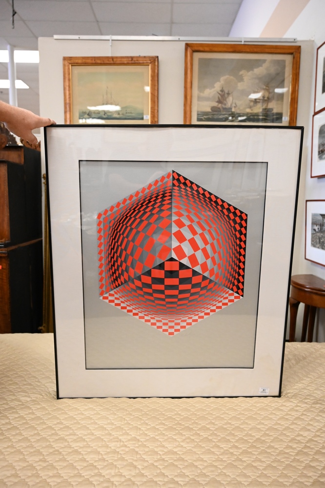 Lot 81: Victor Vasarely (French, 1906 – 1997), serigraph in colors on paper, “Mertan”, pencil signed and numbered 19/250 in the lower right, matting with water damage, 29″ x 24″.