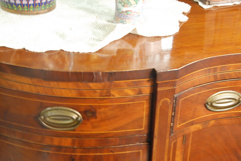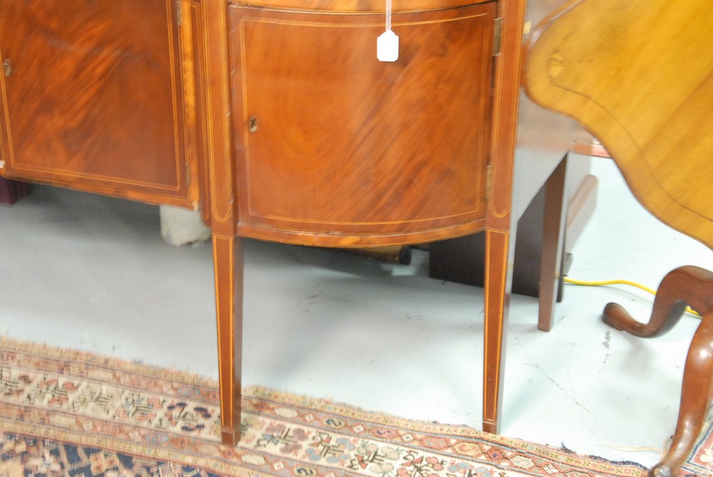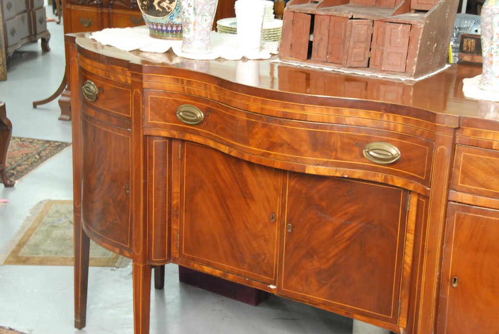 Federal mahogany sideboard with serpentine shaped top over conforming case having three drawers over four doors all set on square tapered legs with line inlays, circa 1790 slightly low. ht. 40 1/2in. lg. 72in. dp. 26 1/2in.