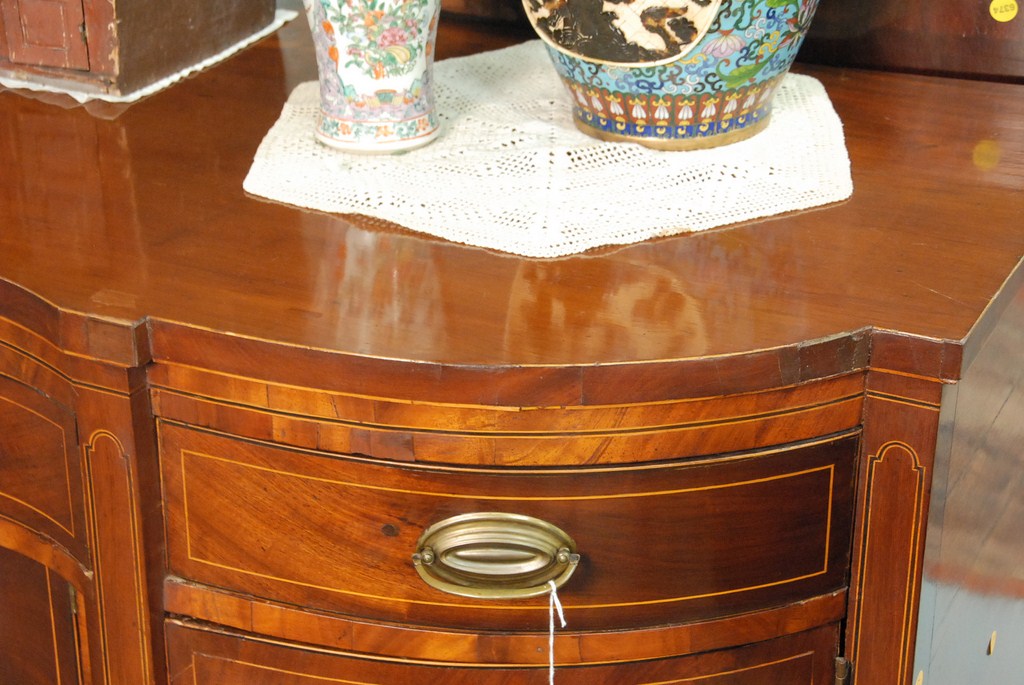 Lot 811: Federal mahogany sideboard with serpentine shaped top over conforming case having three drawers over four doors all set on square ta…