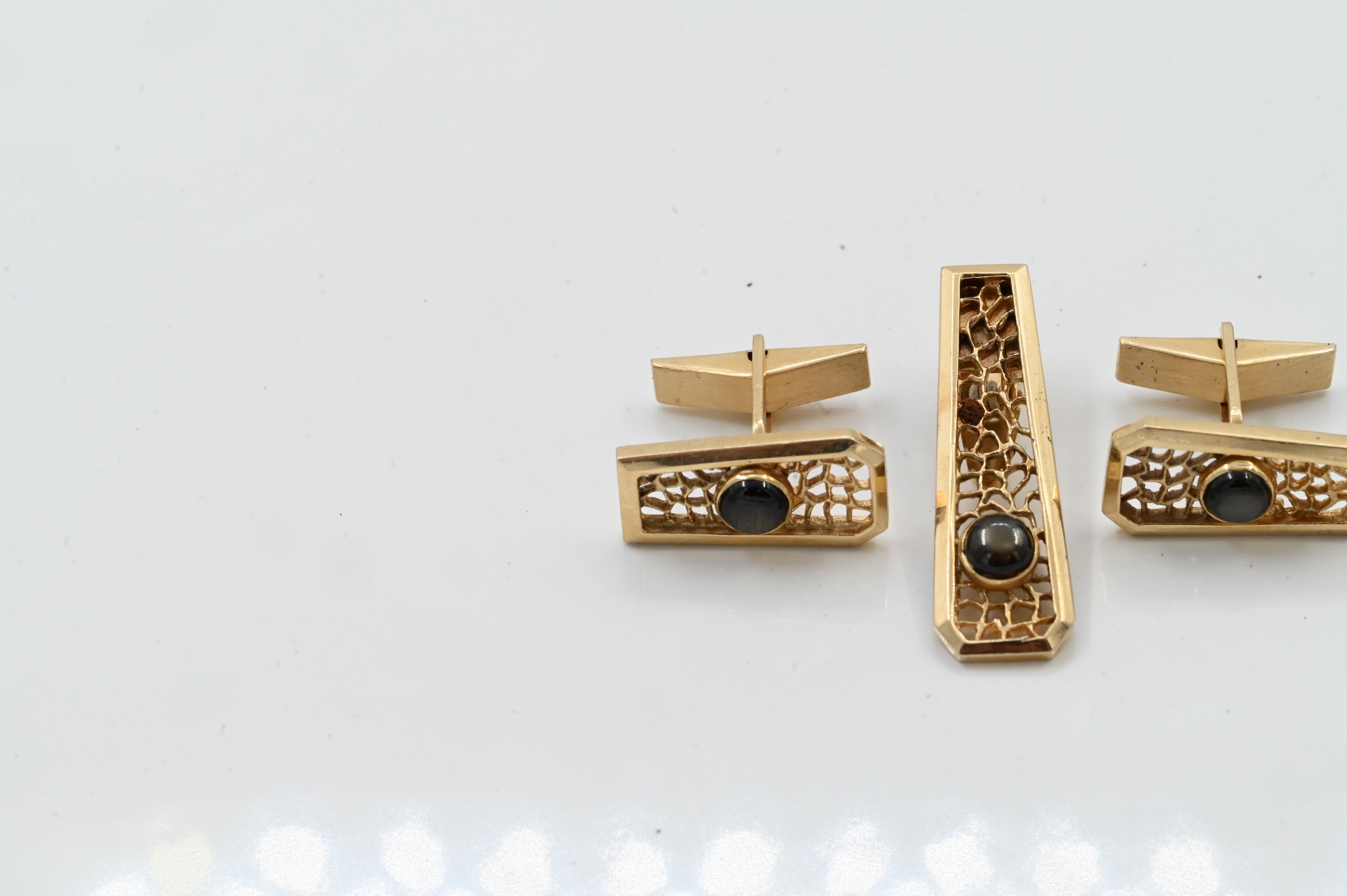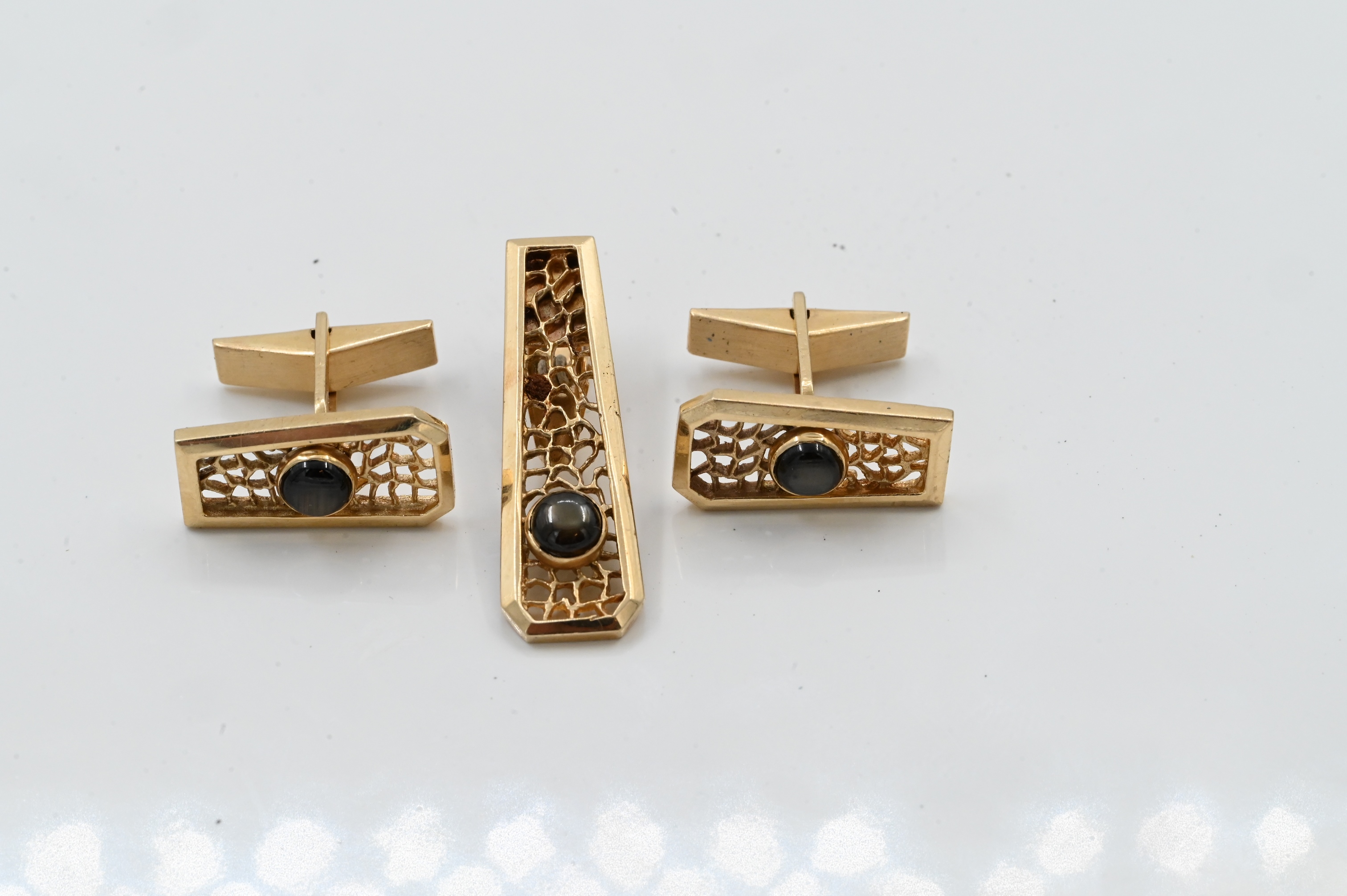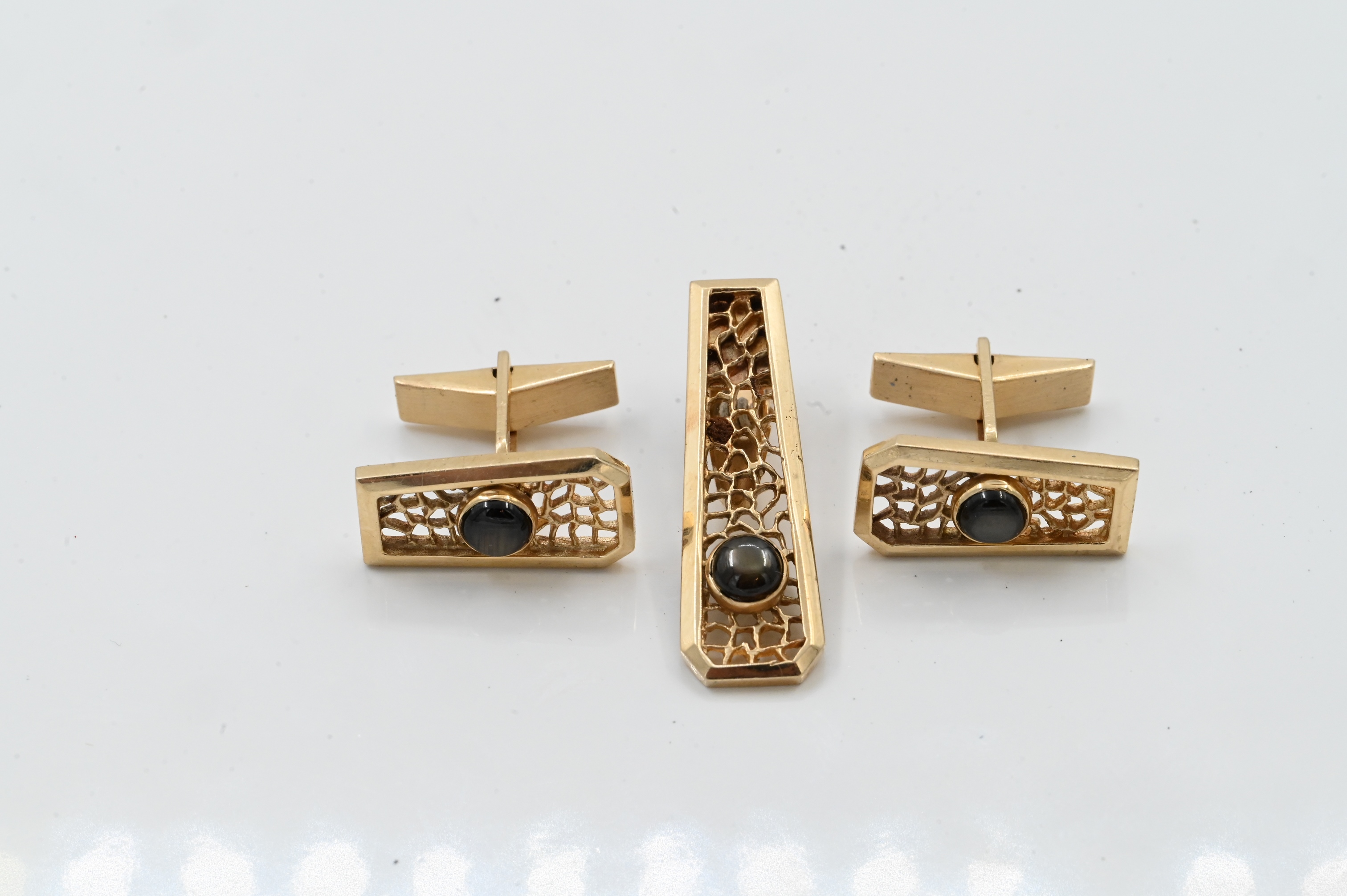 14K Gold and Tiger Eye Cufflinks and Tie Clip