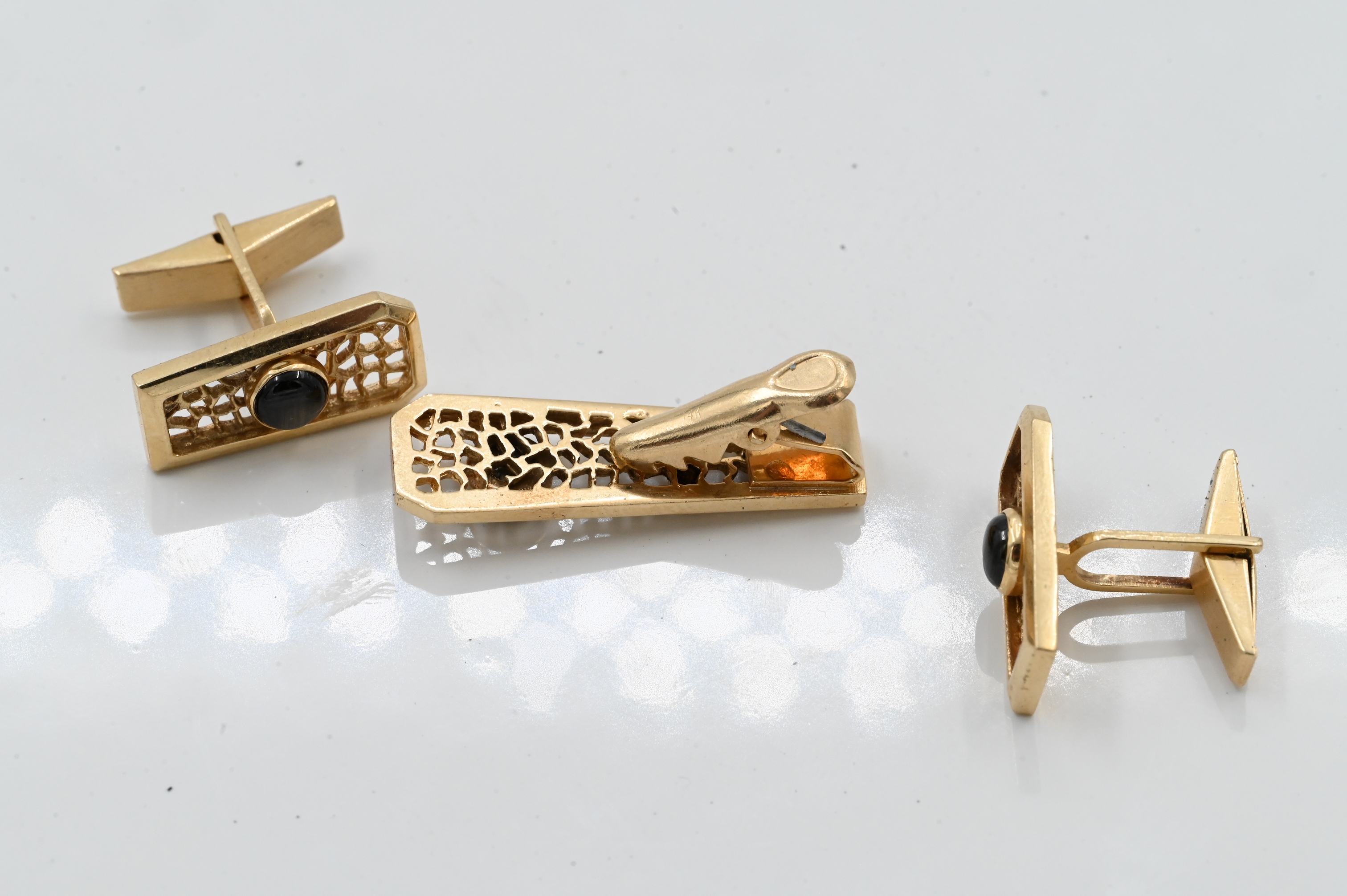 Lot 82: 14K Gold and Tiger Eye Cufflinks and Tie Clip