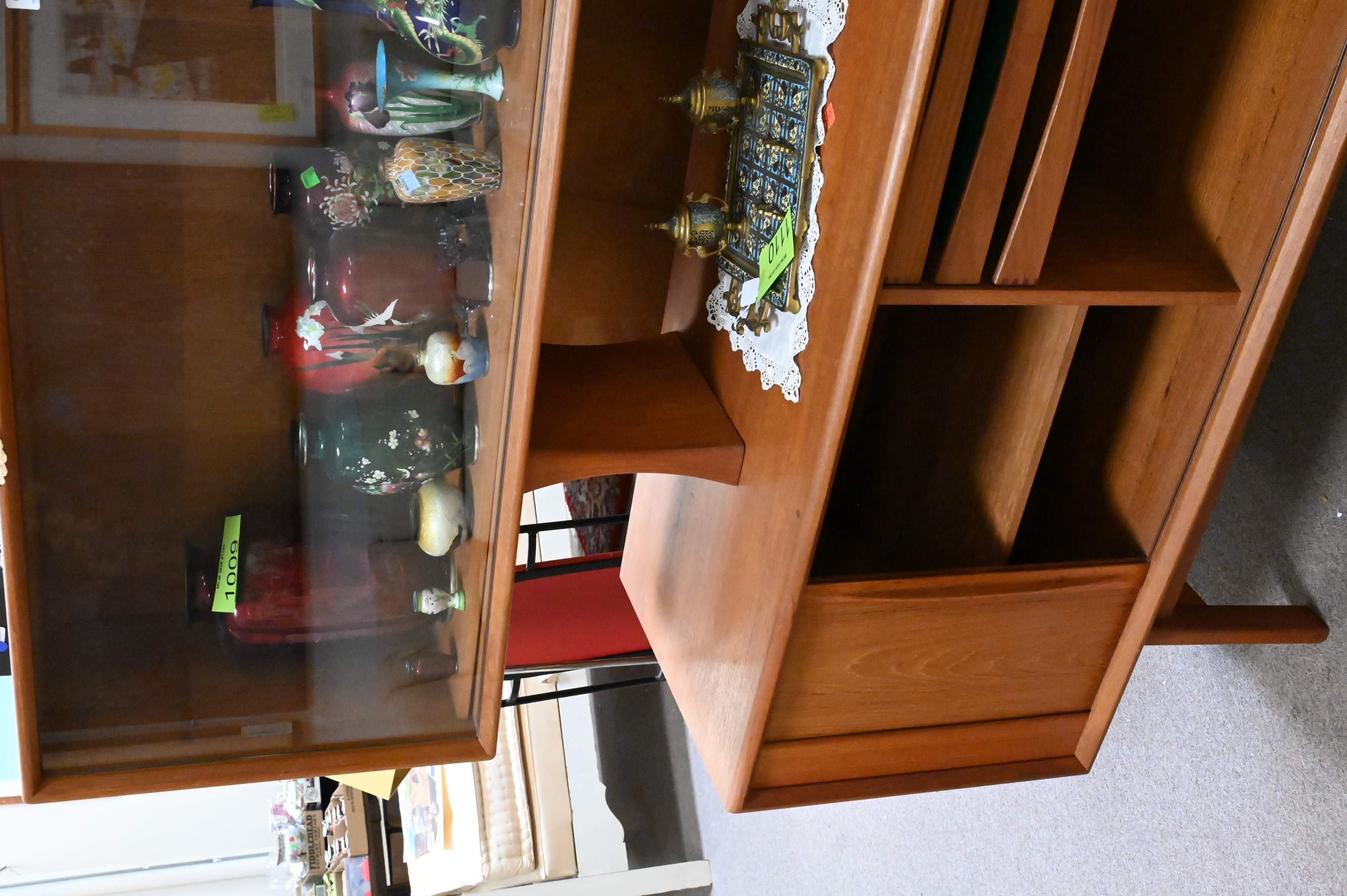 in two parts, having top with glass doors set on base having tambour door opening to shelving and small bank of three drawers