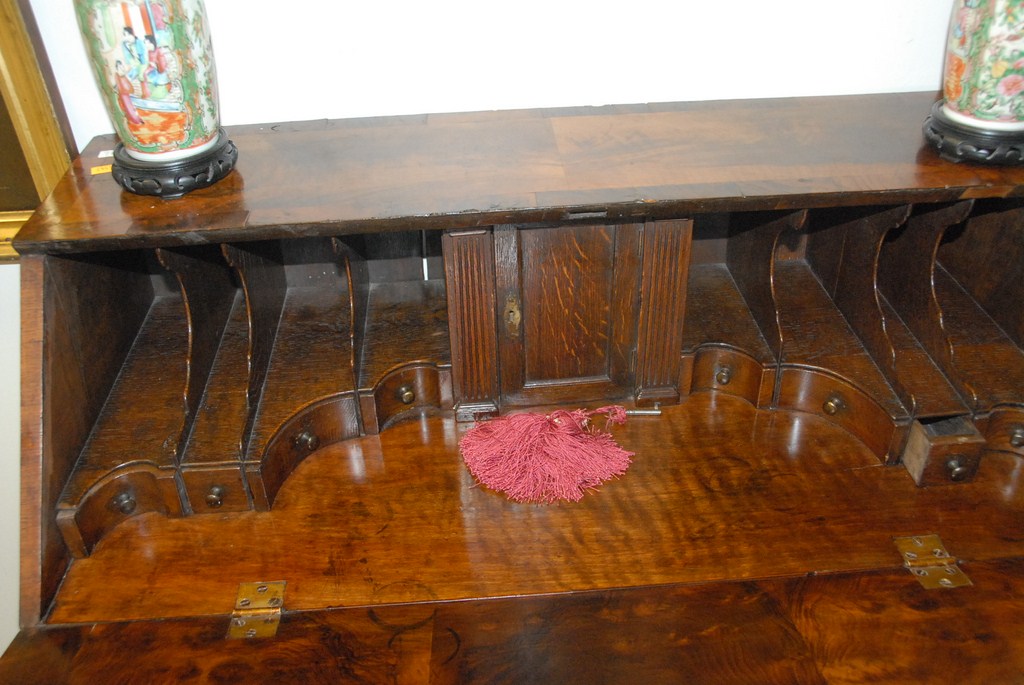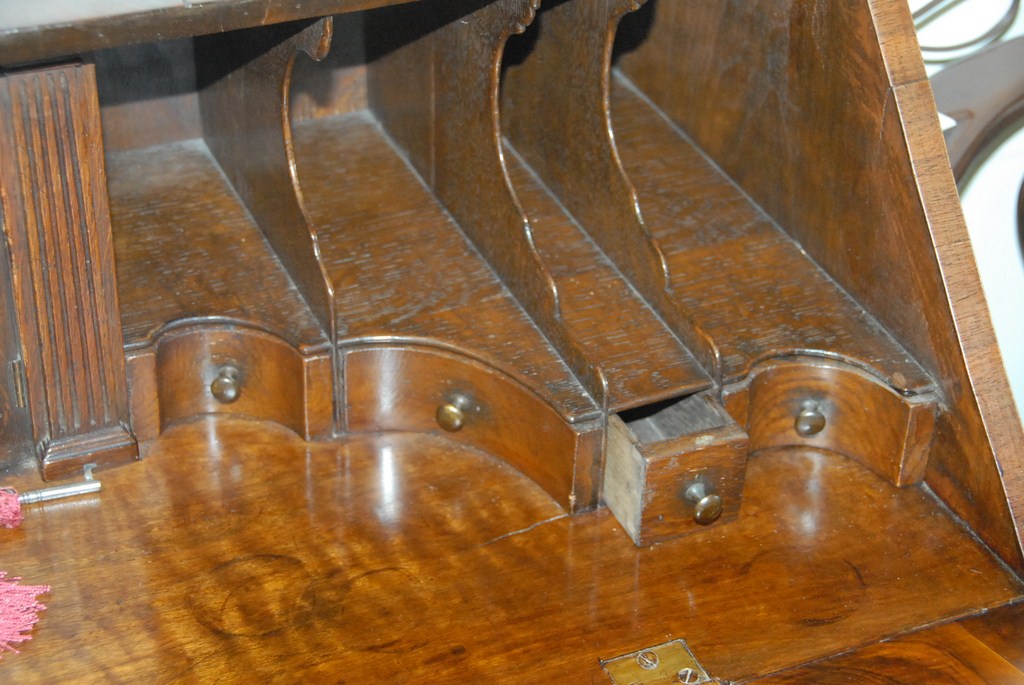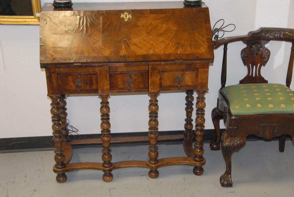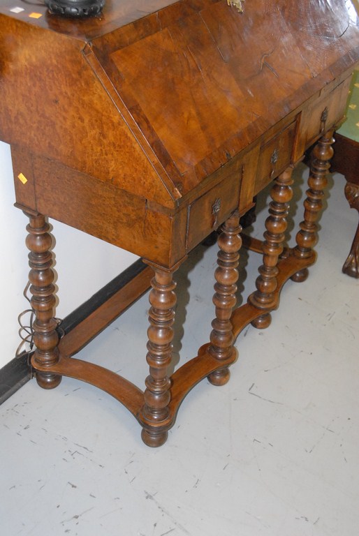 Lot 82: Burlwood Queen Anne style drop front desk on turned legs with stretcher base.
