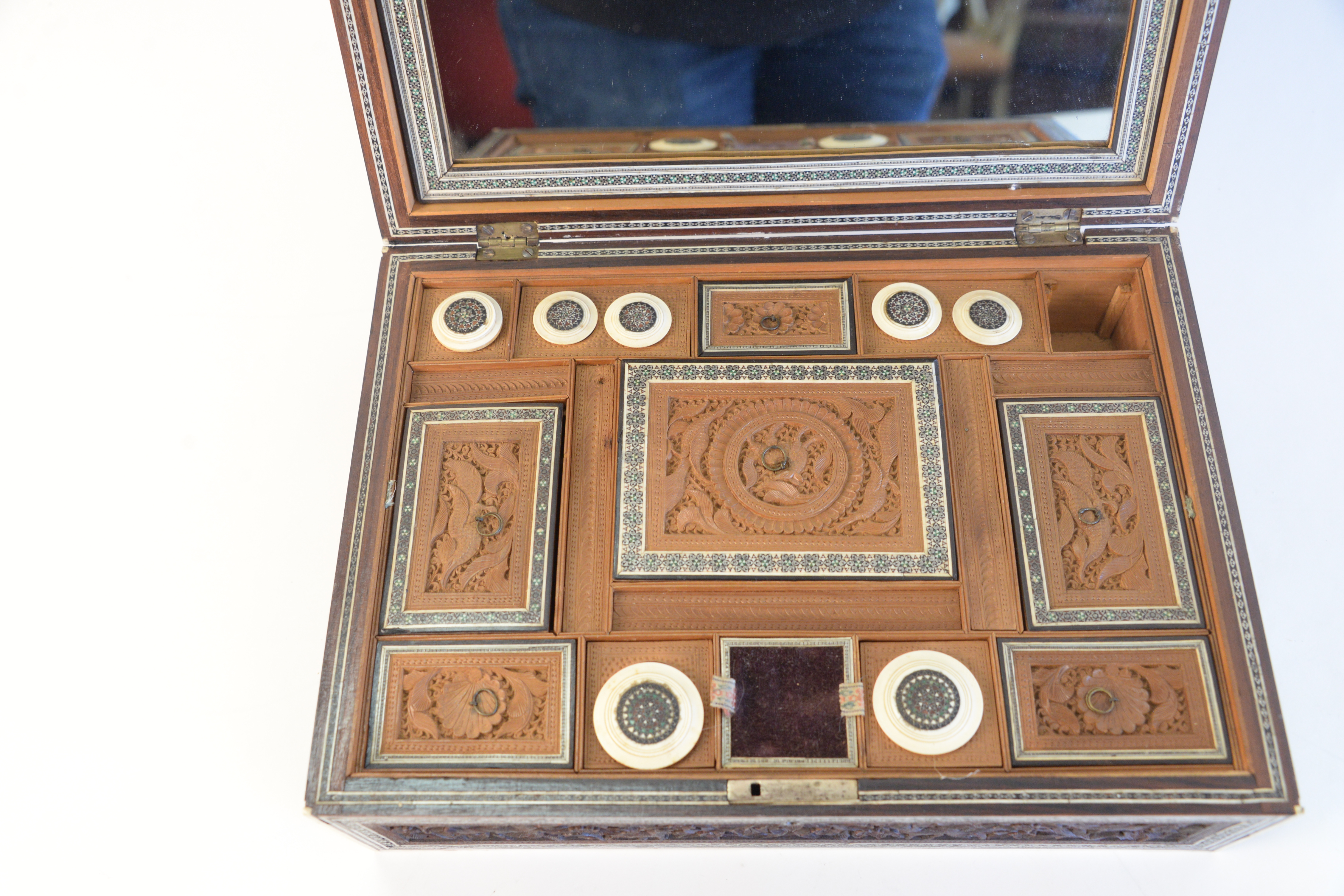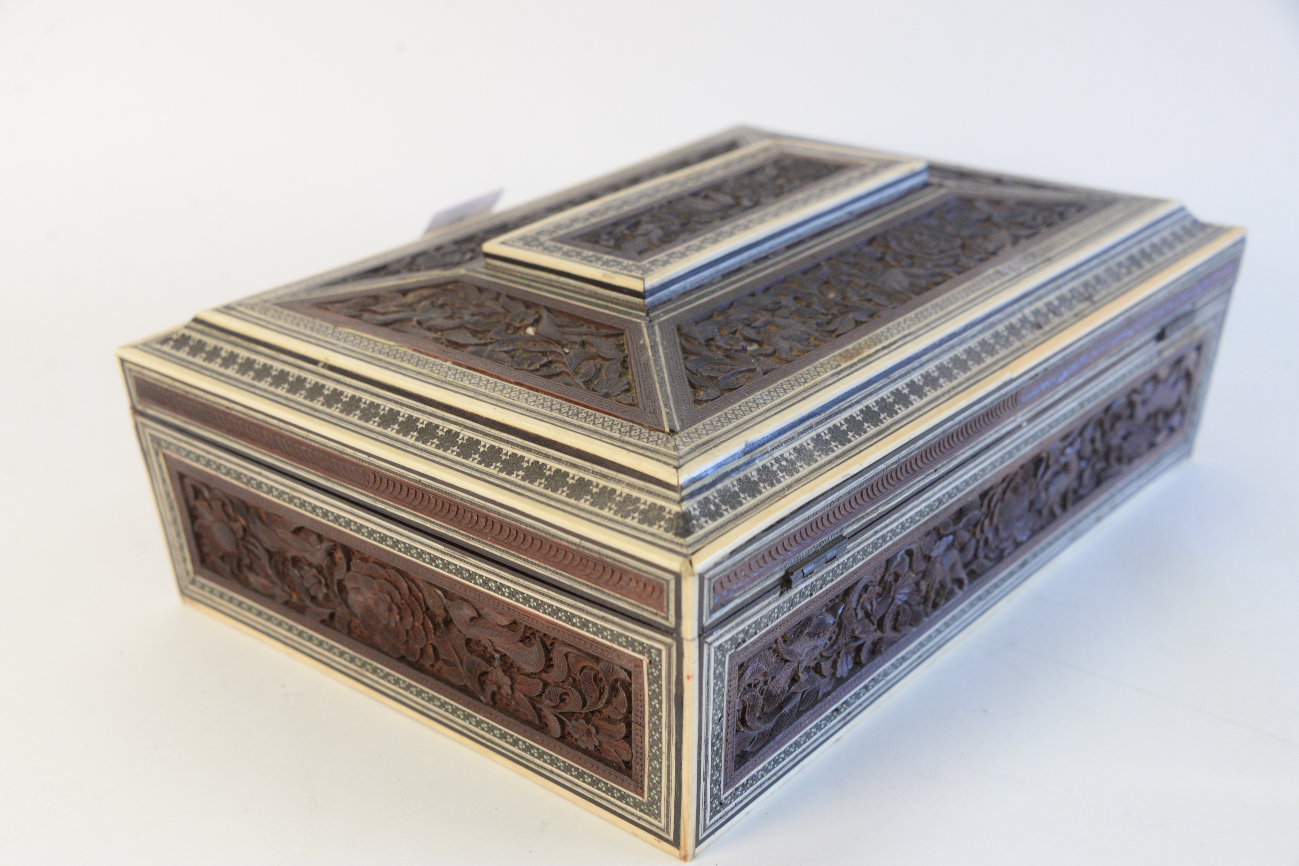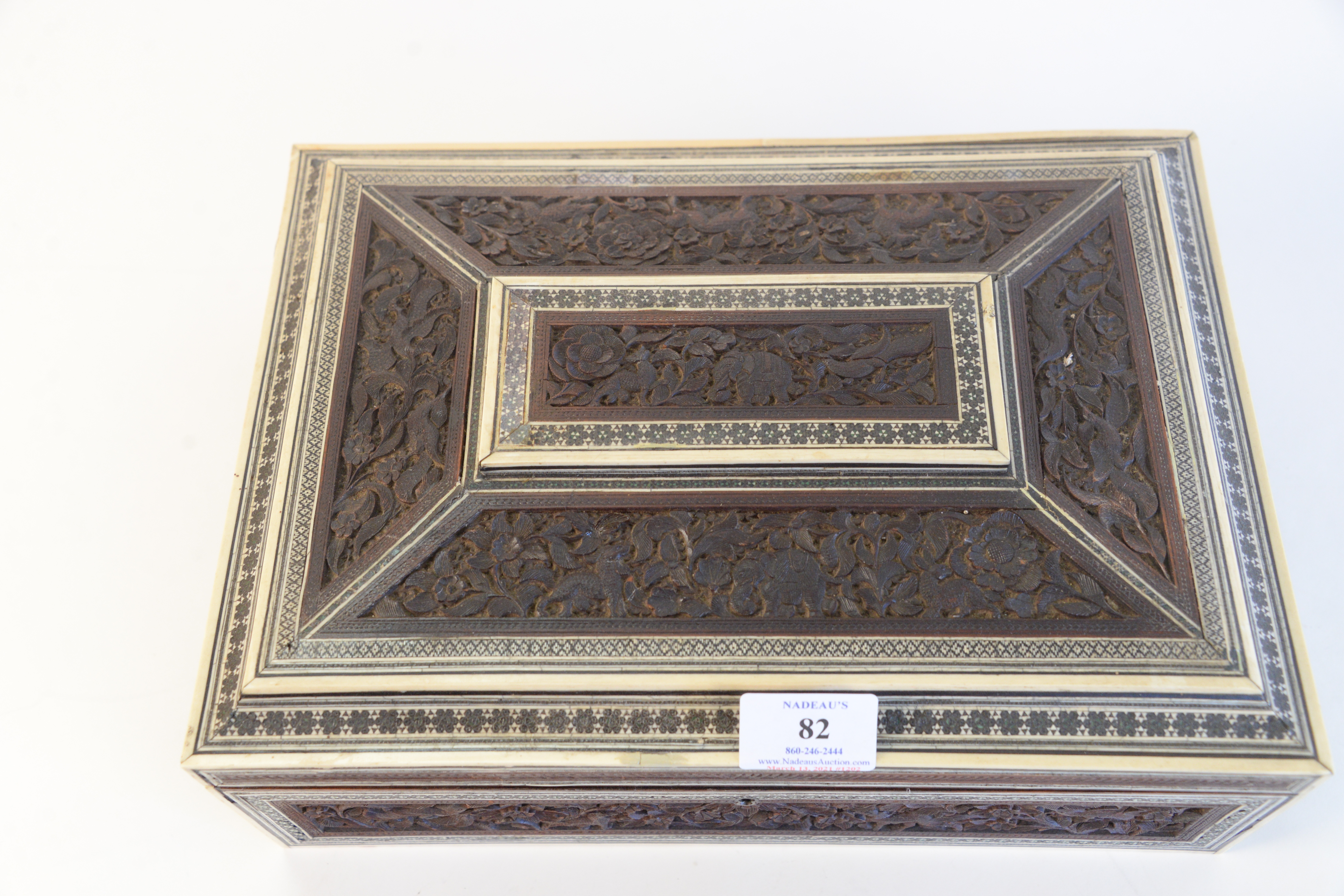 Lot 82: Carved Rosewood and Inlaid Rectangular Sewing Box, with fitted interior, height 4 1/2 inches, width 12 3/4 inches, depth 9 1/4 inches.