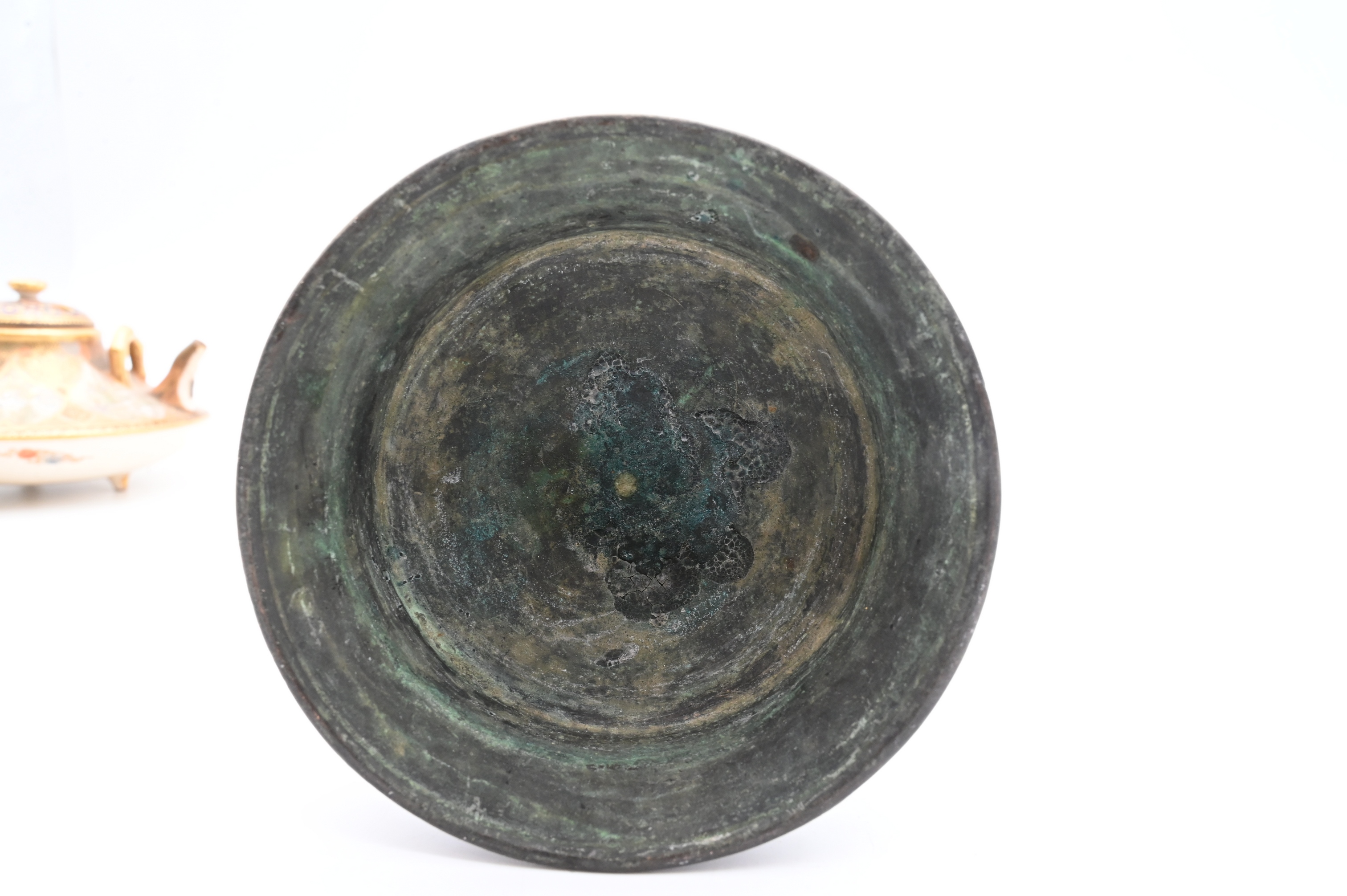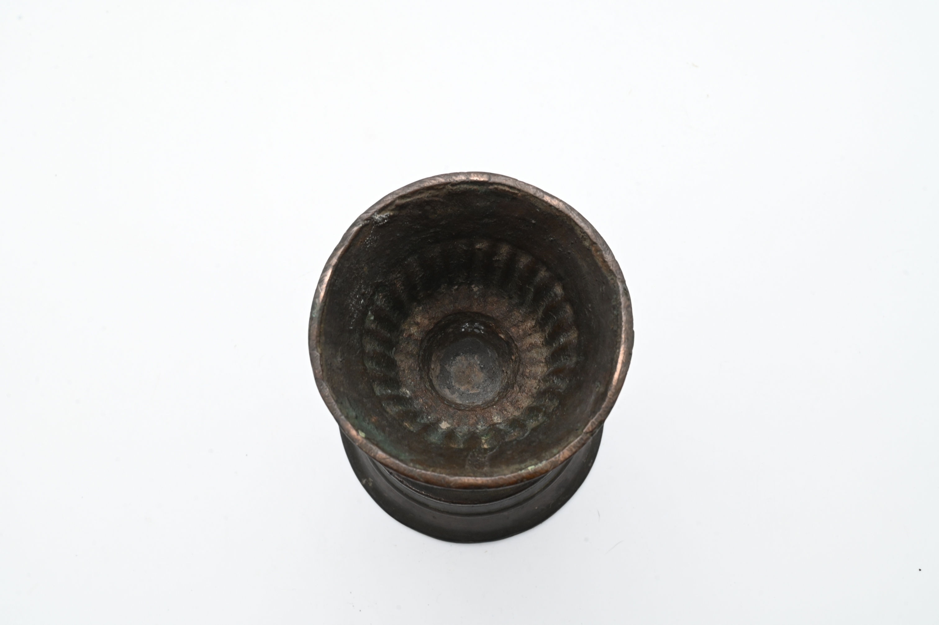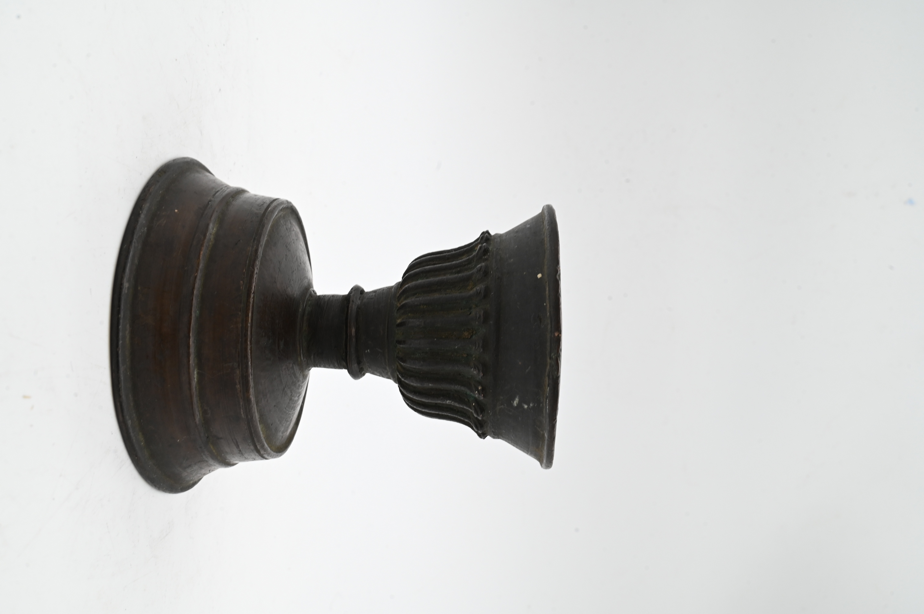 cast bronze vessel with flared rim and lobed body on a spreading foot, showing surface wear and patina consistent with age, possibly a small vase or incense burner.
