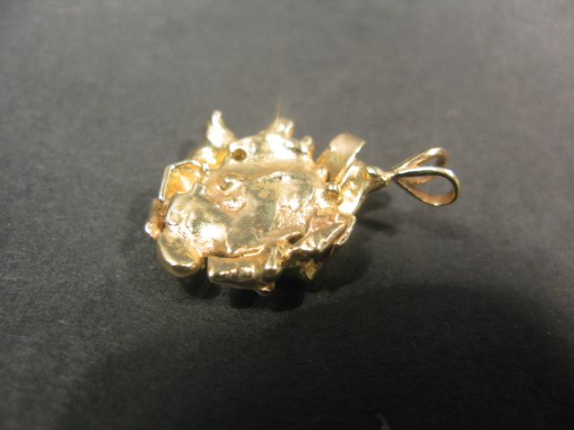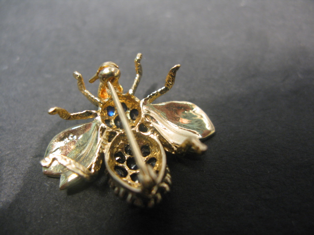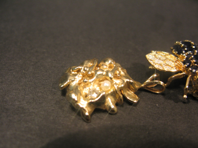 Group of 14K gold including a pendent set with a diamond and pearl and large fly pin set with blue stones.