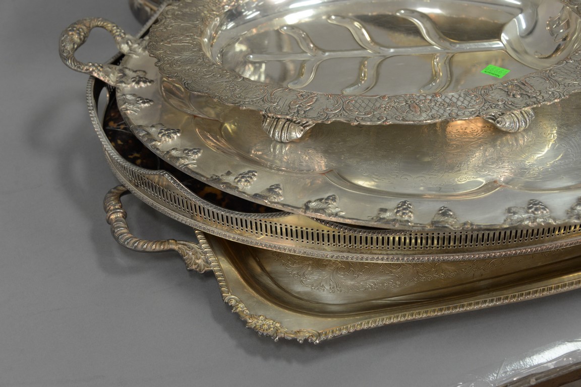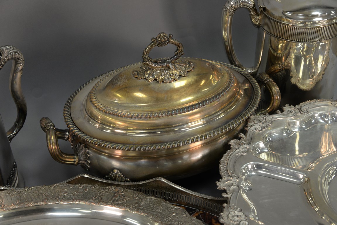 Lot 82: Group of silverplated items to include four large trays lg. 17in. to 27in., revolving center dish lg. 20in., covered tureen ht….
