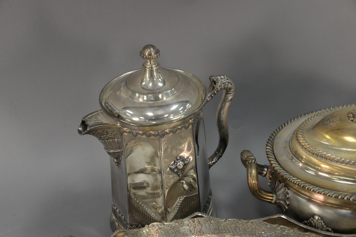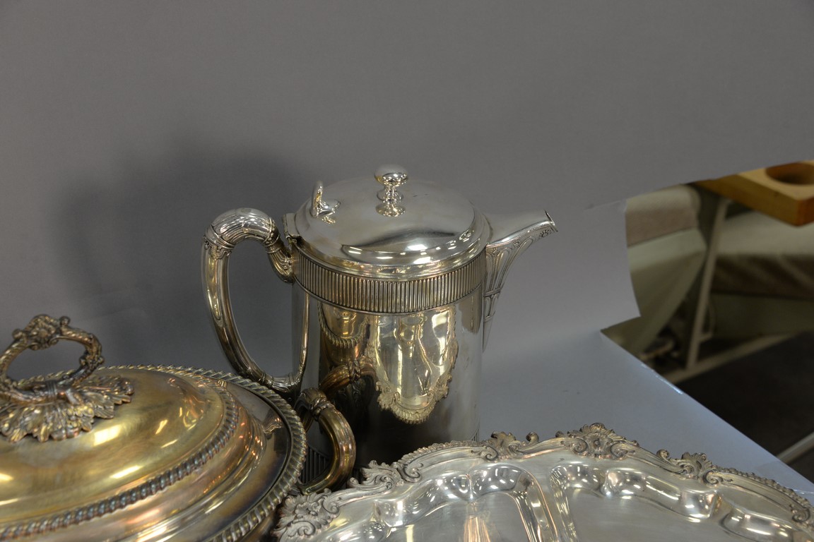 Group of silverplated items to include four large trays lg. 17in. to 27in., revolving center dish lg. 20in., covered tureen ht. 11in., and two large pitchers ht. 11in. & 13in.