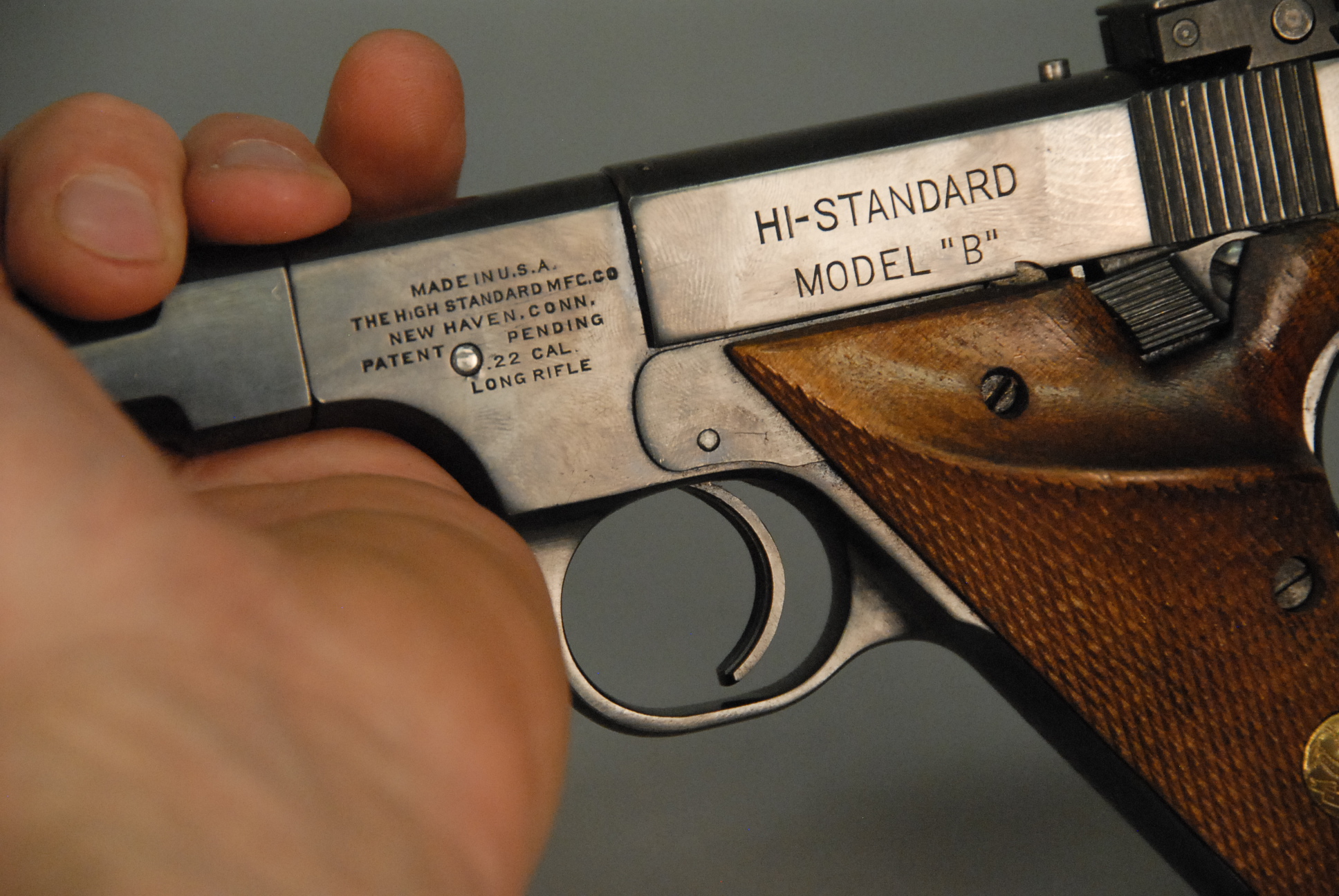 Hi Standard model B pistol, 22 caliber long rifle, 10 barrel, target pistol 458.