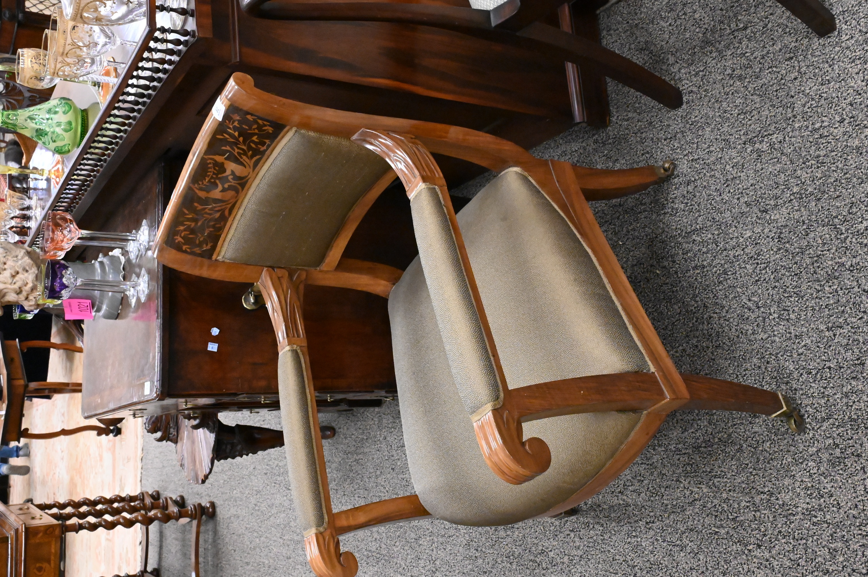 fine Austrian Biedermeier walnut armchair with animalistic penwork and foliate details, curved backrest with inlaid scrolling decoration above upholstered back, arms, and seat in brown fabric, raised on square tapering legs ending in brass casters, circa 1820