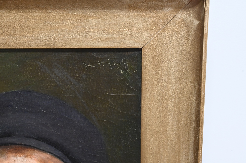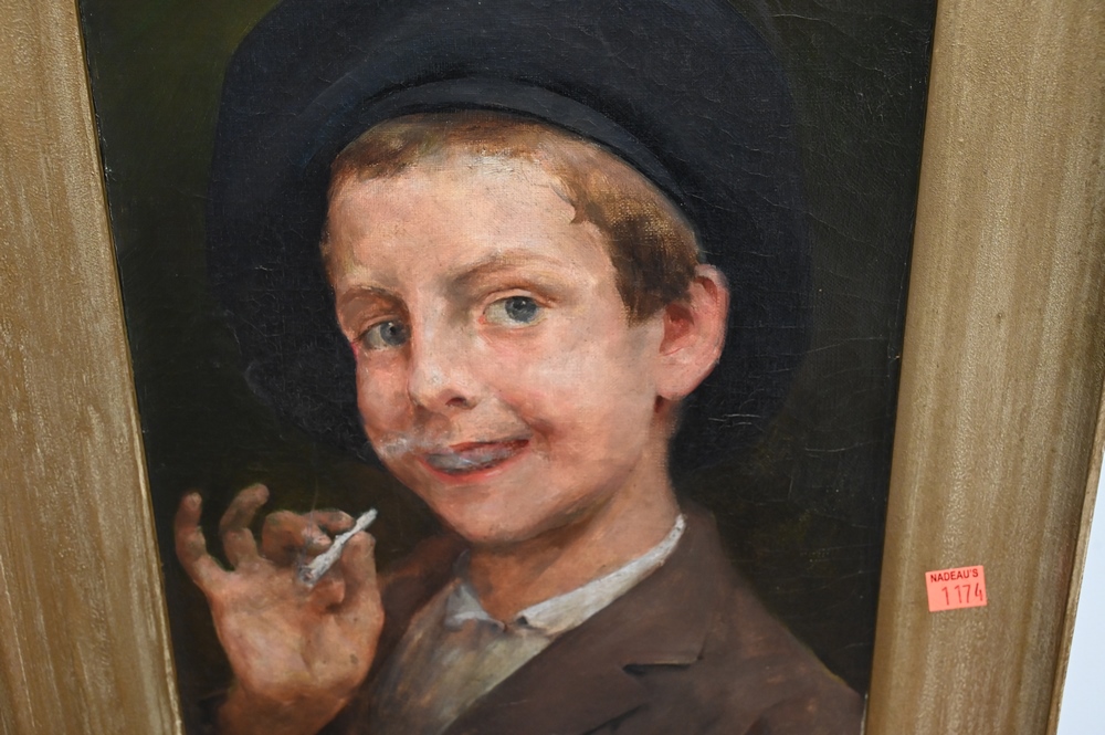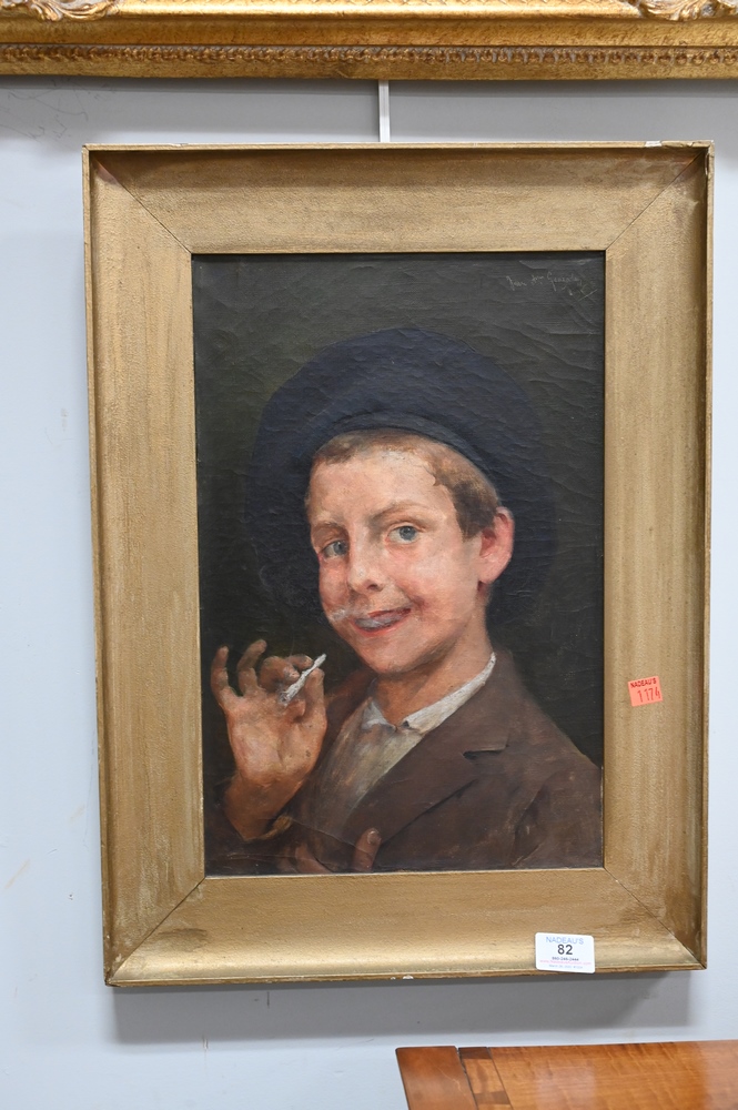 Lot 82: Juan Antonio Gonzalez (1842 – 1914), oil on canvas, boy smoking a cigarette, signed top right Juan Gonzales 98, 16″ x 10 1/2″.