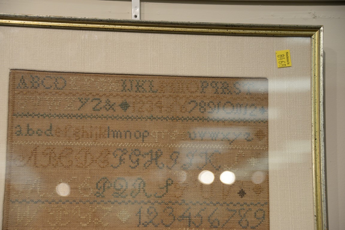Lot 82: Large 19th century sampler The lilies of the field That quickly fade away May well to us a lesson yield Who die as soon as they The…