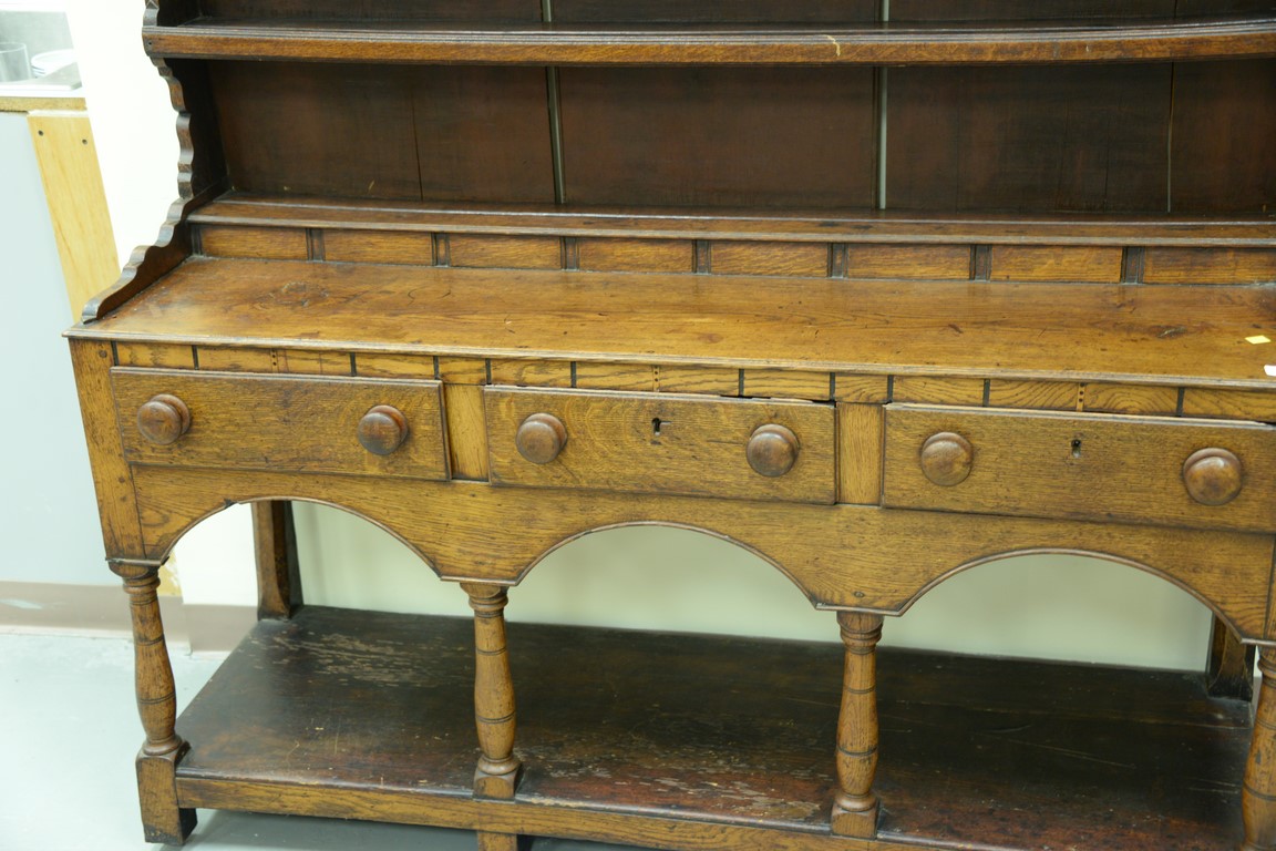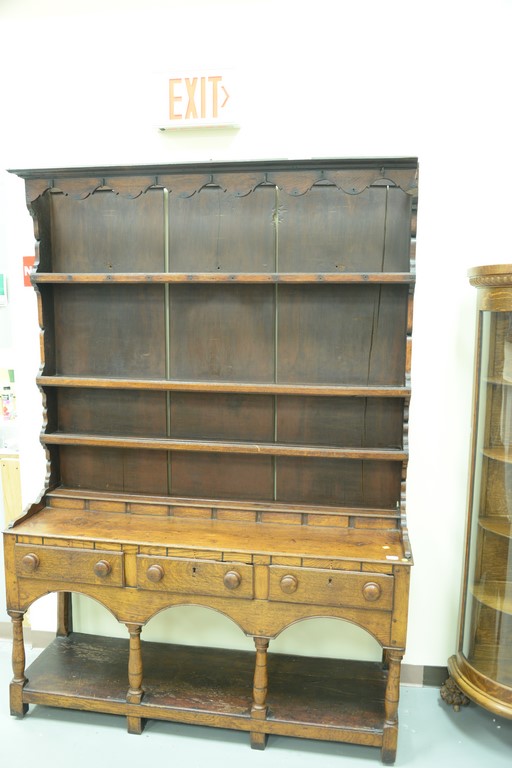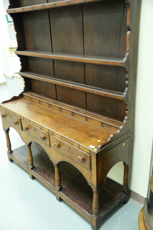 Lot 82: Oak Welsh cupboard in two parts with open shelved top on base with three drawers on block and turned legs, 18th century. height 84 …