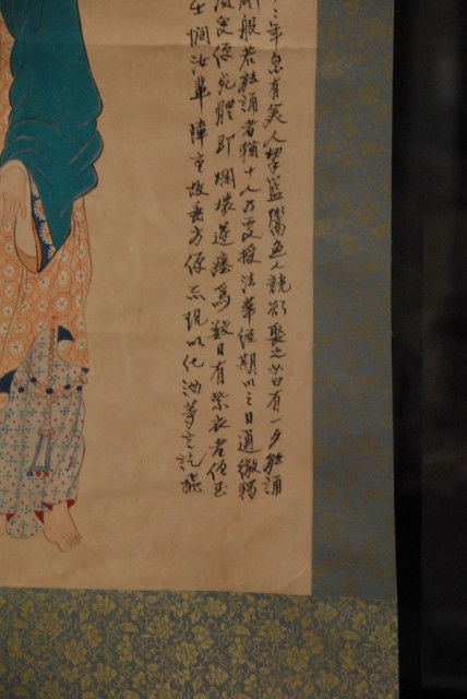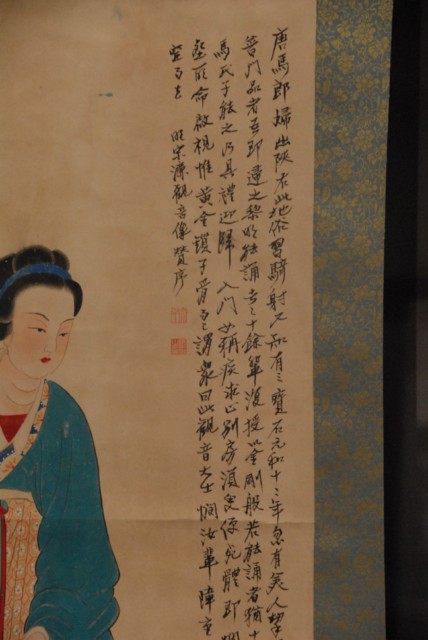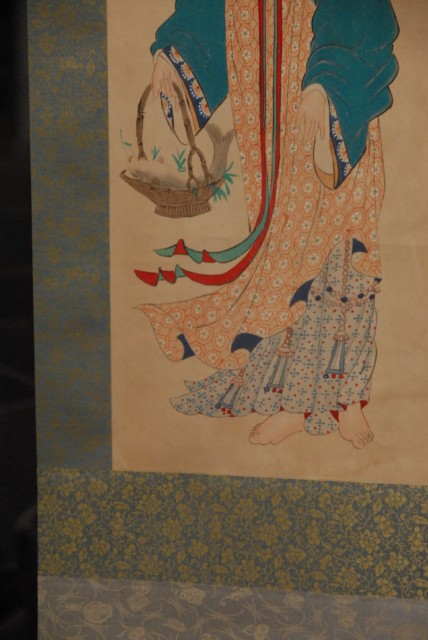 Oriental scroll of a GuinYin standing holding a basket of fish in it