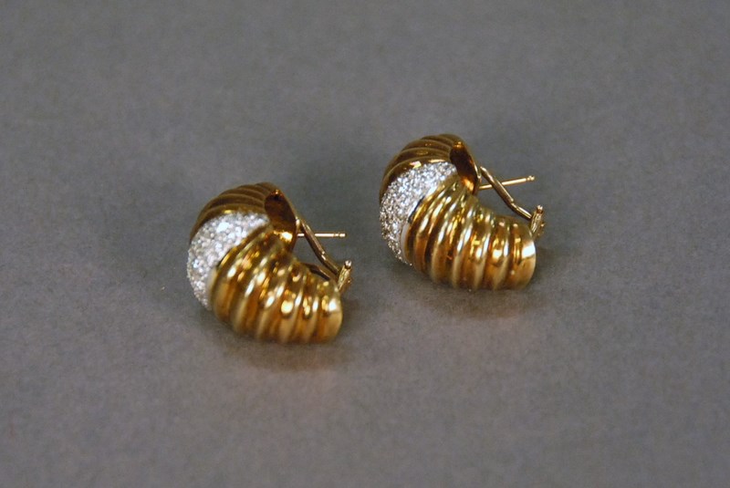 Pair of 14K gold earrings, each with thirty-nine diamonds. 18.6 grams