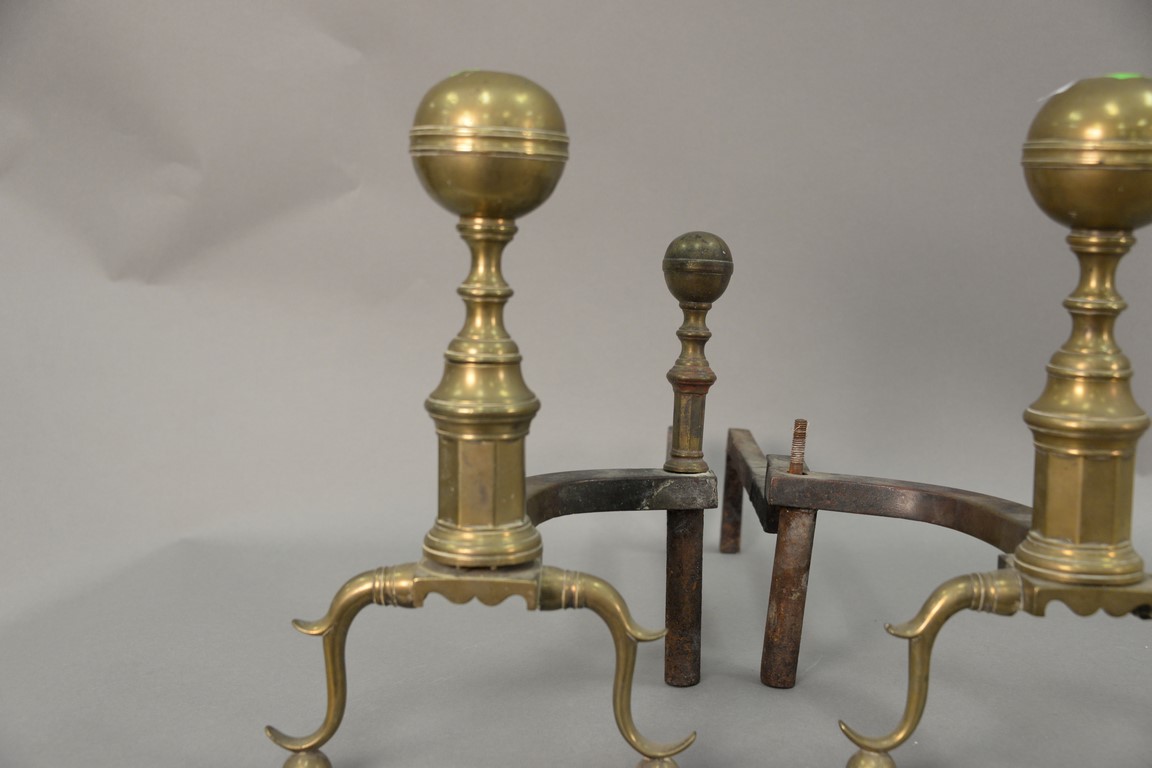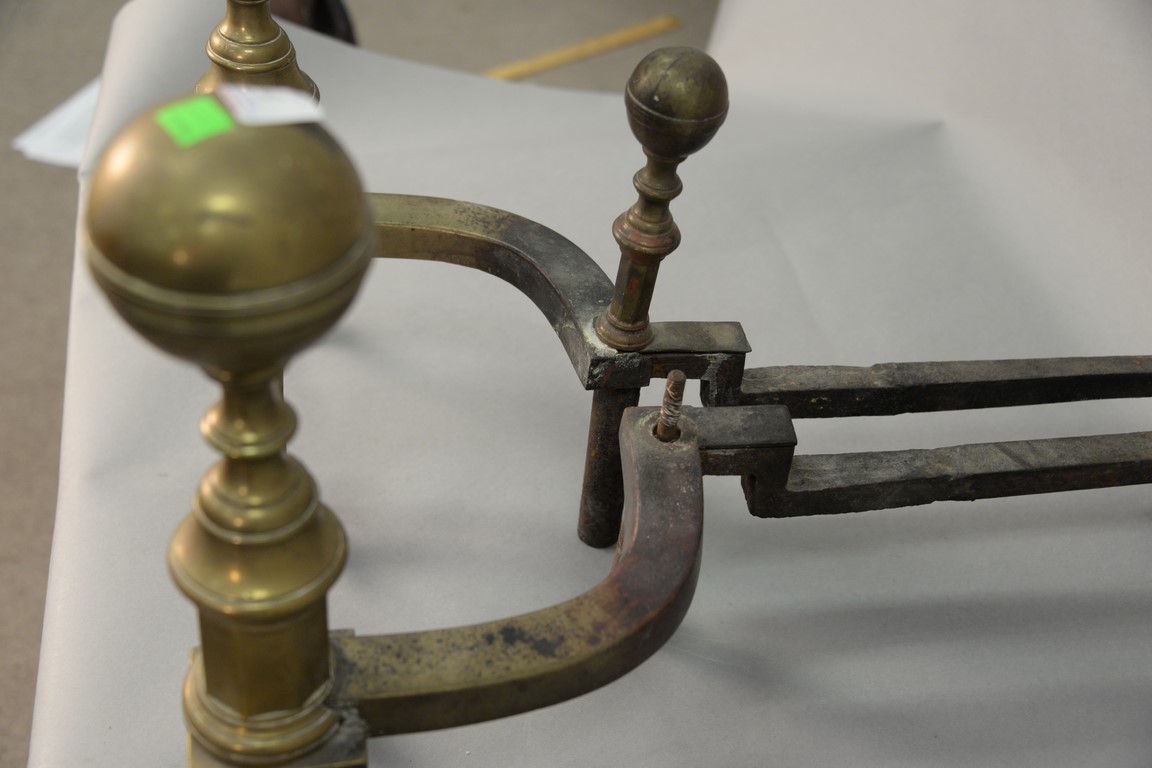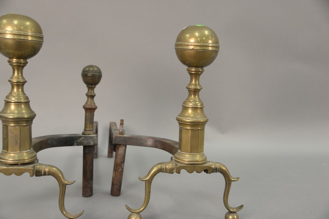 Lot 82: Pair of Federal brass andirons, probably Boston, circa 1830 one log stop missing. ht. 16 1/2in.