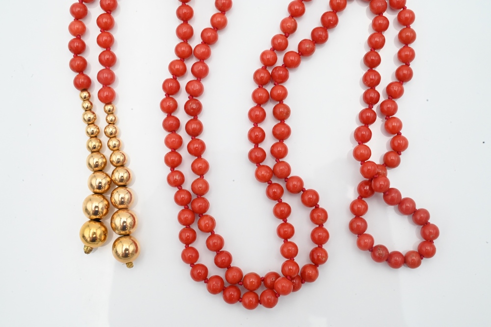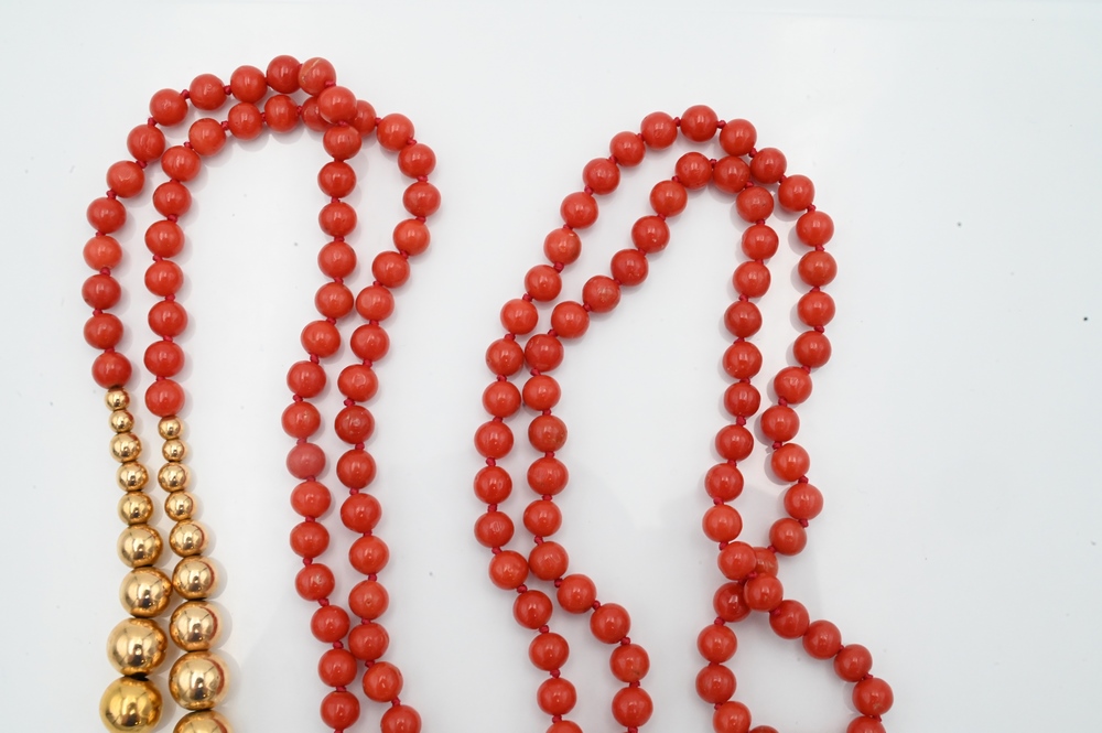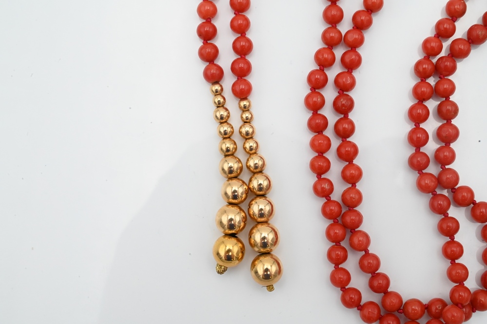 Lot 82: Round Red Coral Beaded Necklace, having 14 karat gold beaded ends, each bead approximately 6 millimeters, length 40 inches.
