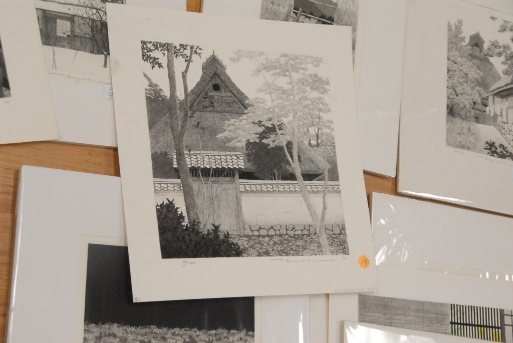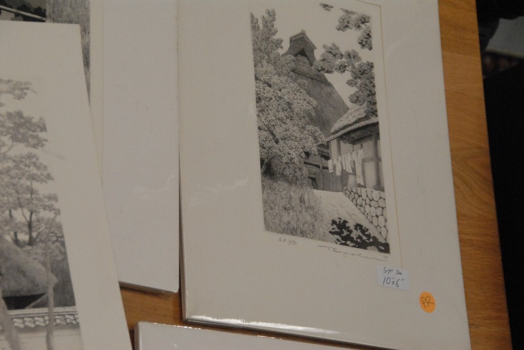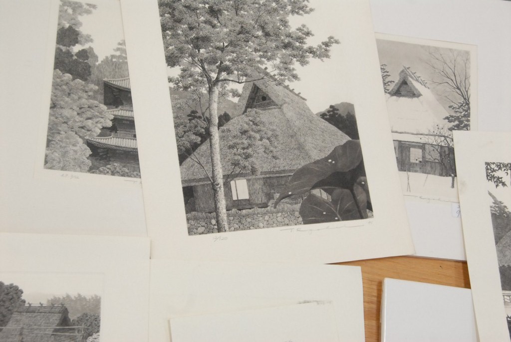 Lot 82: Ryohei, Tanaka group of fifteen etchings, some matted, various sizes 3 1/2 x 5 to 12 x 12.
