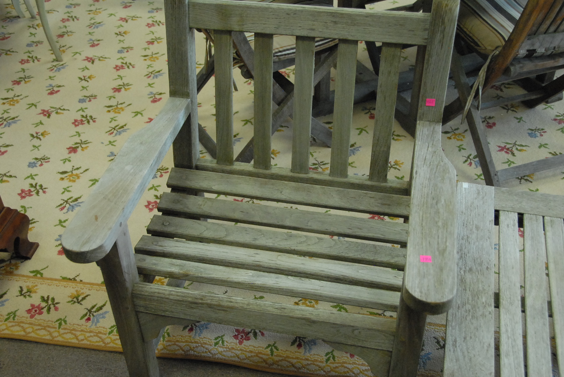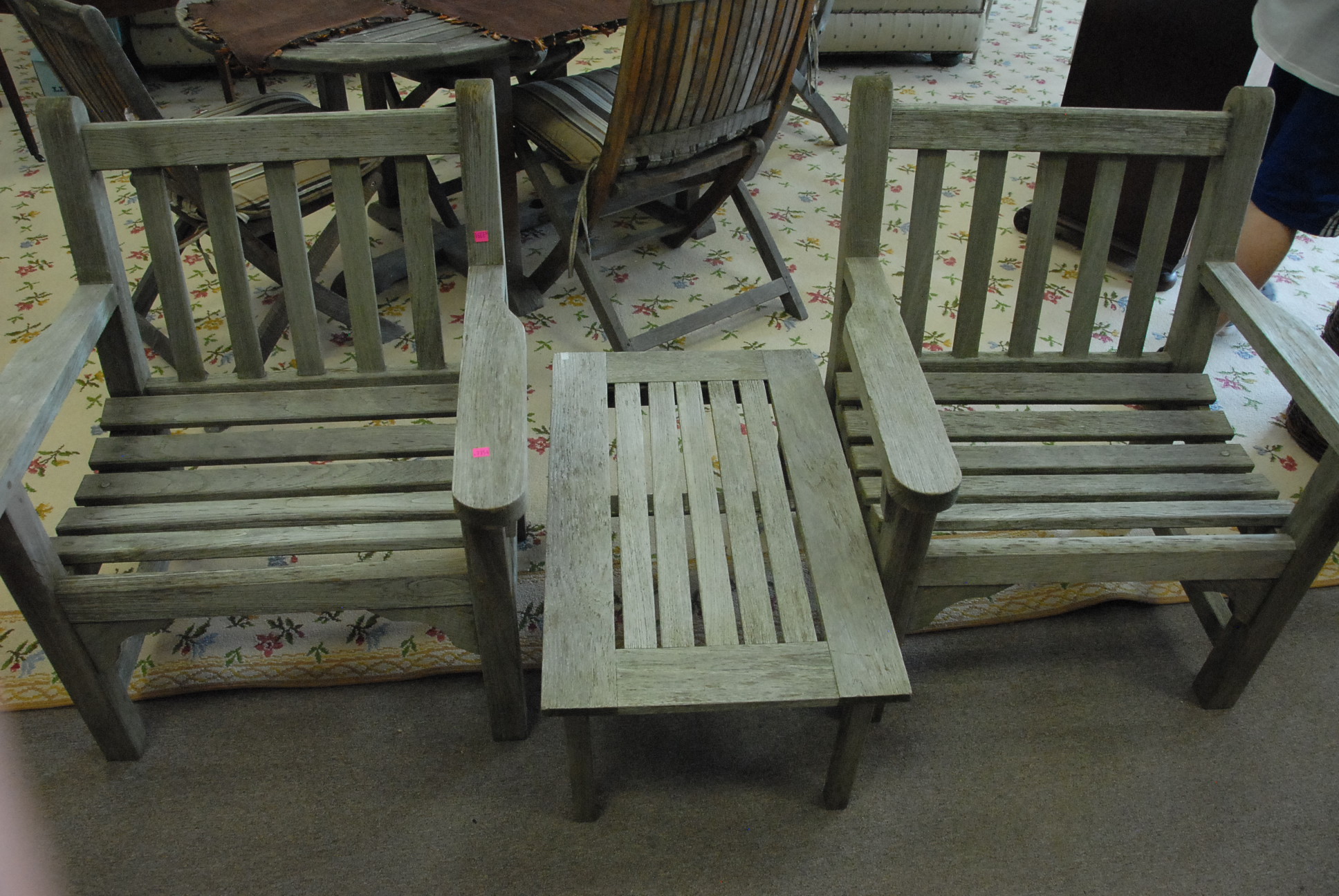 Smith & Hawkins three piece set to include pair of teak armchairs and a small table.