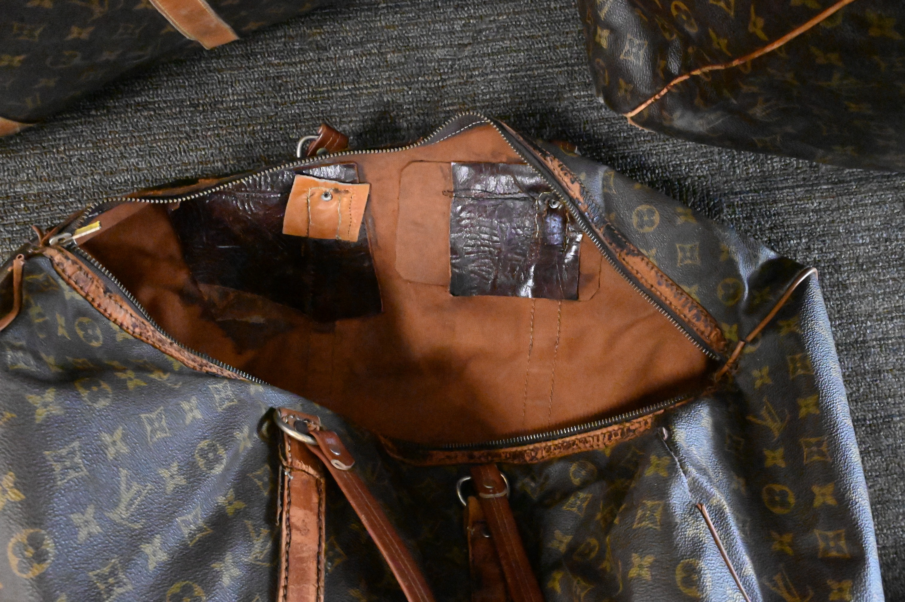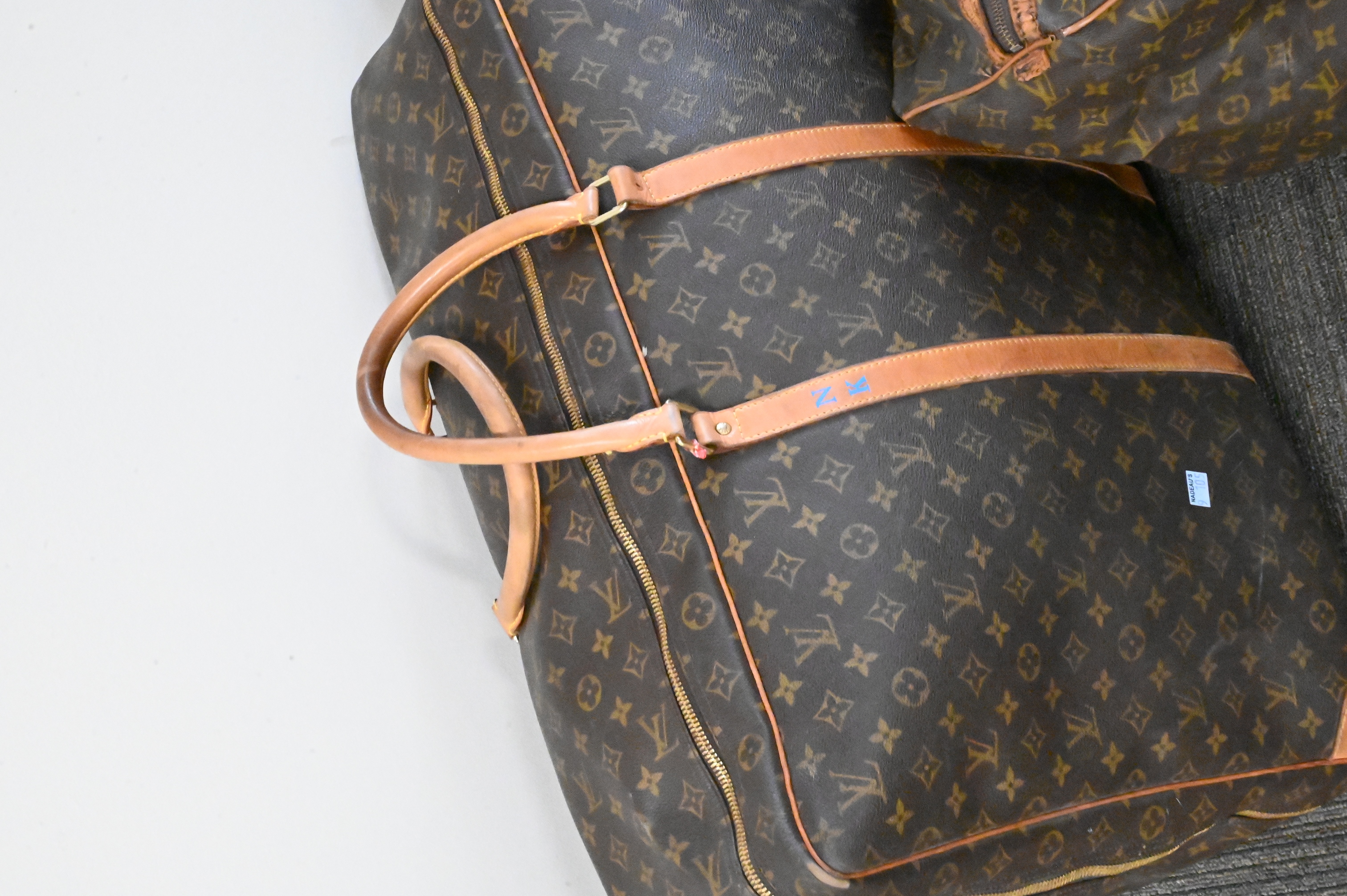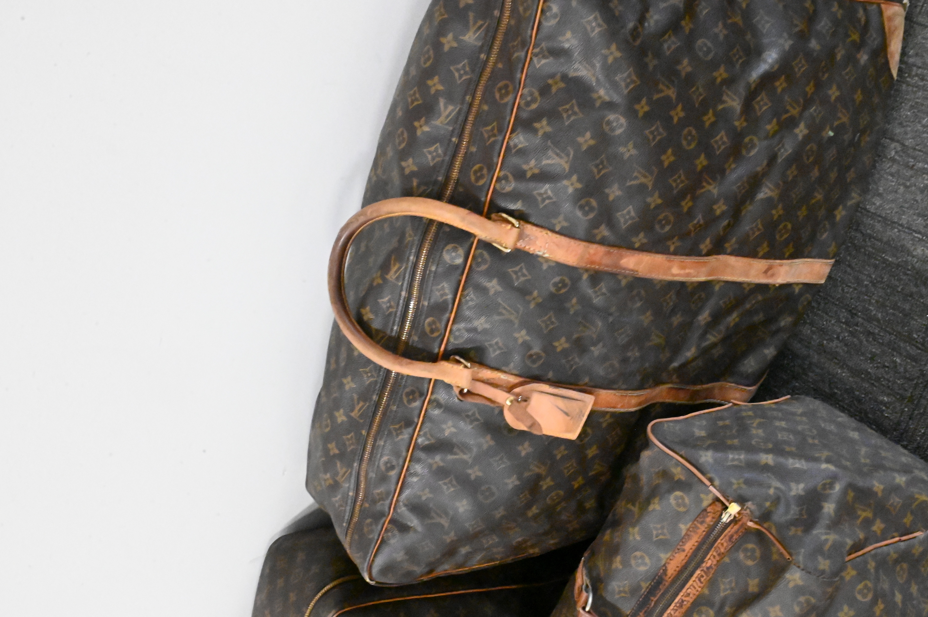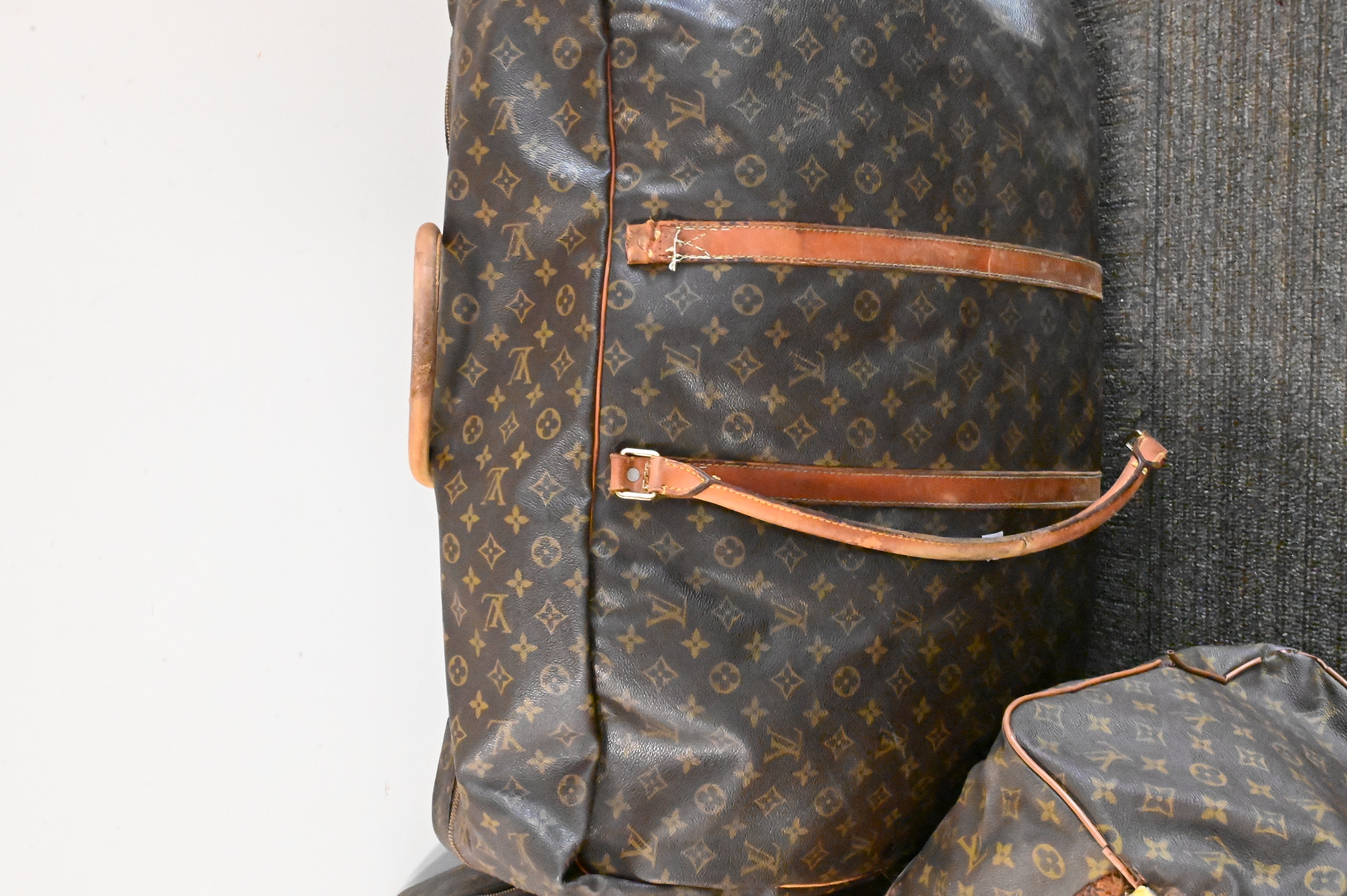Comprising one large garment bag and two soft-sided duffel or carryall bags, each with Louis Vuitton classic monogram coated canvas, leather handles, and trim. With brass zippers and fittings, each stamped with Louis Vuitton markings. Wear, creasing, and scuffs to leather and edges consistent with travel and use.