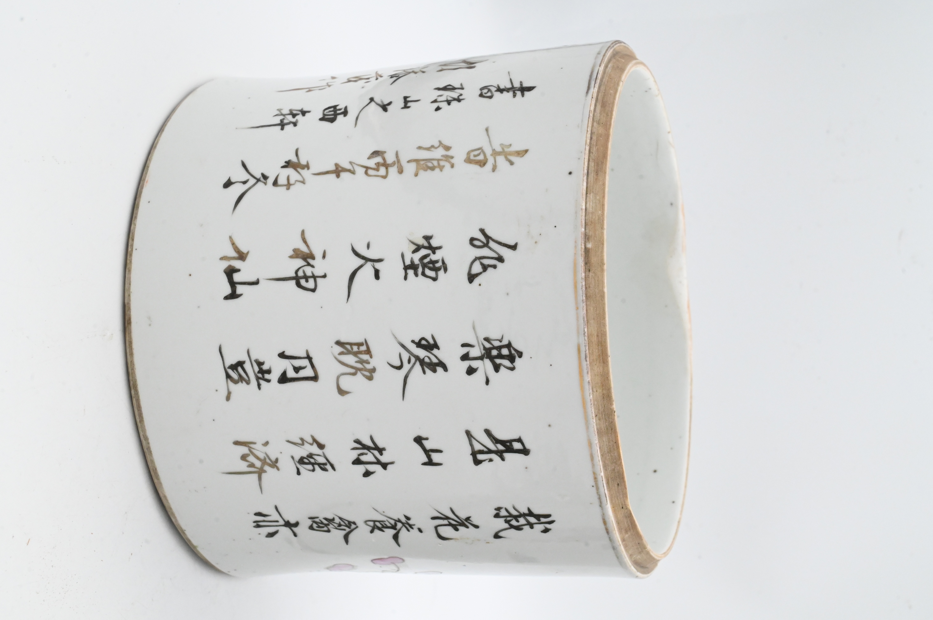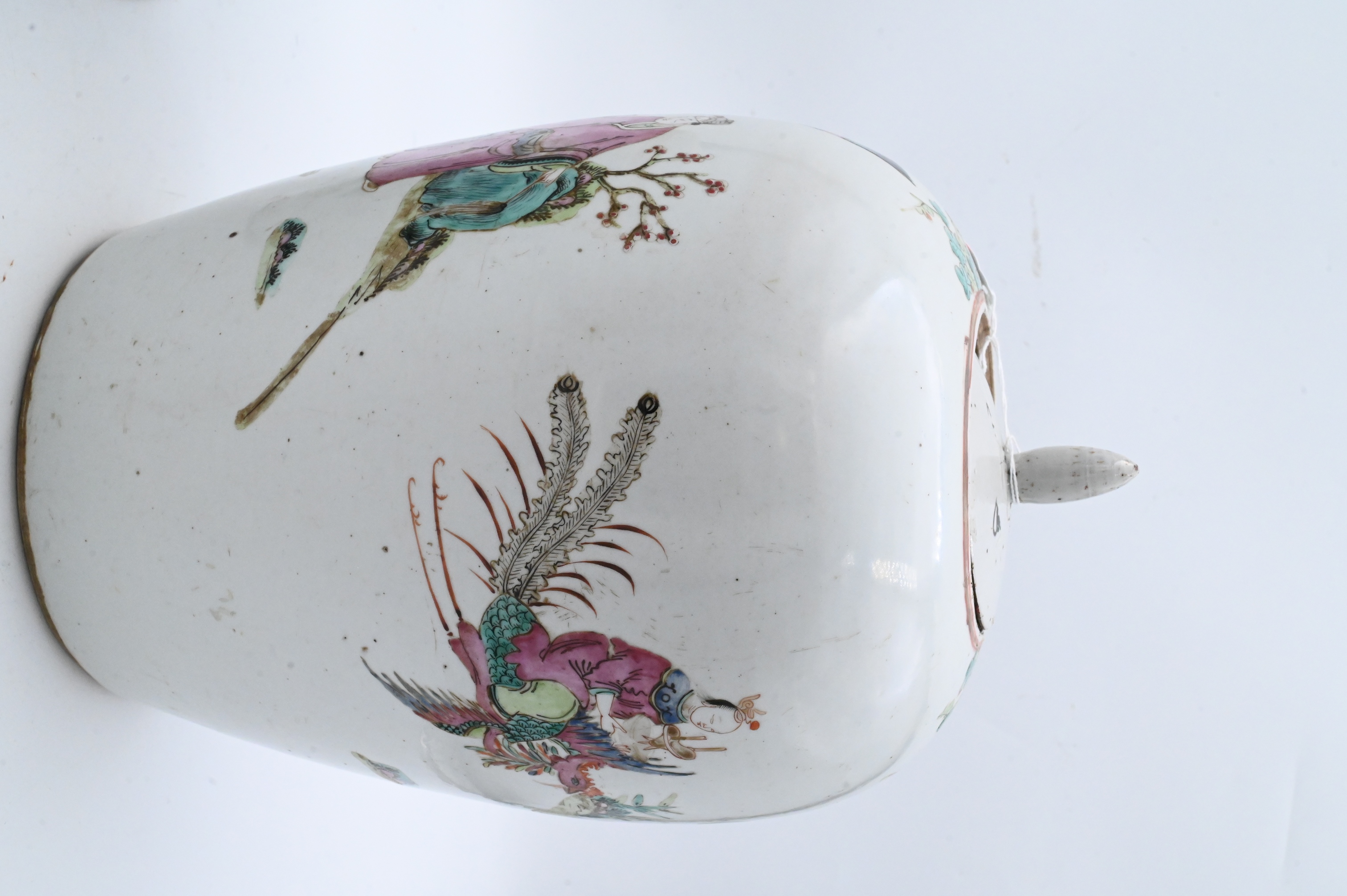 tapering lidded ginger jar with figures and phoenix design along with a jar having chrysanthemum and bird motif with calligraphy poem