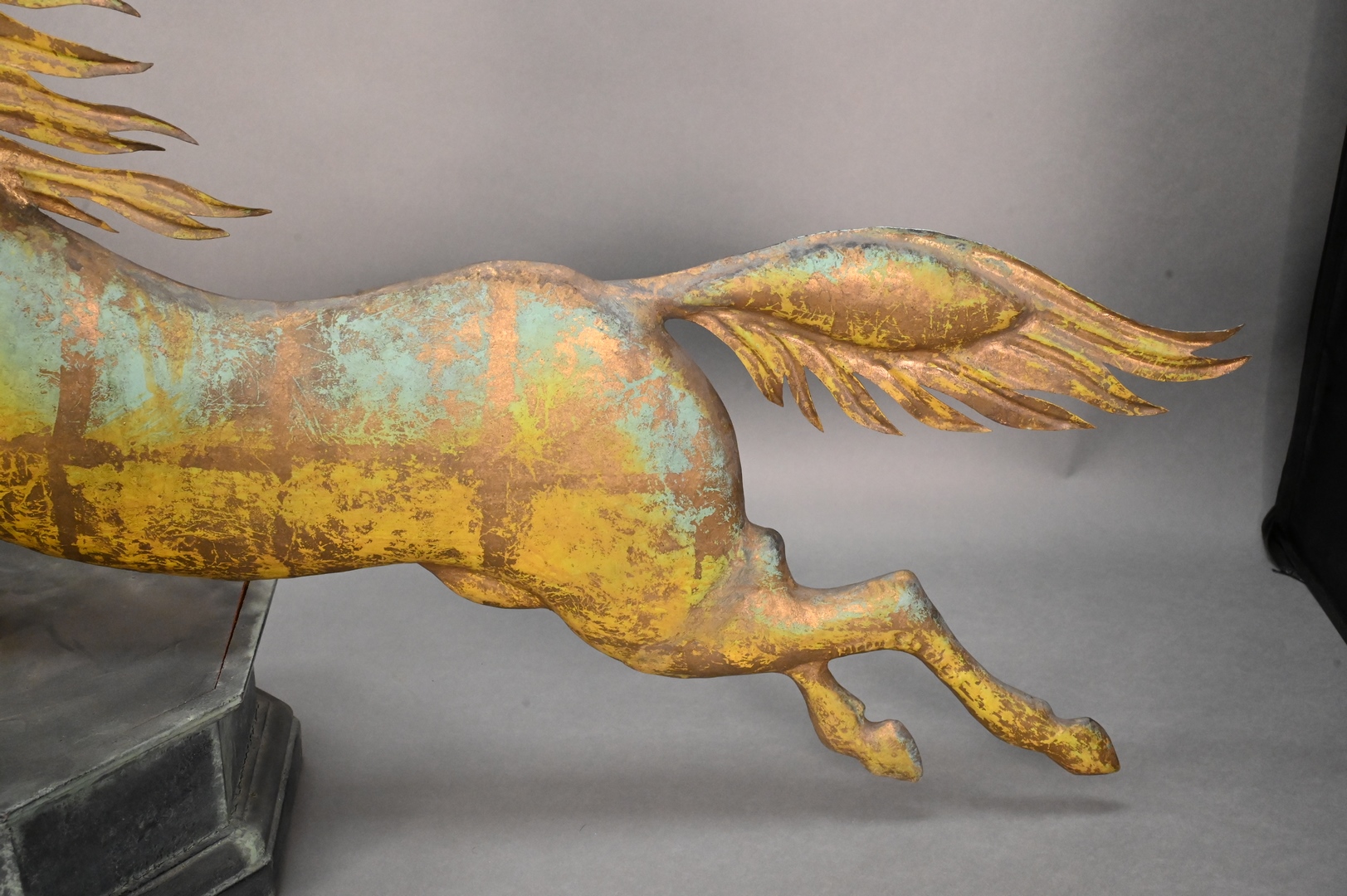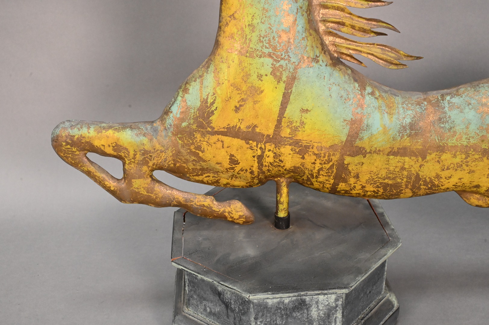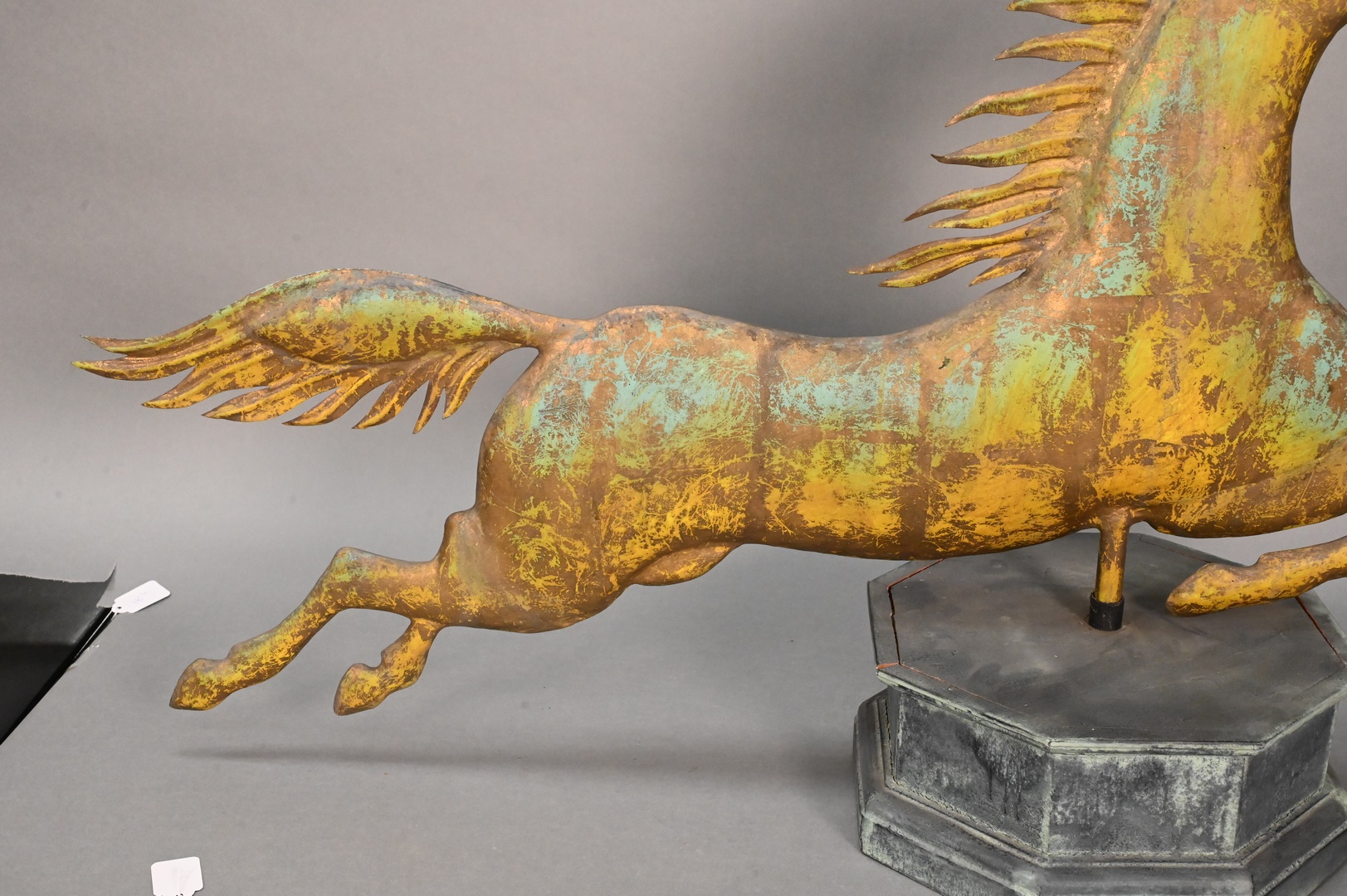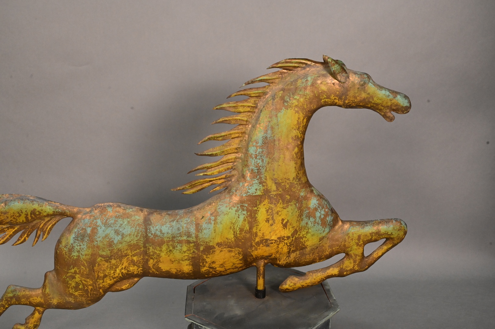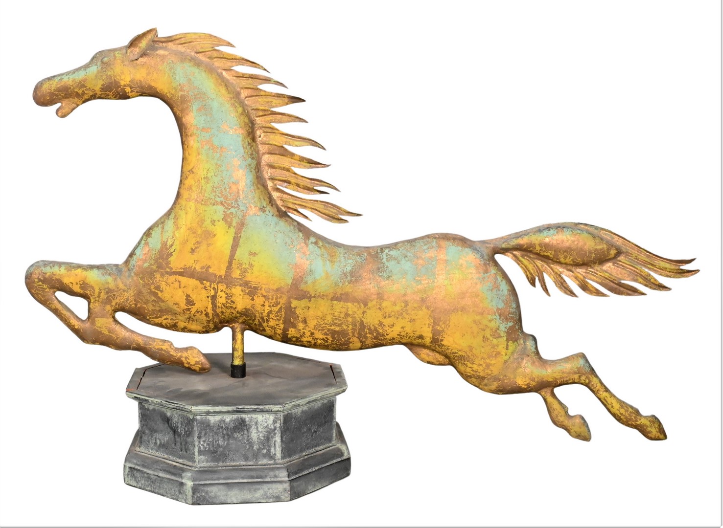 Vintage Reproduction Horse Weathervane, on wooden base, length 36 inches. Provenance: Estate of Peter Tillou, Litchfield, Connecticut.