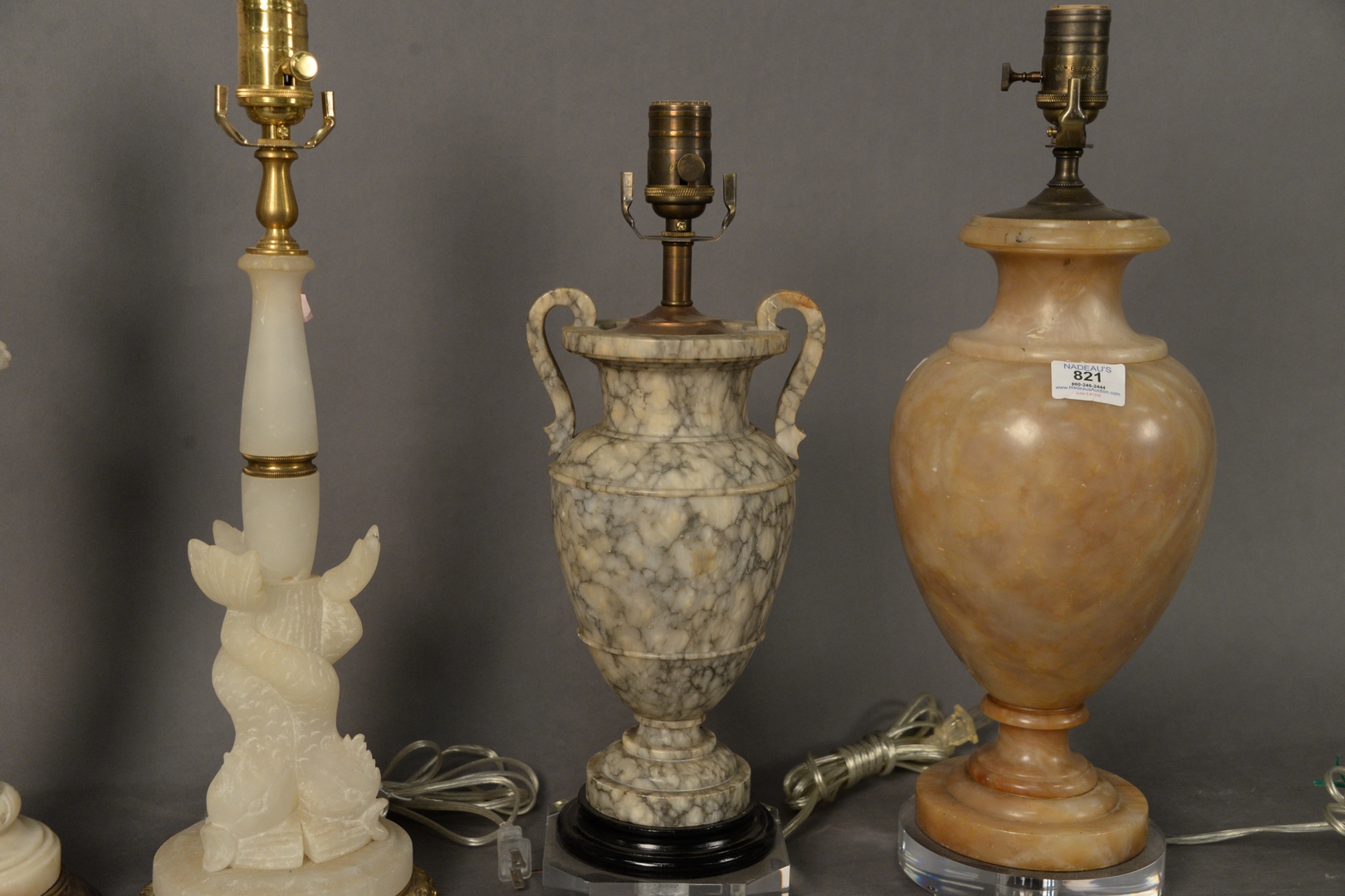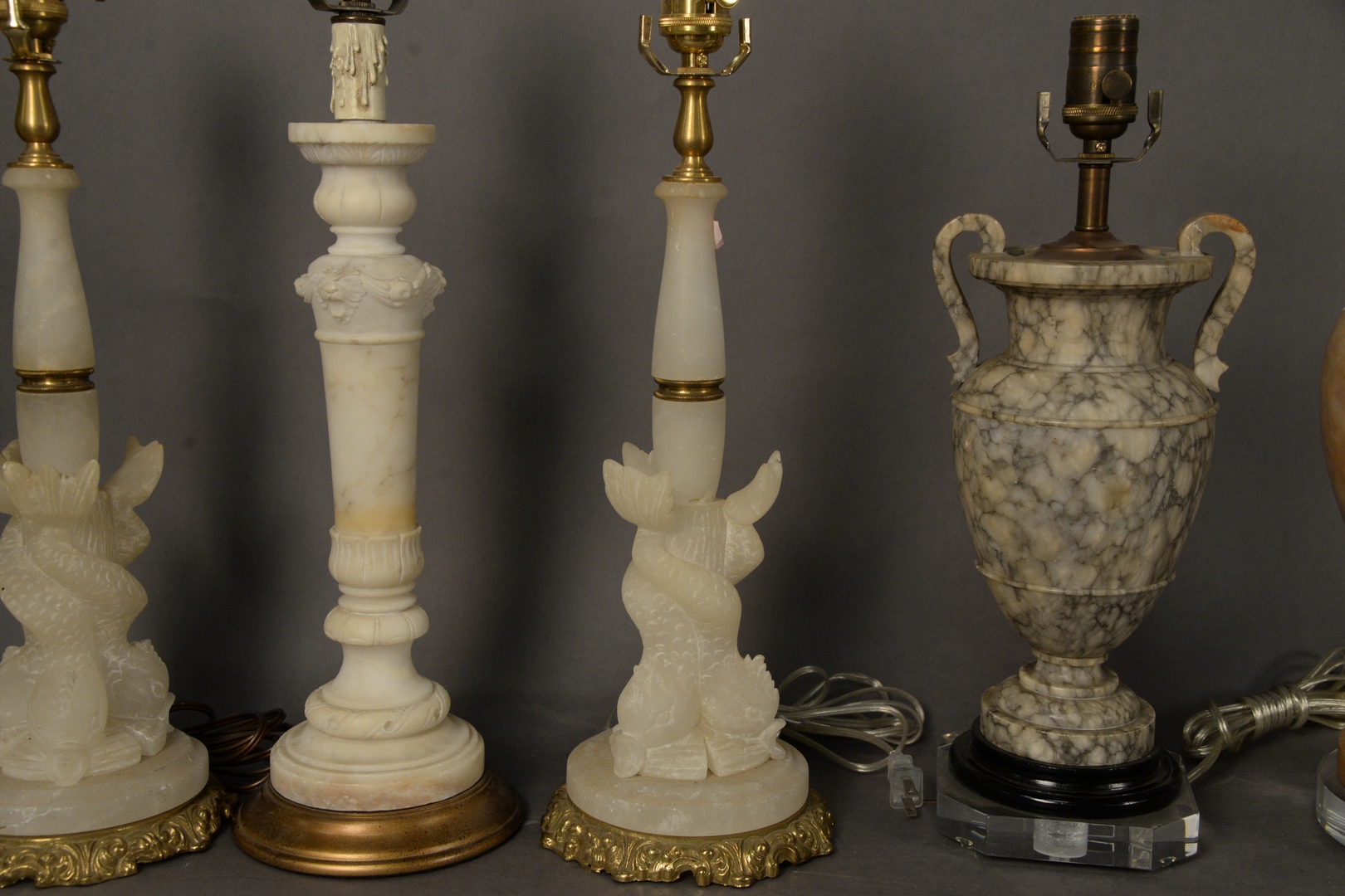 Lot 821: Group of Six Carved Alabaster Table Lamps, to include one pair having koi fish forms around the base one pair of candlestick forms…