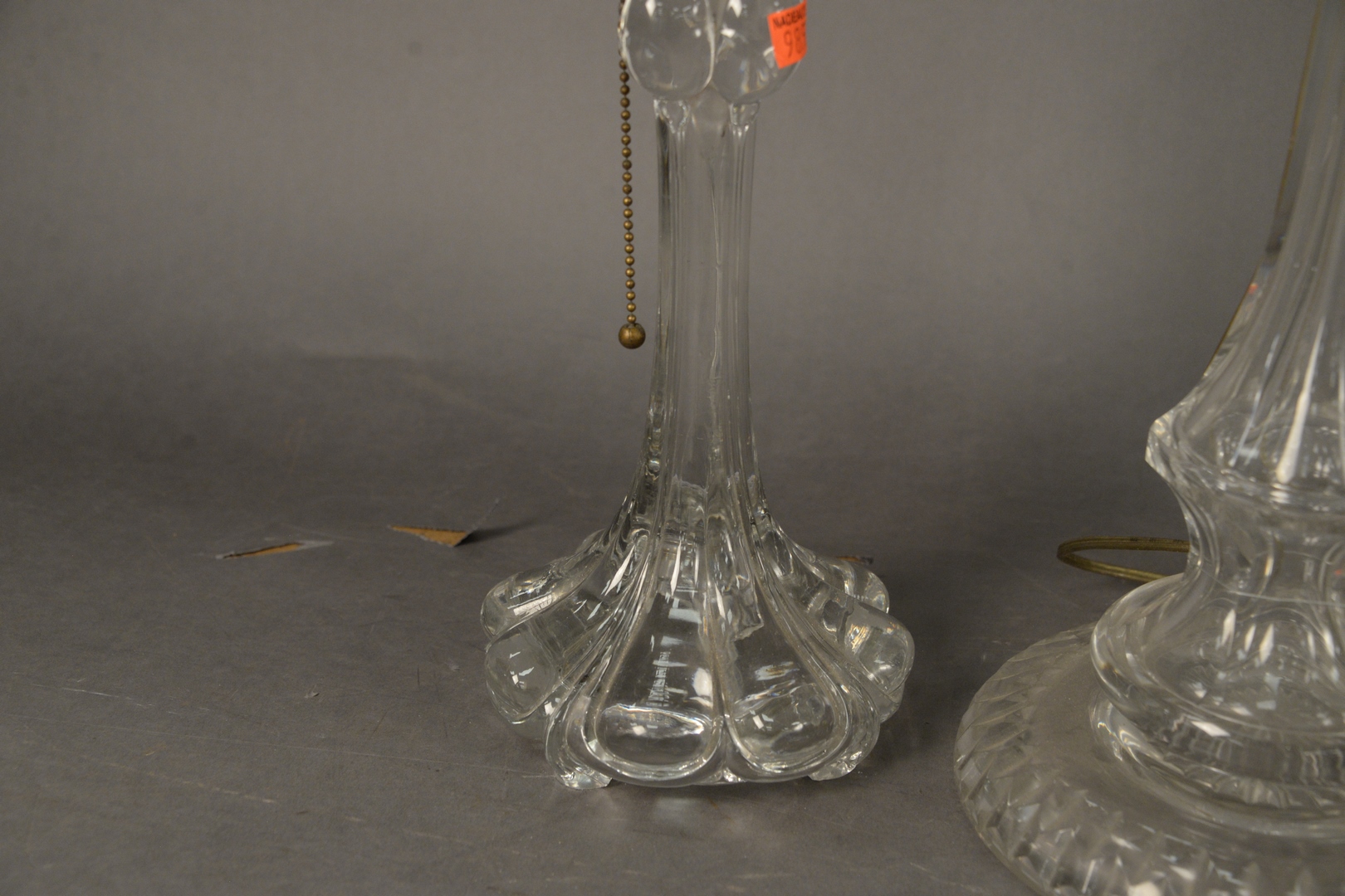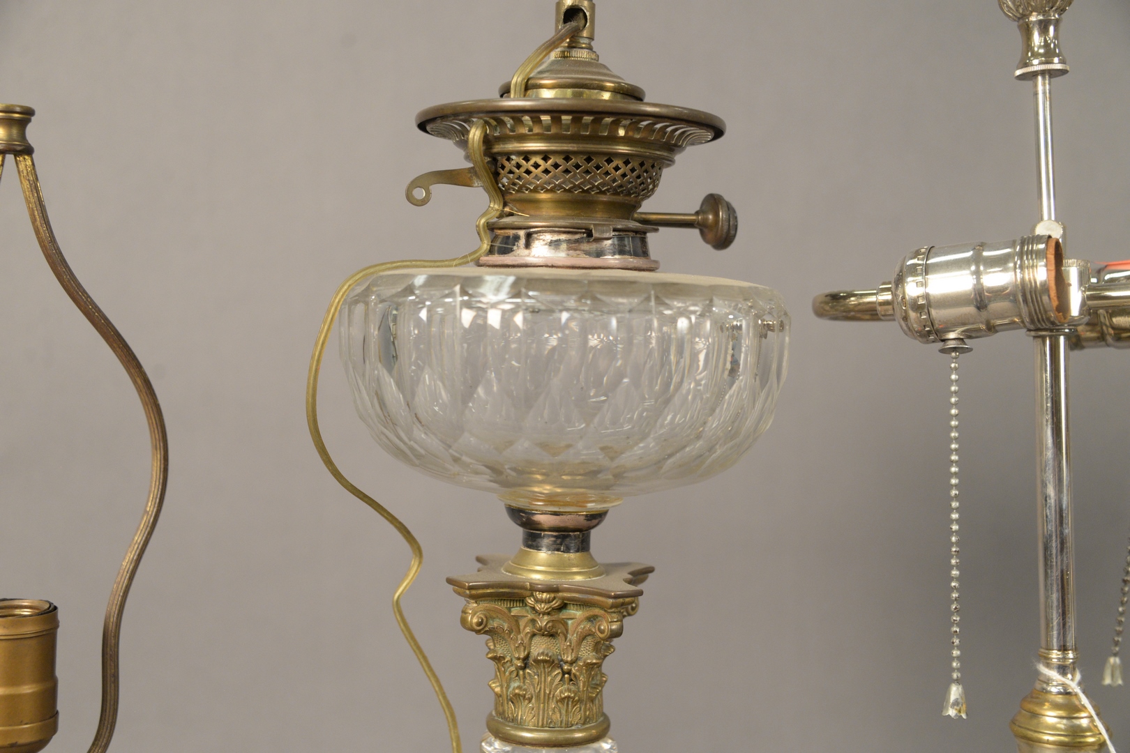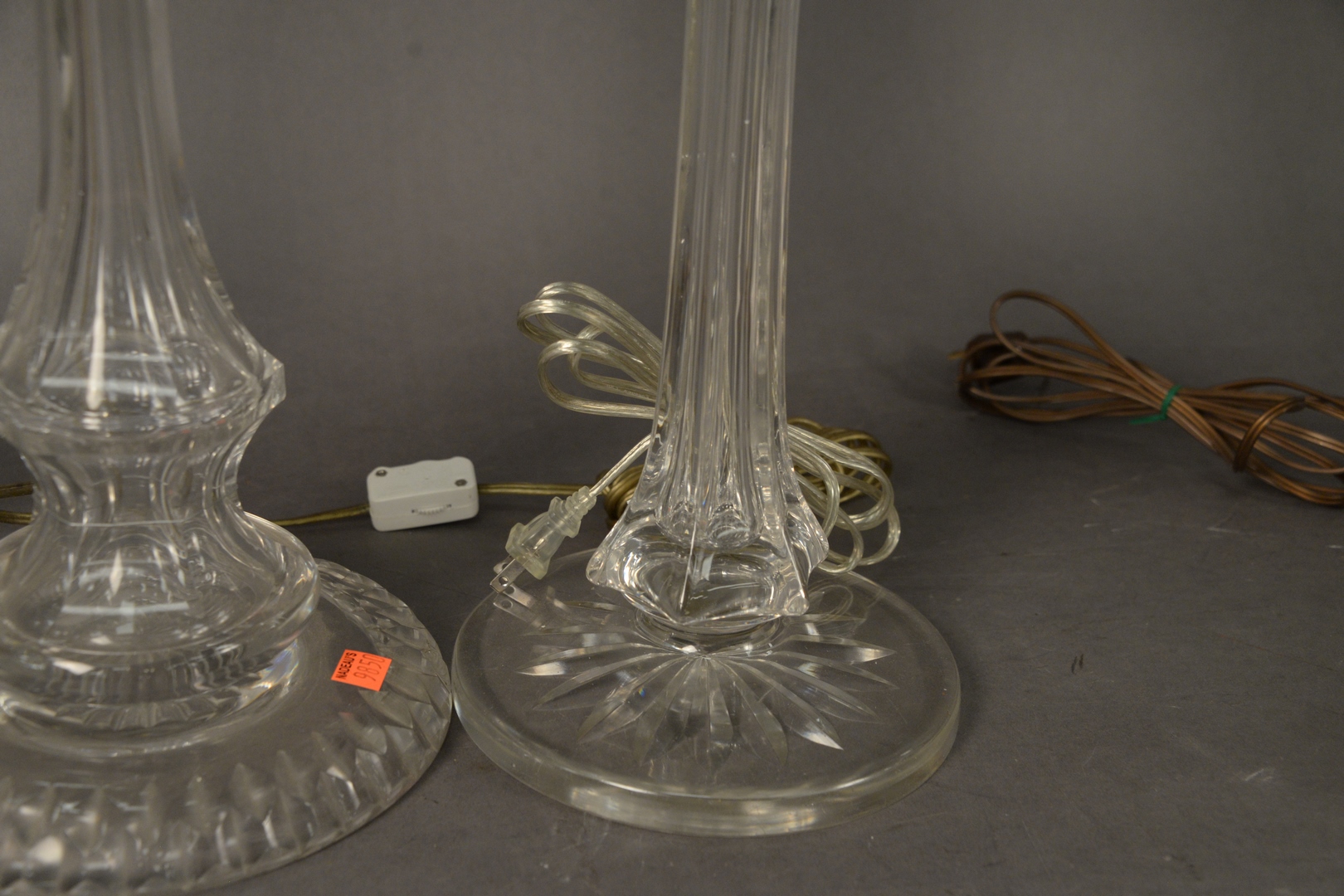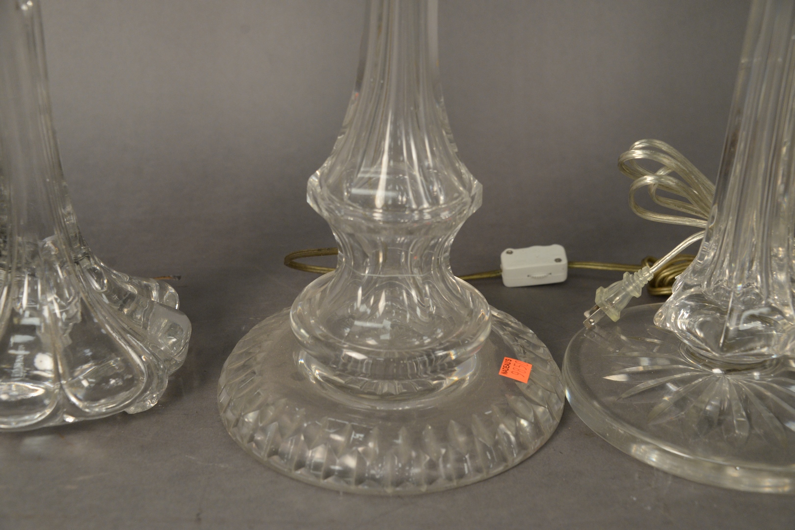 Three Piece Lot, to include a Baccarat crystal table lamp, marked to the underside along with two 19th century or later cut crystal table lamps, having two lights each, tallest overall 36 inches.