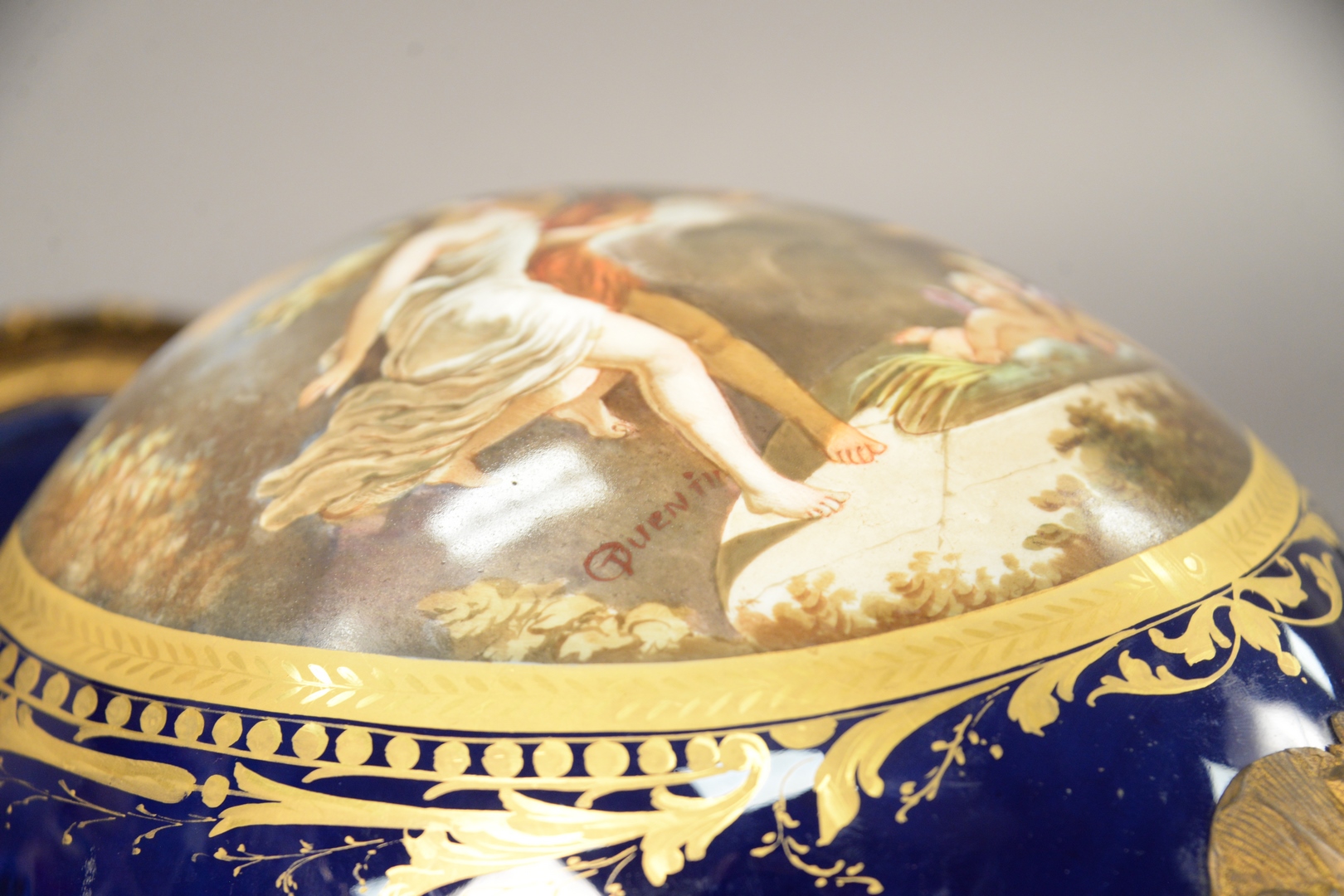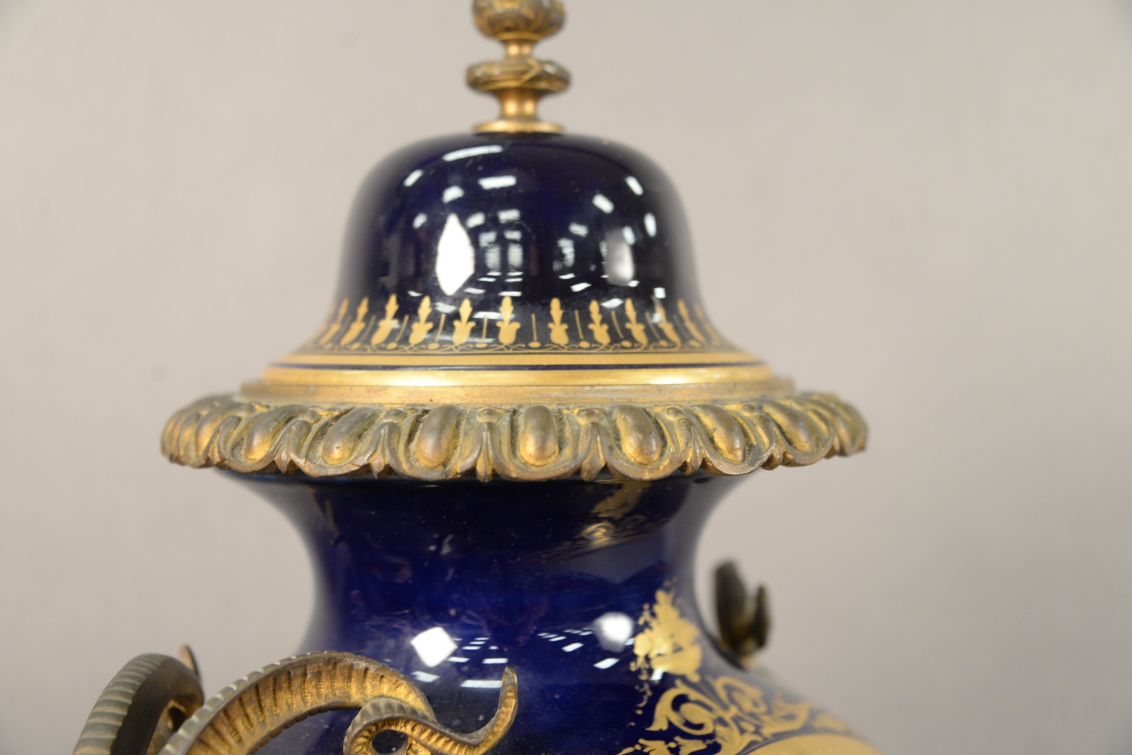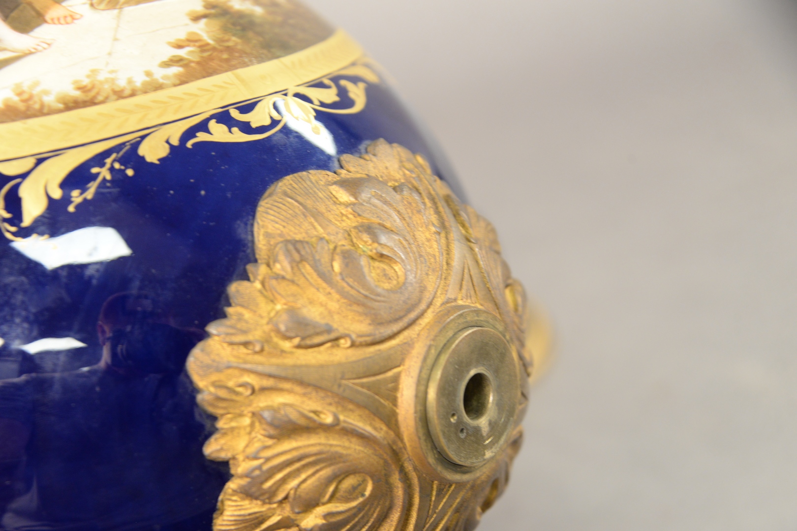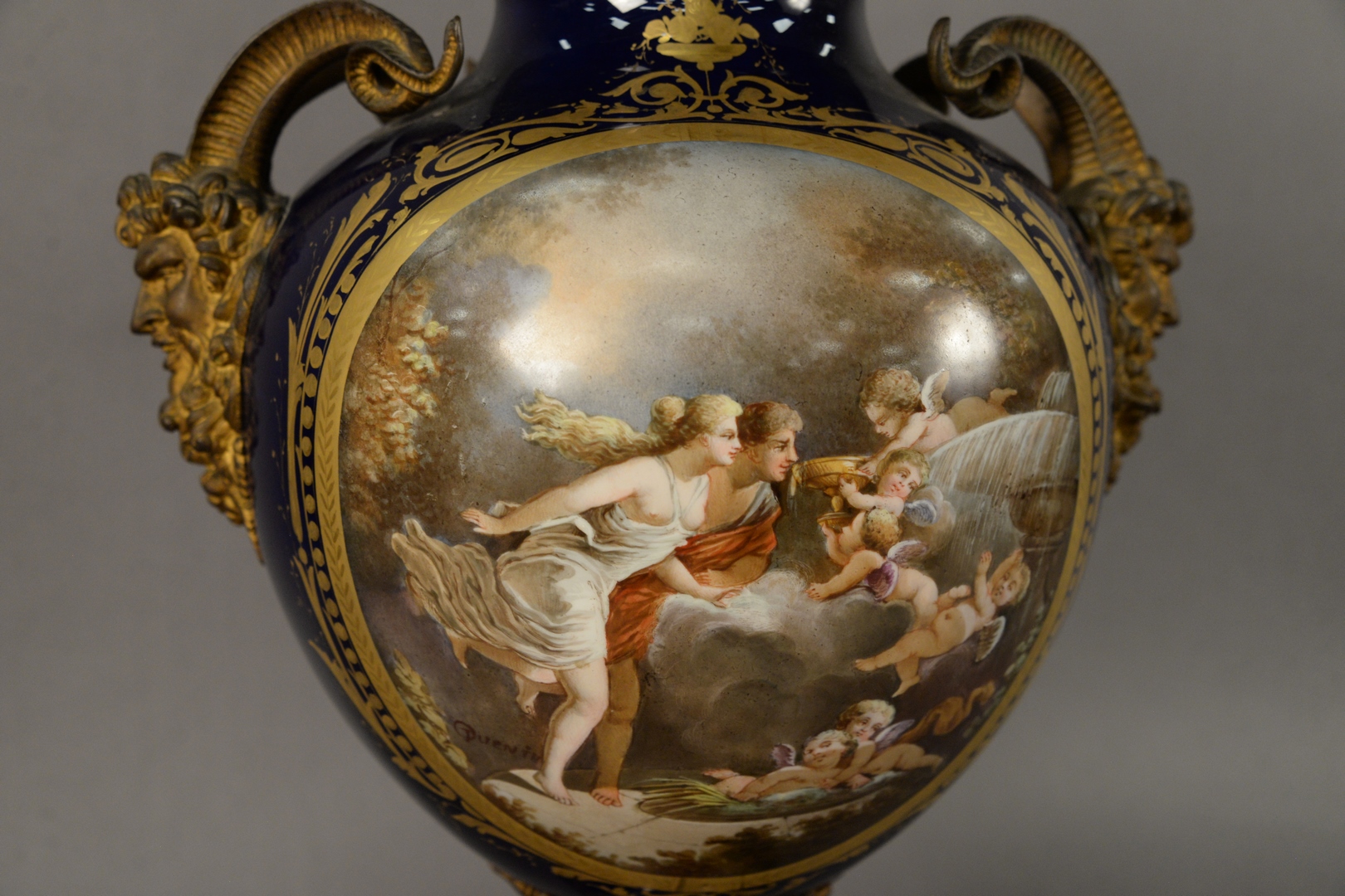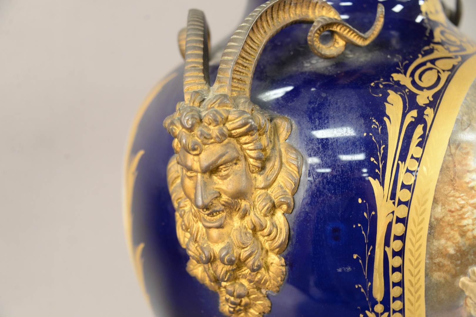 Large Sevres Covered Urn With Cover, having painted scene with puttis and gilt bronze Bacchus handles, overall height 24 inches.