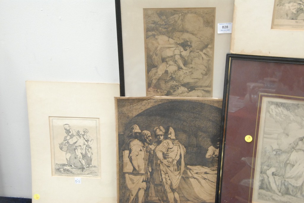 Lot 828: Mortimer seven etchings and prints drawn by Mortimer printed and etched by Blyth Delm etc.