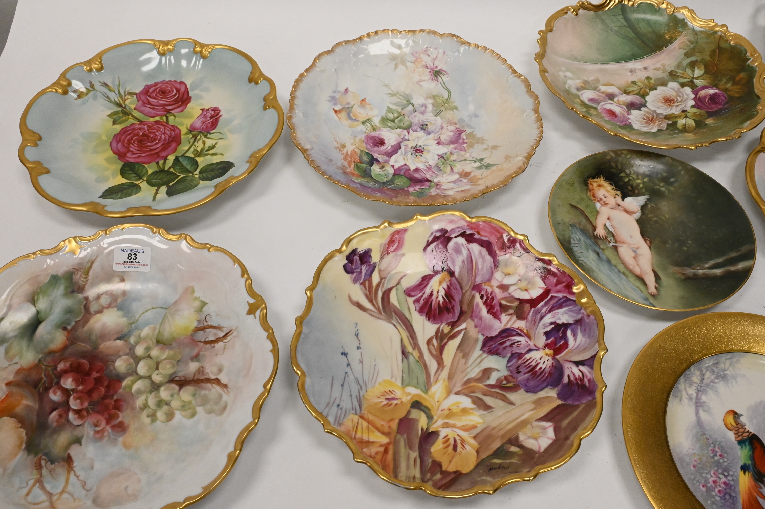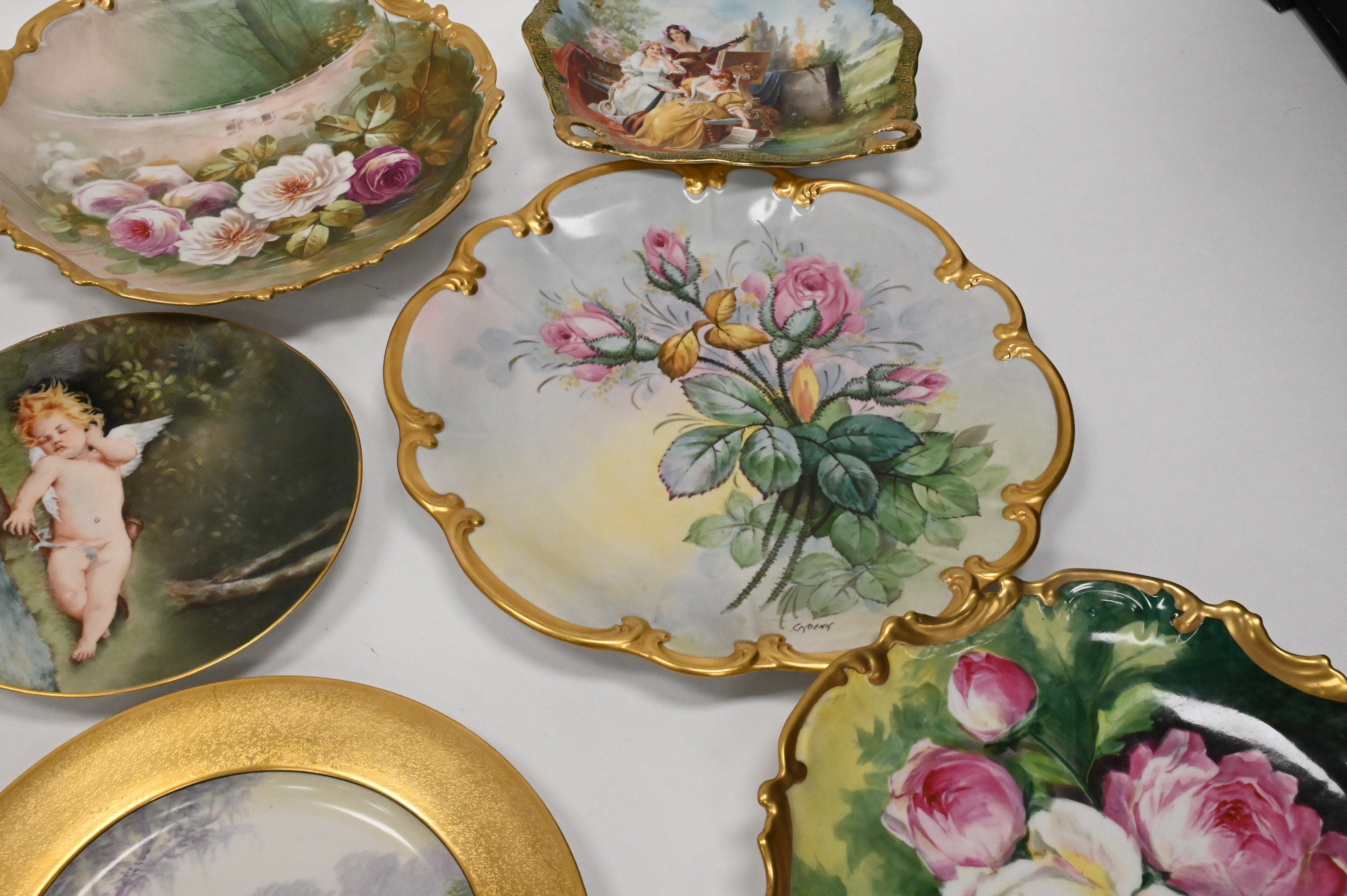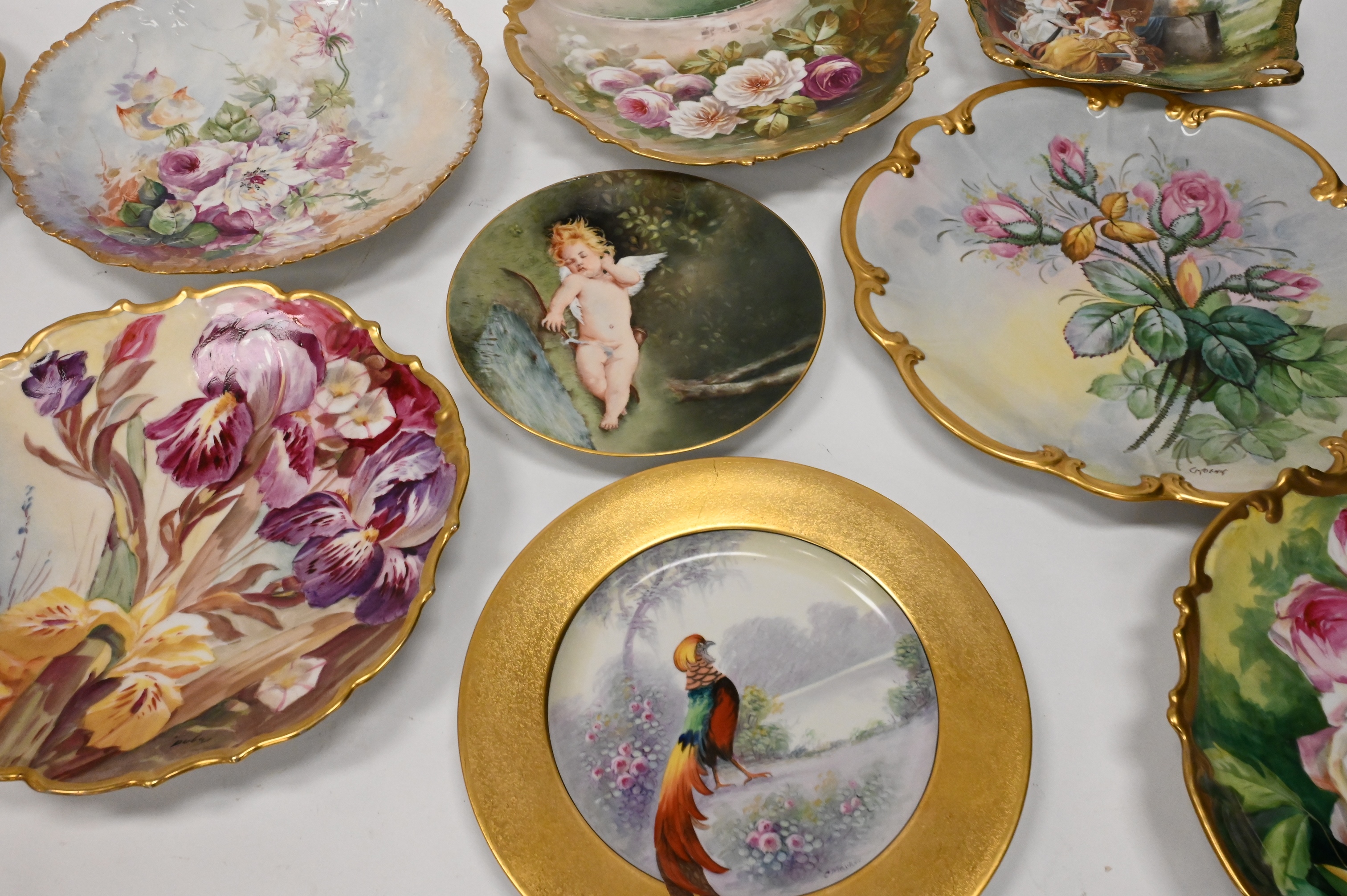 10 Piece Hand Painted Porcelain Plates, to include Limoges, Bavaria Tirschenreuth, Reichenbach, and Pickard, some signed, largest diameter 14 1/2 inches.
