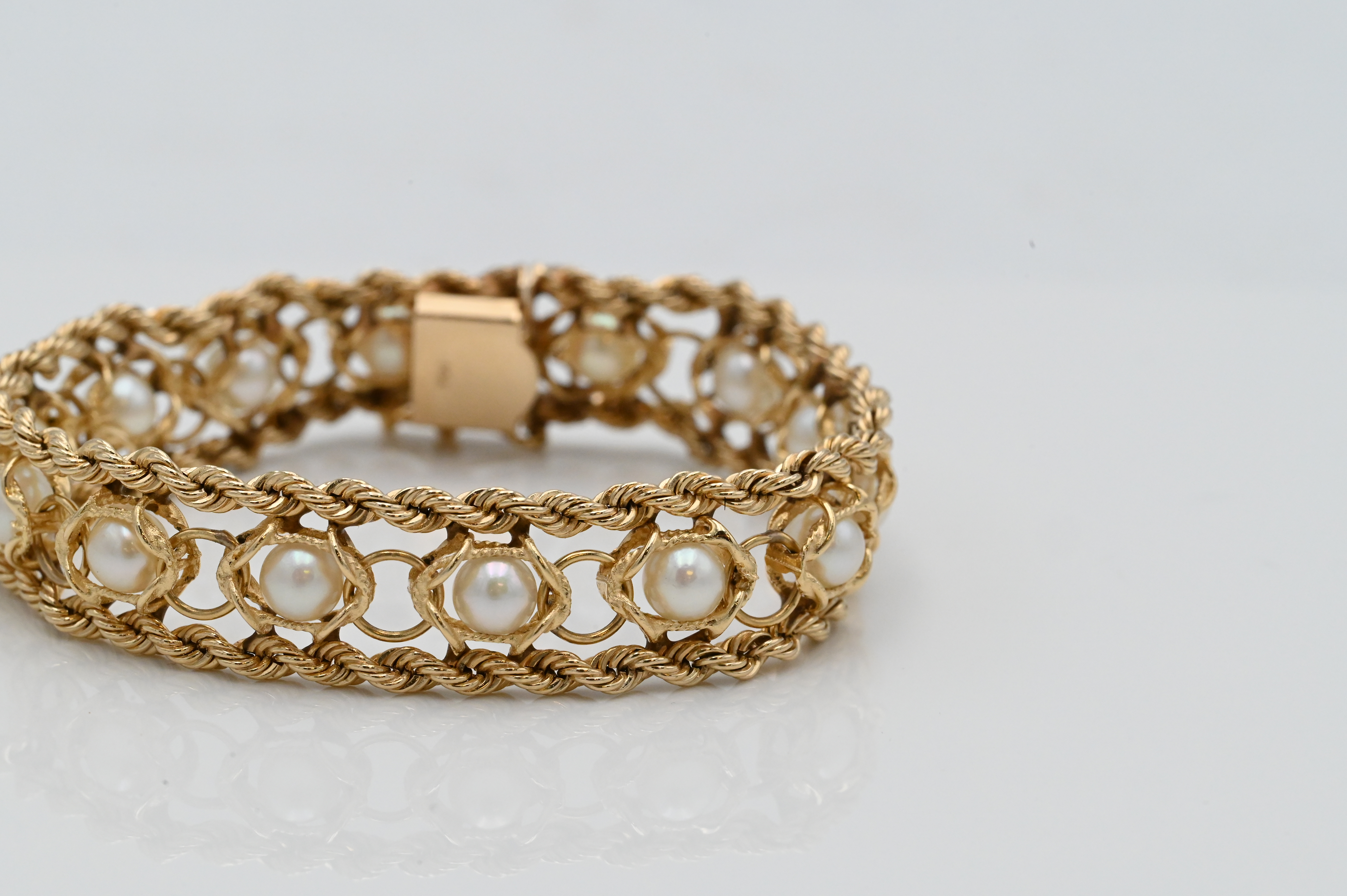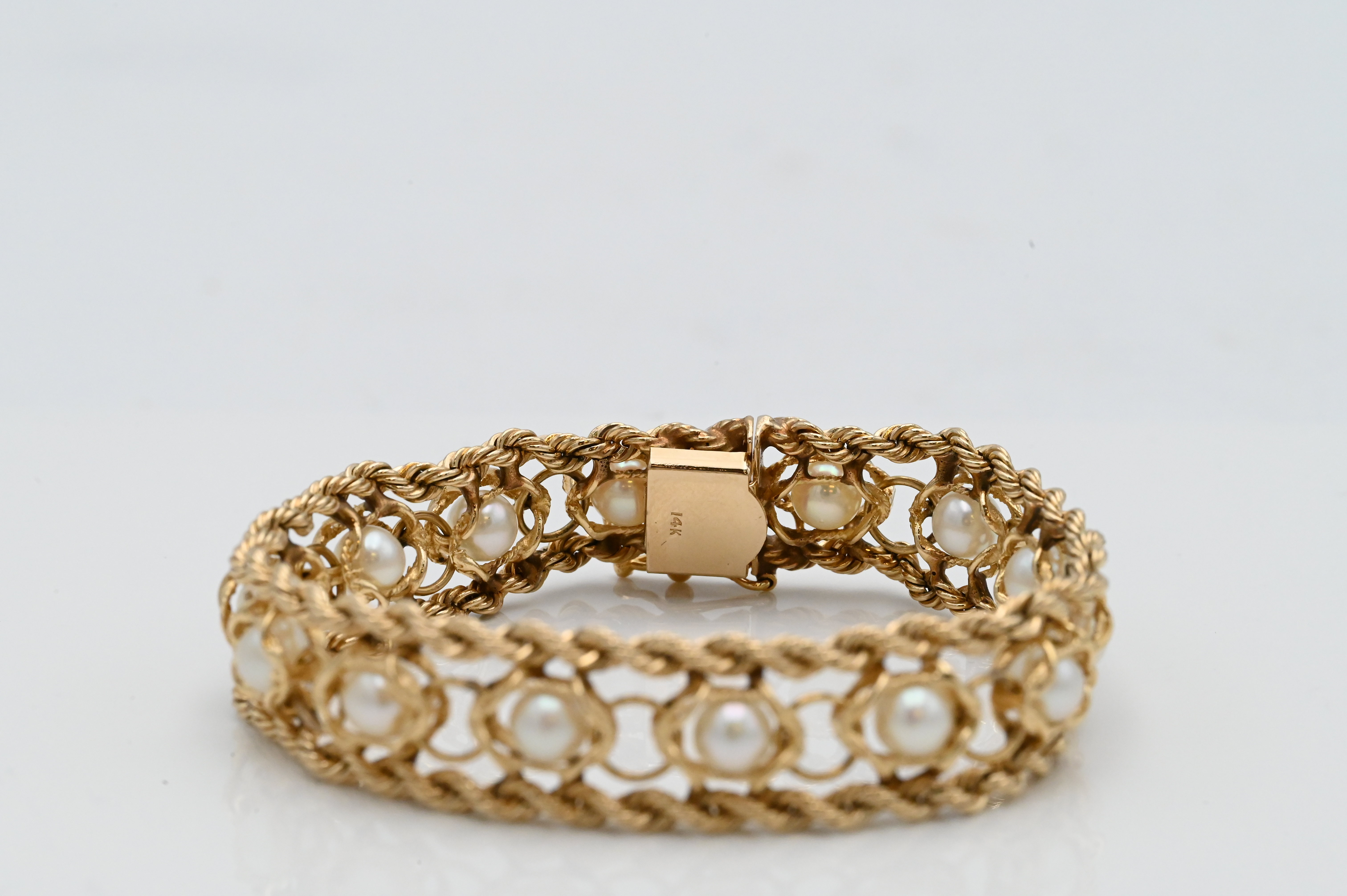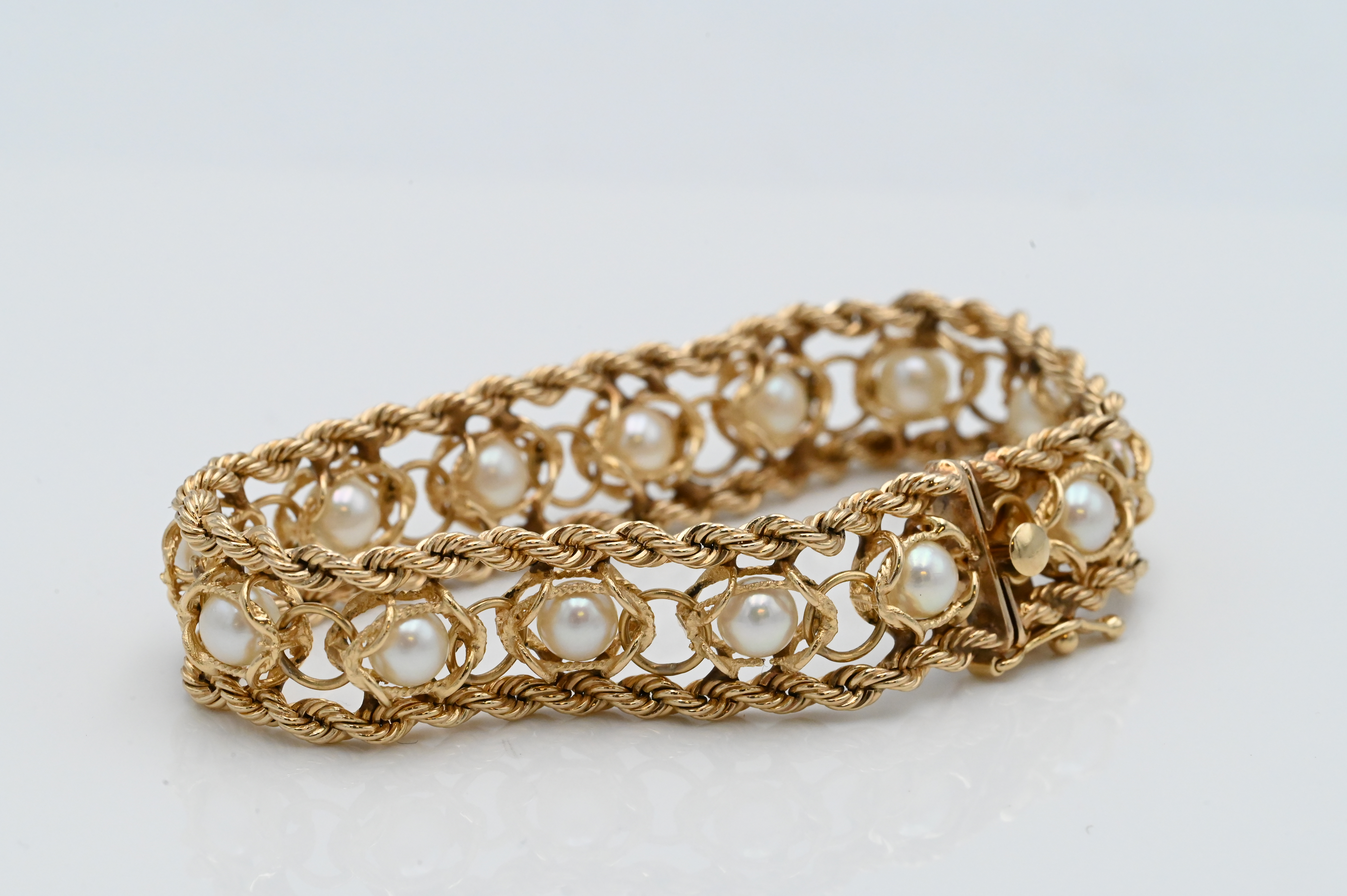 14 Karat Yellow Gold Bracelet, set with centered pearls, length 7 inches, 29 grams.