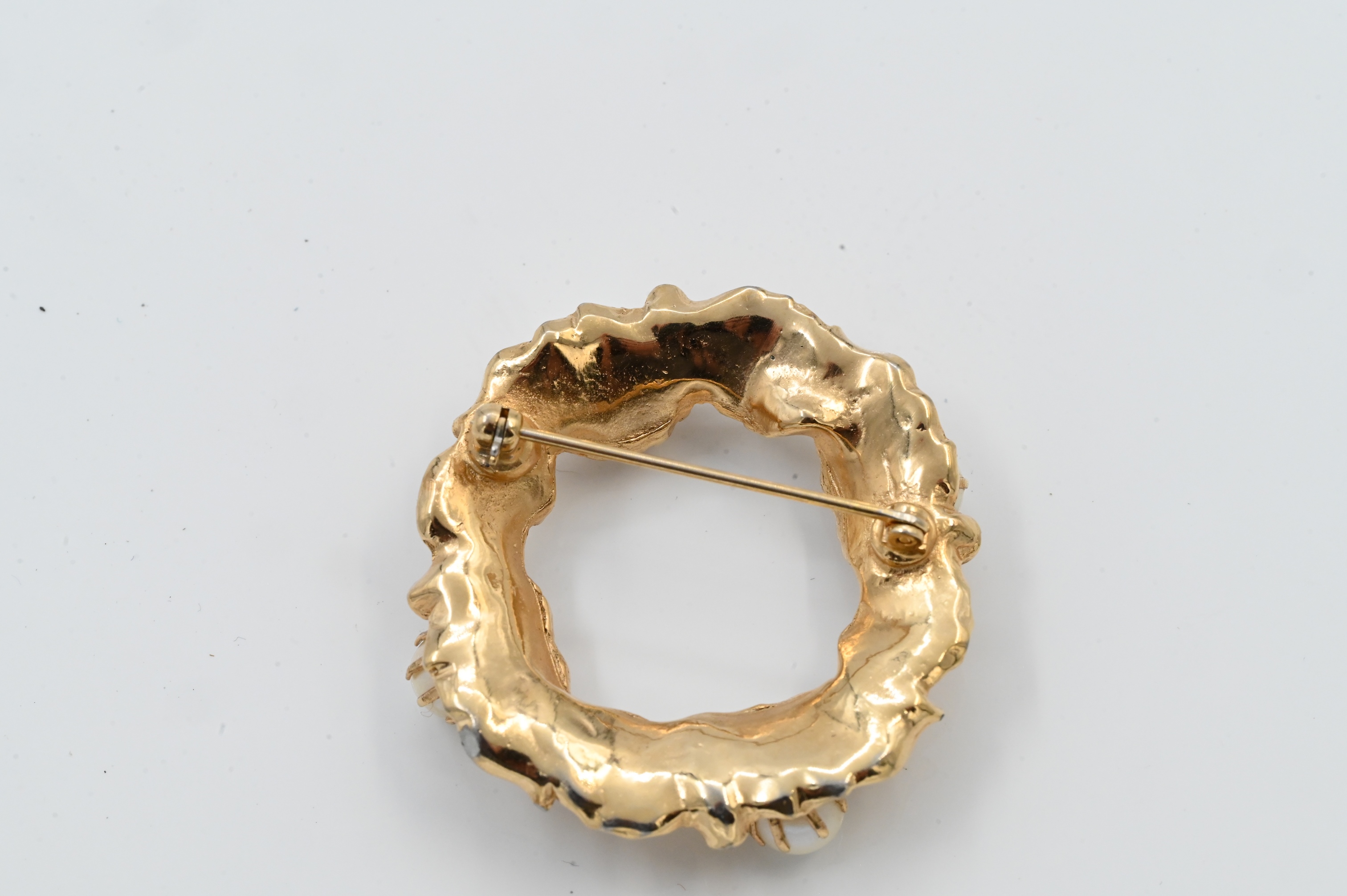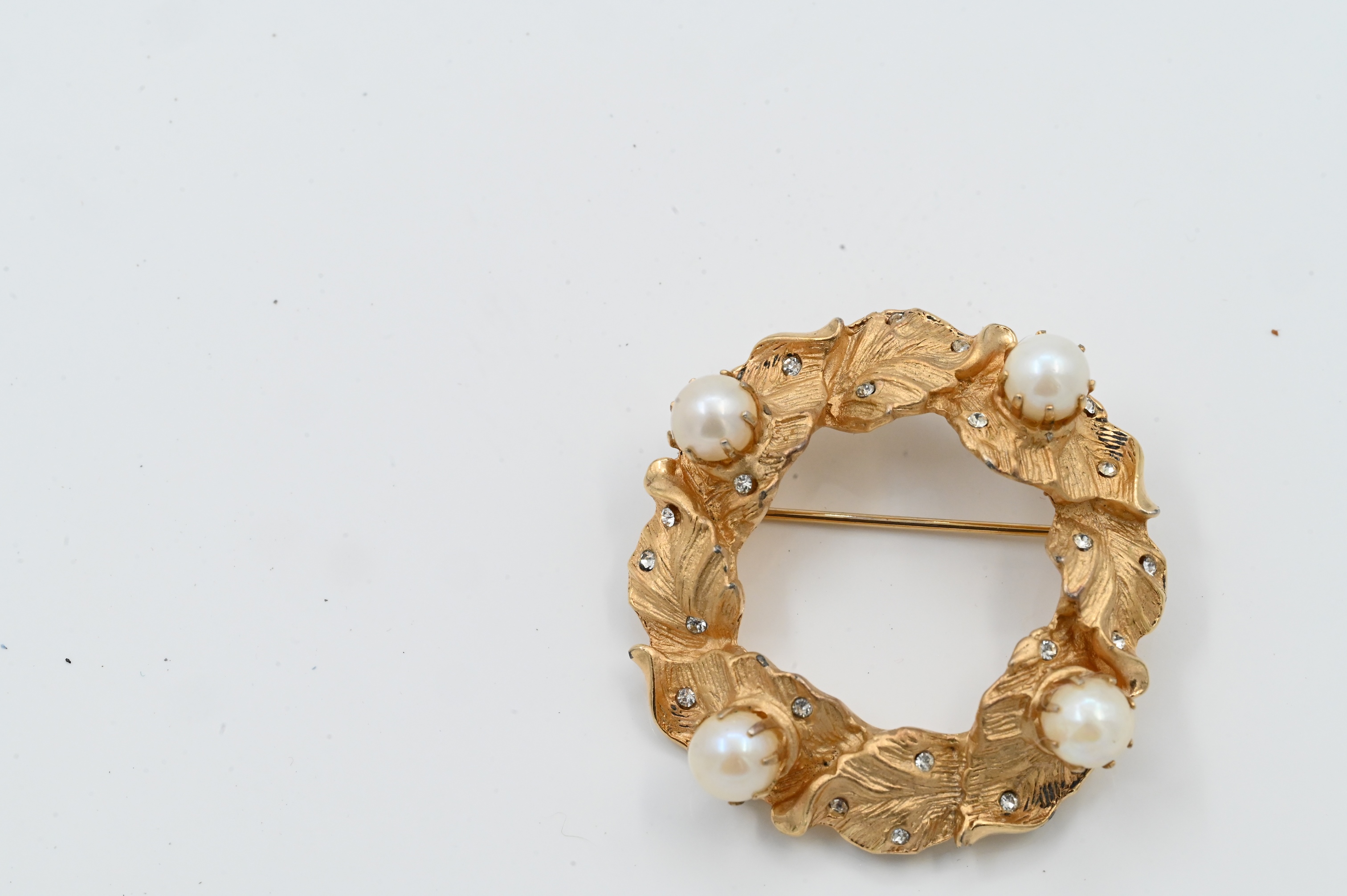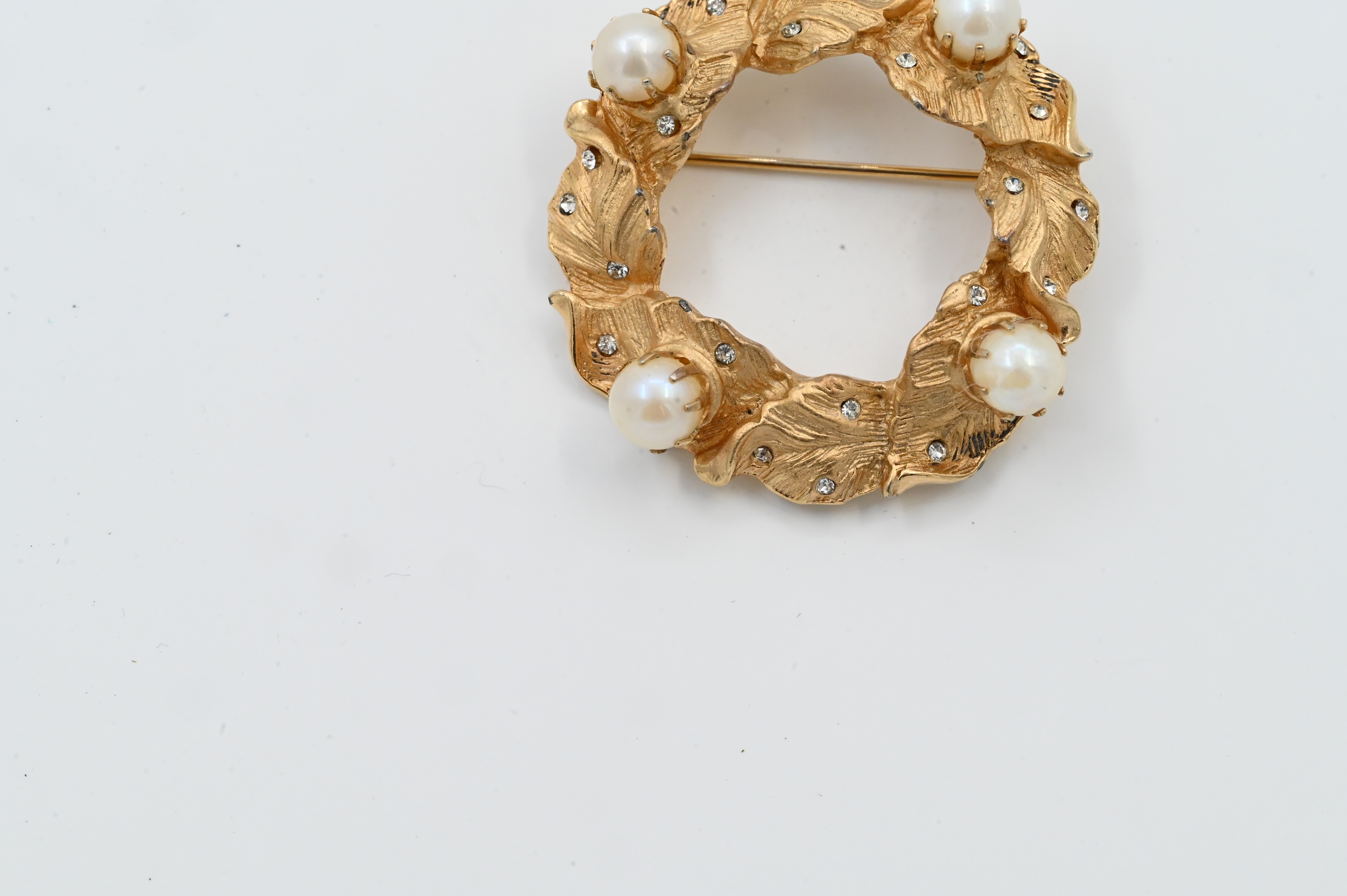 in the form of a wreath set with four large round pearls and small diamonds throughout