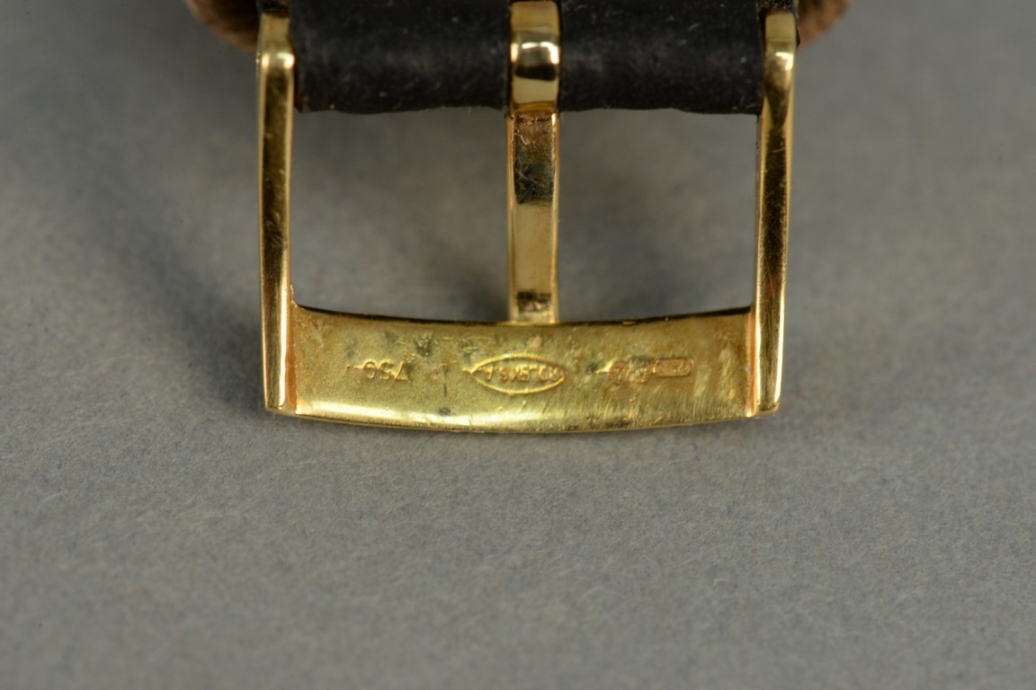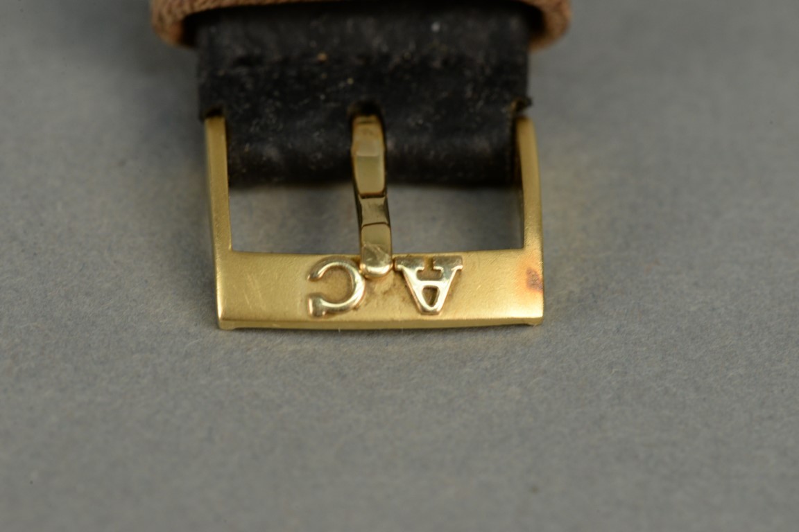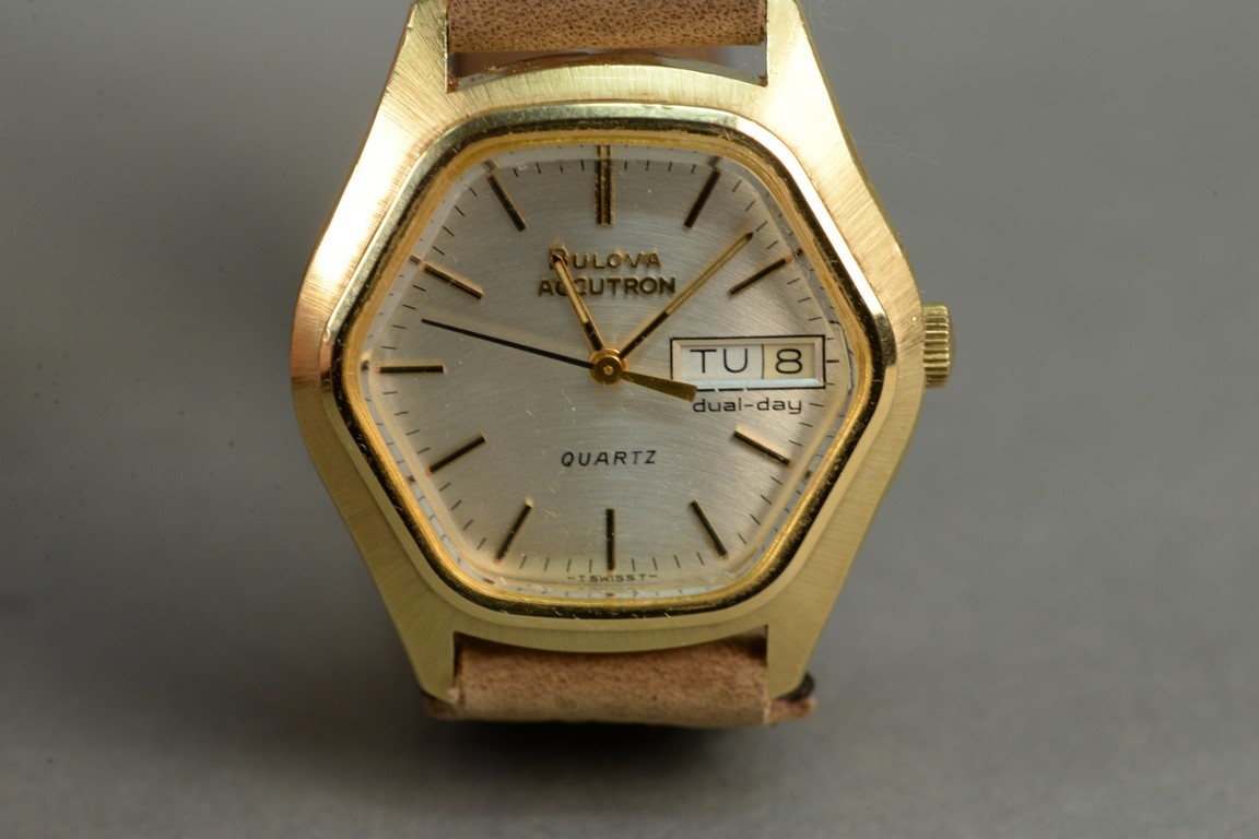 Bulova 14K gold Accutron mens wristwatch, octagon with leather band and gold buckle.