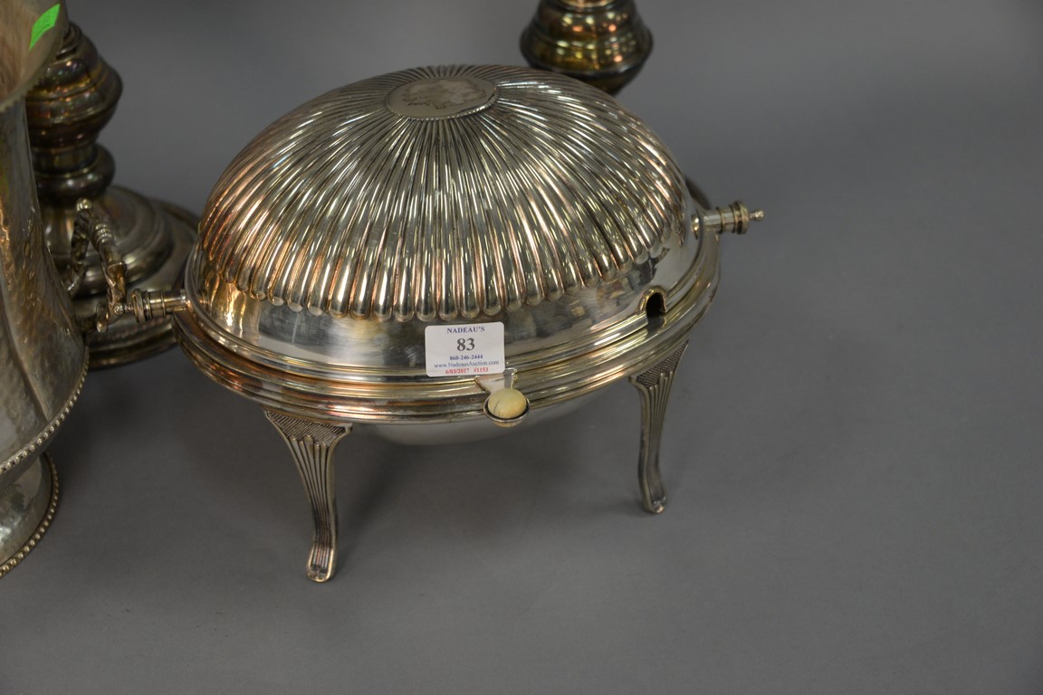 Lot 83: Collection of five silverplated items to include three large candlesticks ht. 21in., revolving tureen ht. 9in., and a hand hamme…