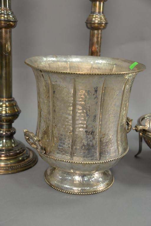 Collection of five silverplated items to include three large candlesticks ht. 21in., revolving tureen ht. 9in., and a hand hammered wine bucket ht. 11in..